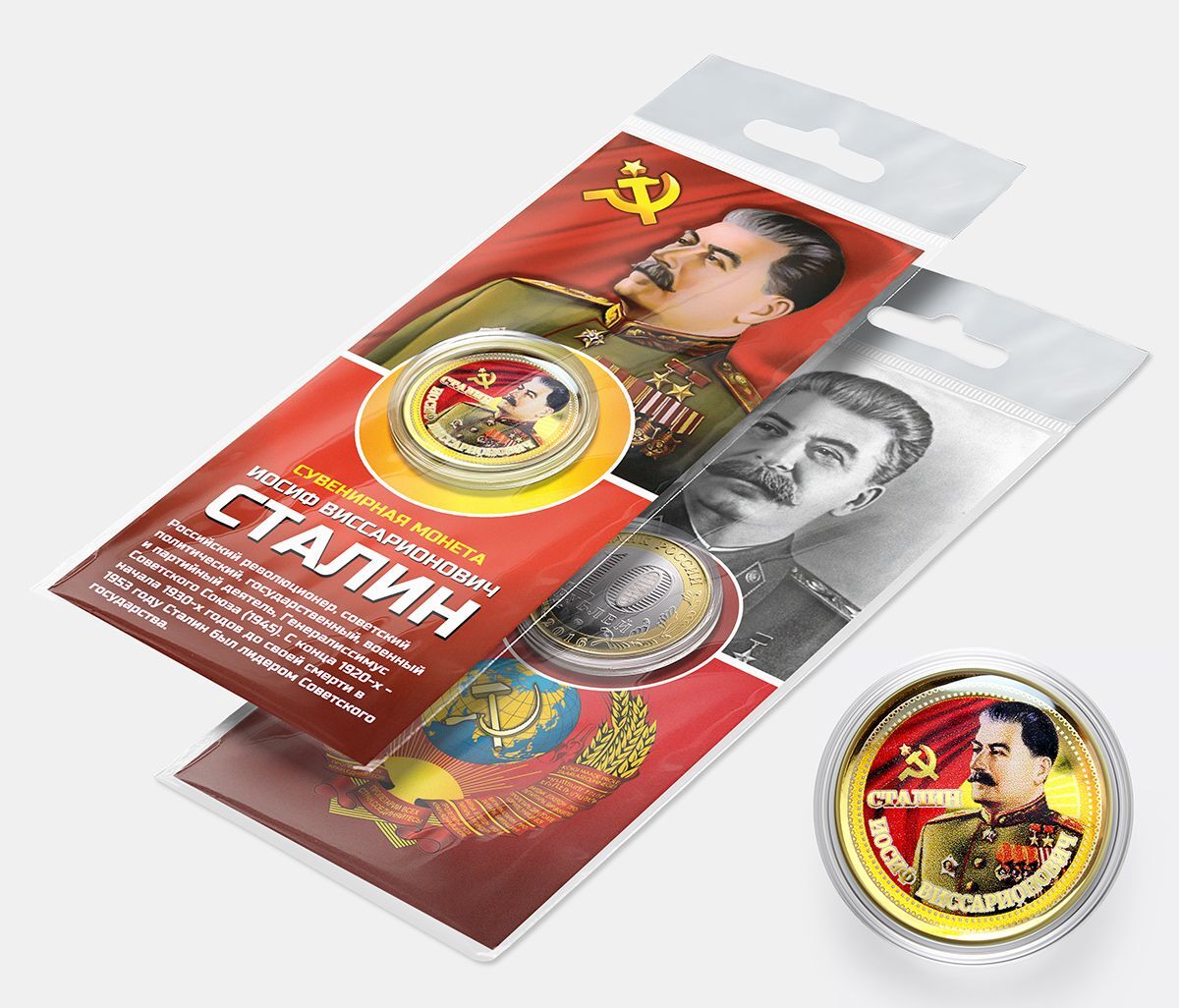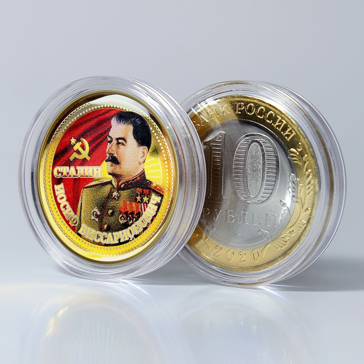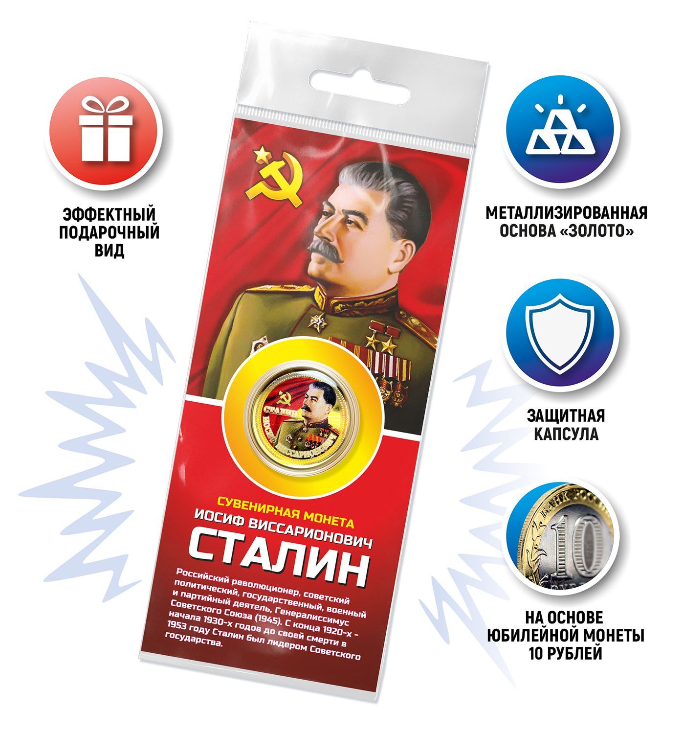 Комплектация:Сувенирная монета в капсуле и открытке, 1 шт.Описание:Коллекционная монета "Известные личности" в подарочном оформлении Иосиф Сталин, изготовленная на основе редкой юбилейной монеты 10 рублей, в авторском исполнении с объемным покрытием - это