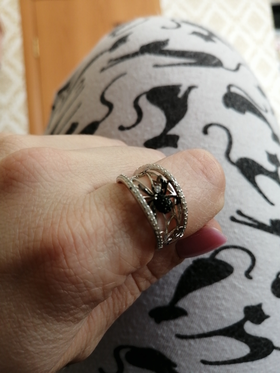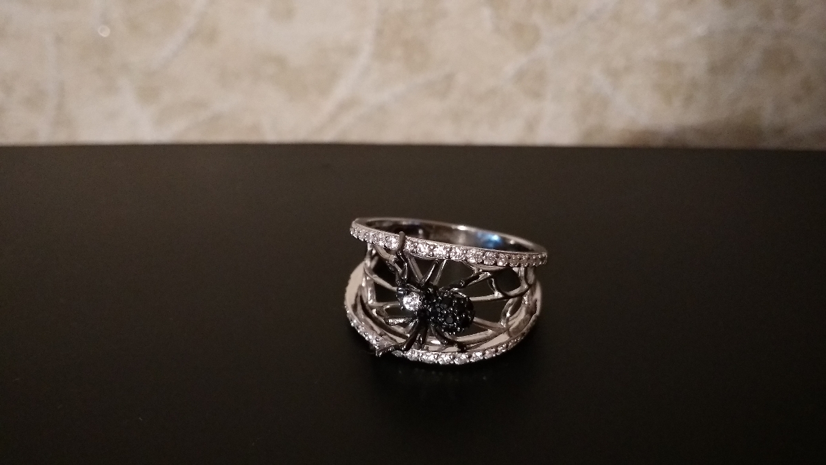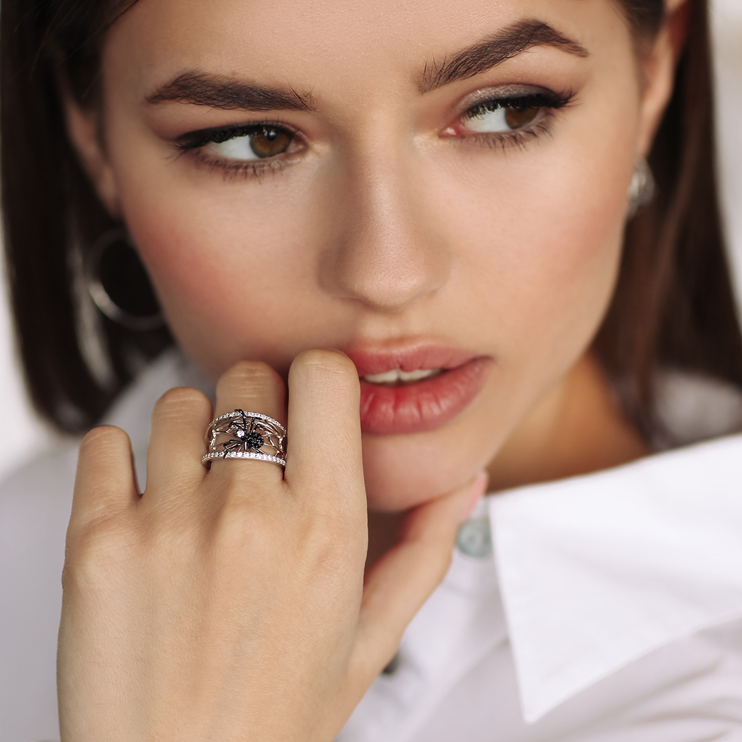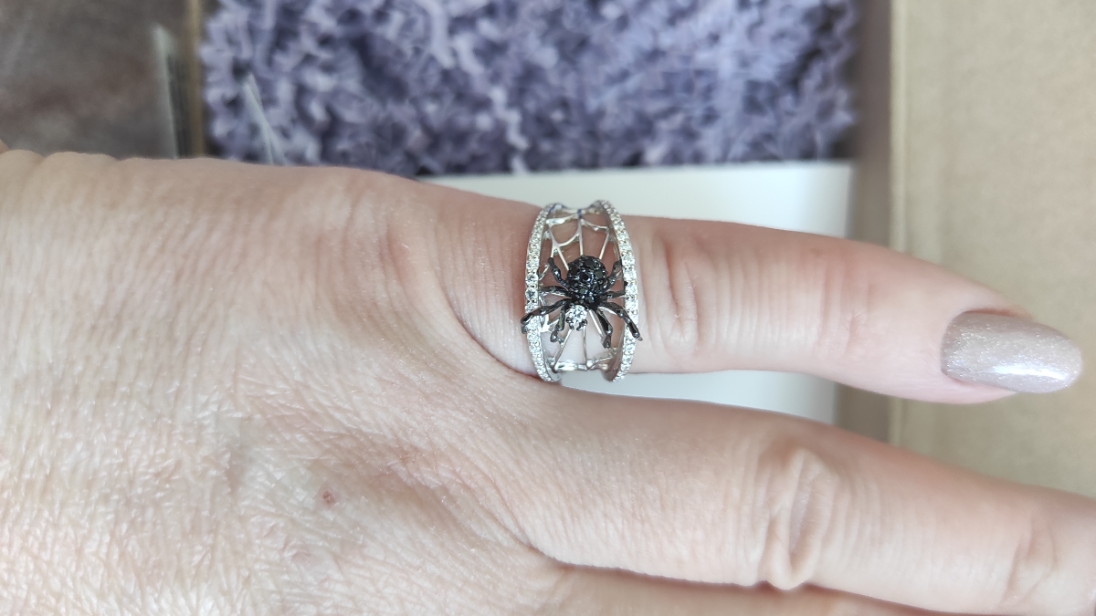 Оригинальное эффектное кольцо с декоративной частью в форме паука на паутине выполнено из серебра 925 пробы со вставкой шпинель черная синтетическая и кубический цирконий. Покрытие - белый и черный родий. Высота кольца 12 мм. Размеры паука с ножками: 12x