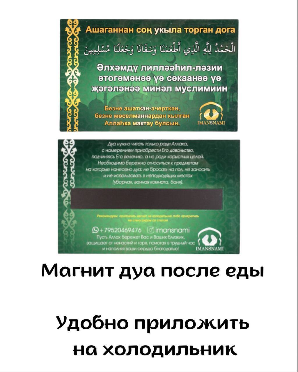 Уважаемые покупатели. Хотим предложить вам эксклюзивные карточки дуа. С 3мя разными молитвами.1. Карточка-магнит с дуа после еды.Удобно приложить магнит к холодильнику. Всегда будет на виду, поэтому вы никогда не забудете прочитать дуа после еды и быстро