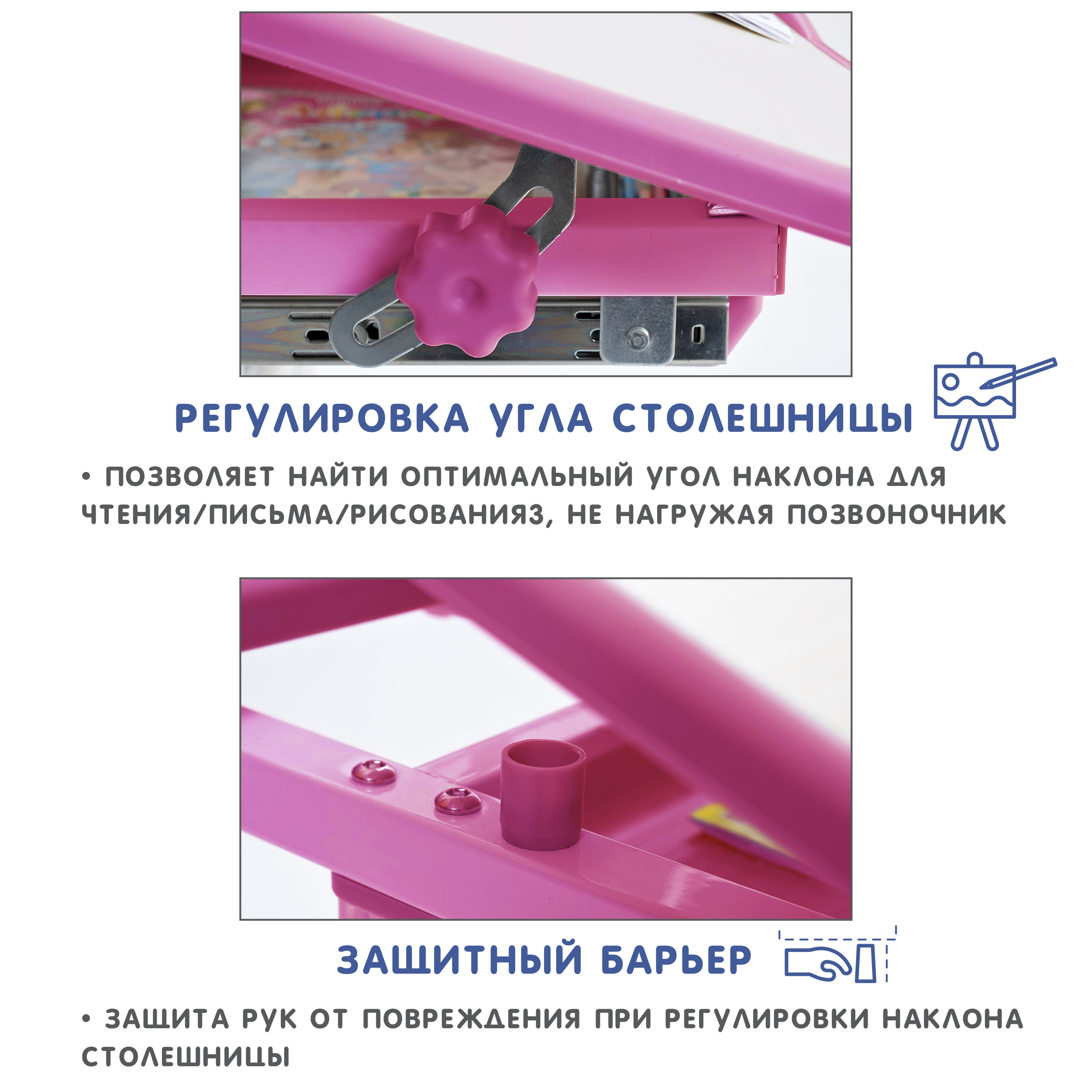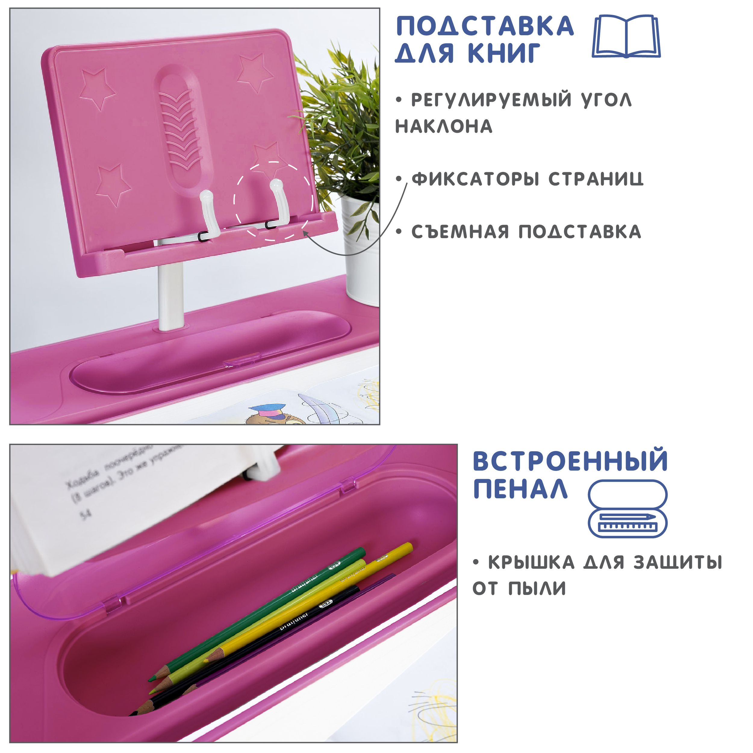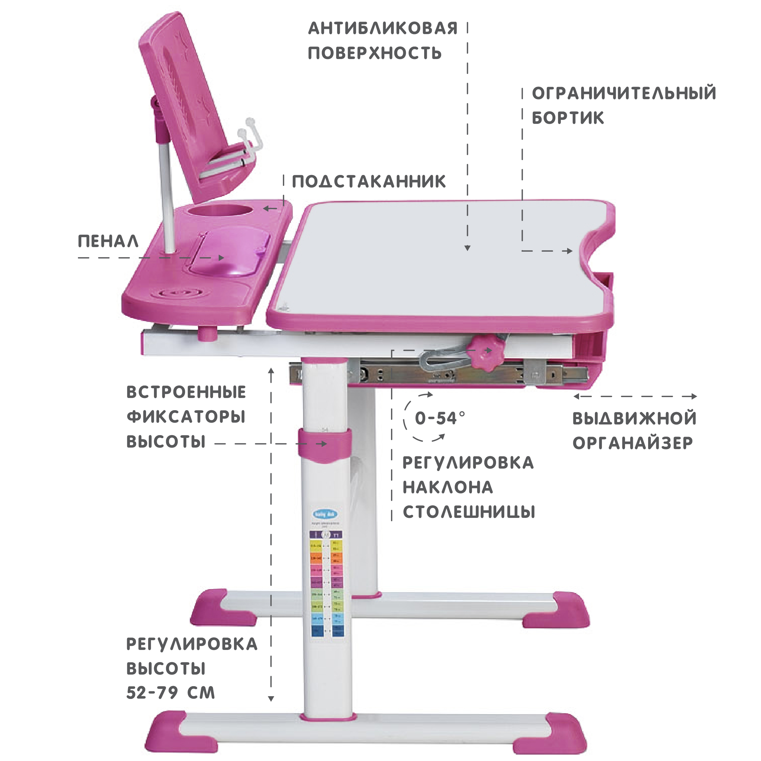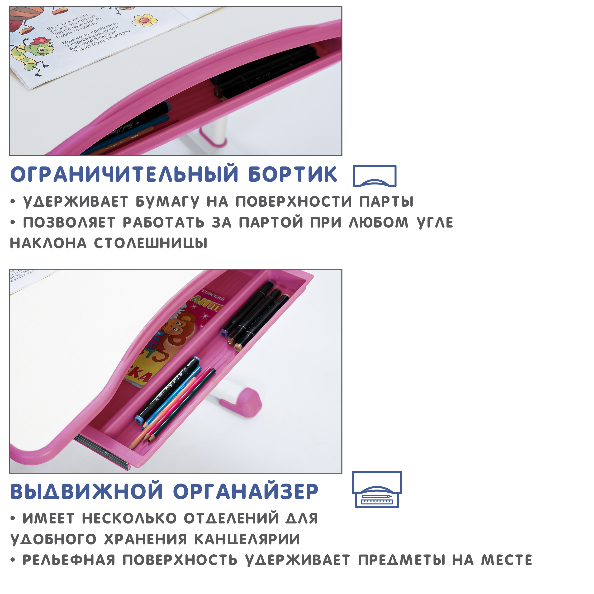 Особенности партыРегулировка угла наклона столешницы, Безопасные углы, Регулировка по высоте, Ростовая шкала, Антибликовая поверхность столешницы, Выдвижной пенал, Подставка для книги, Трансформация в мольберт