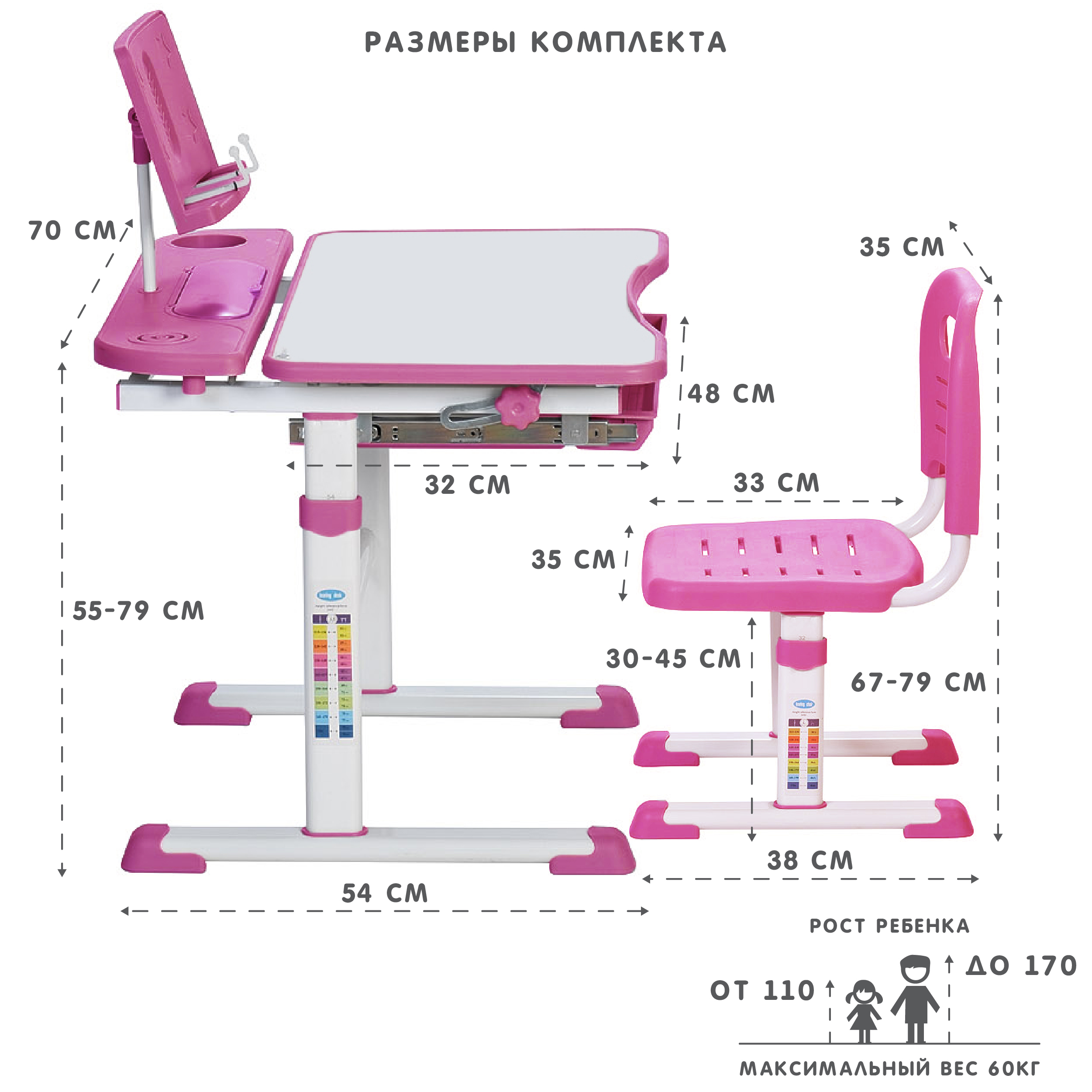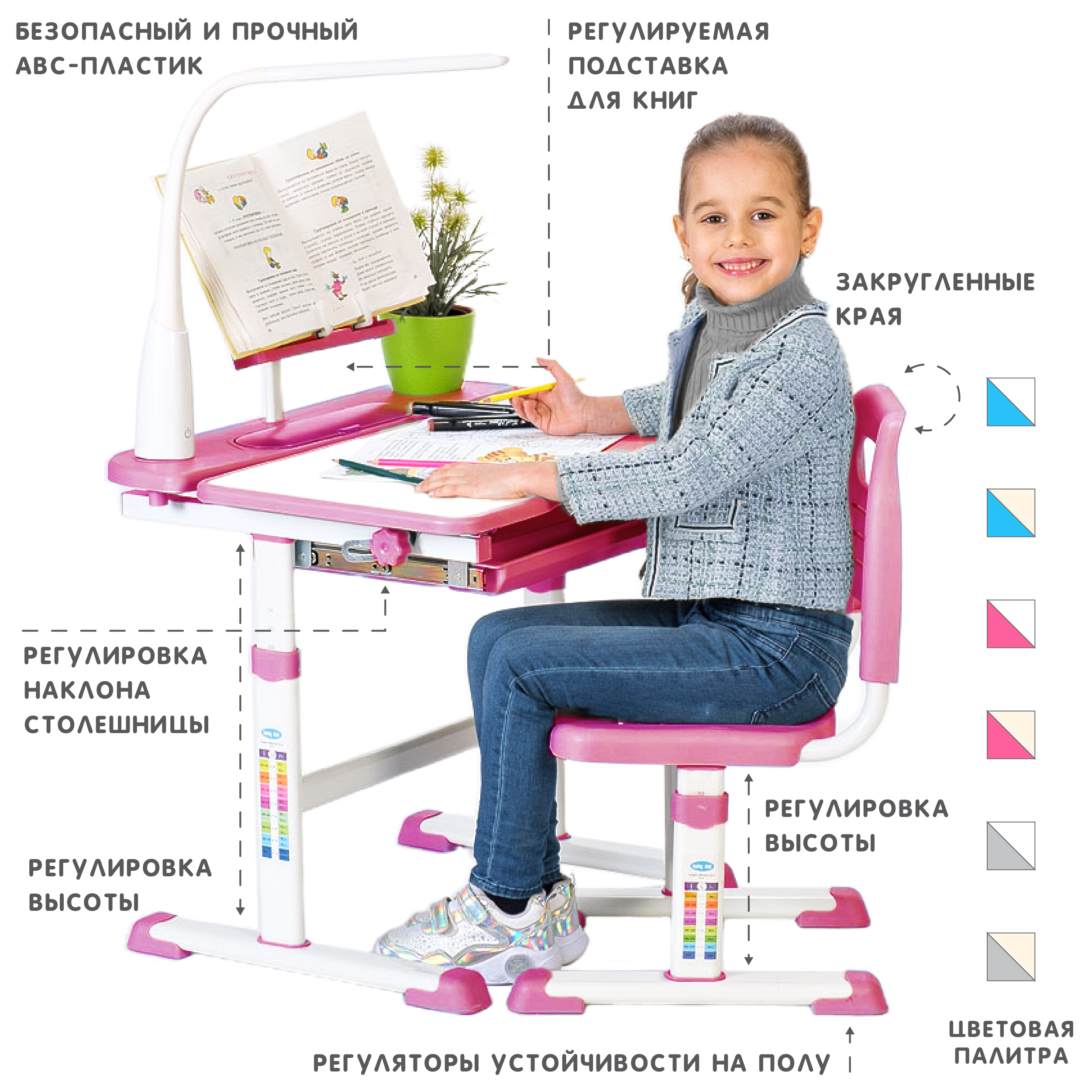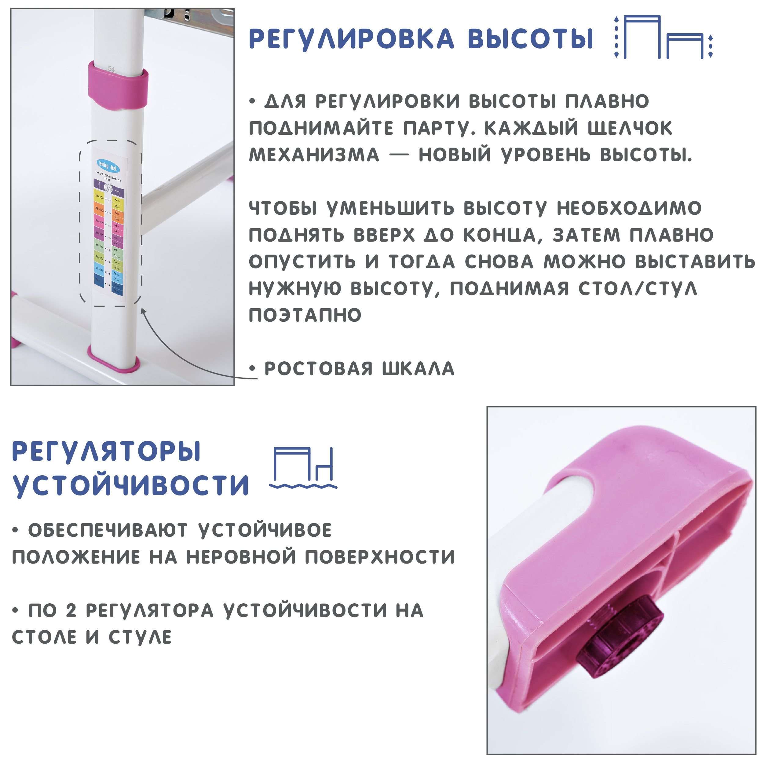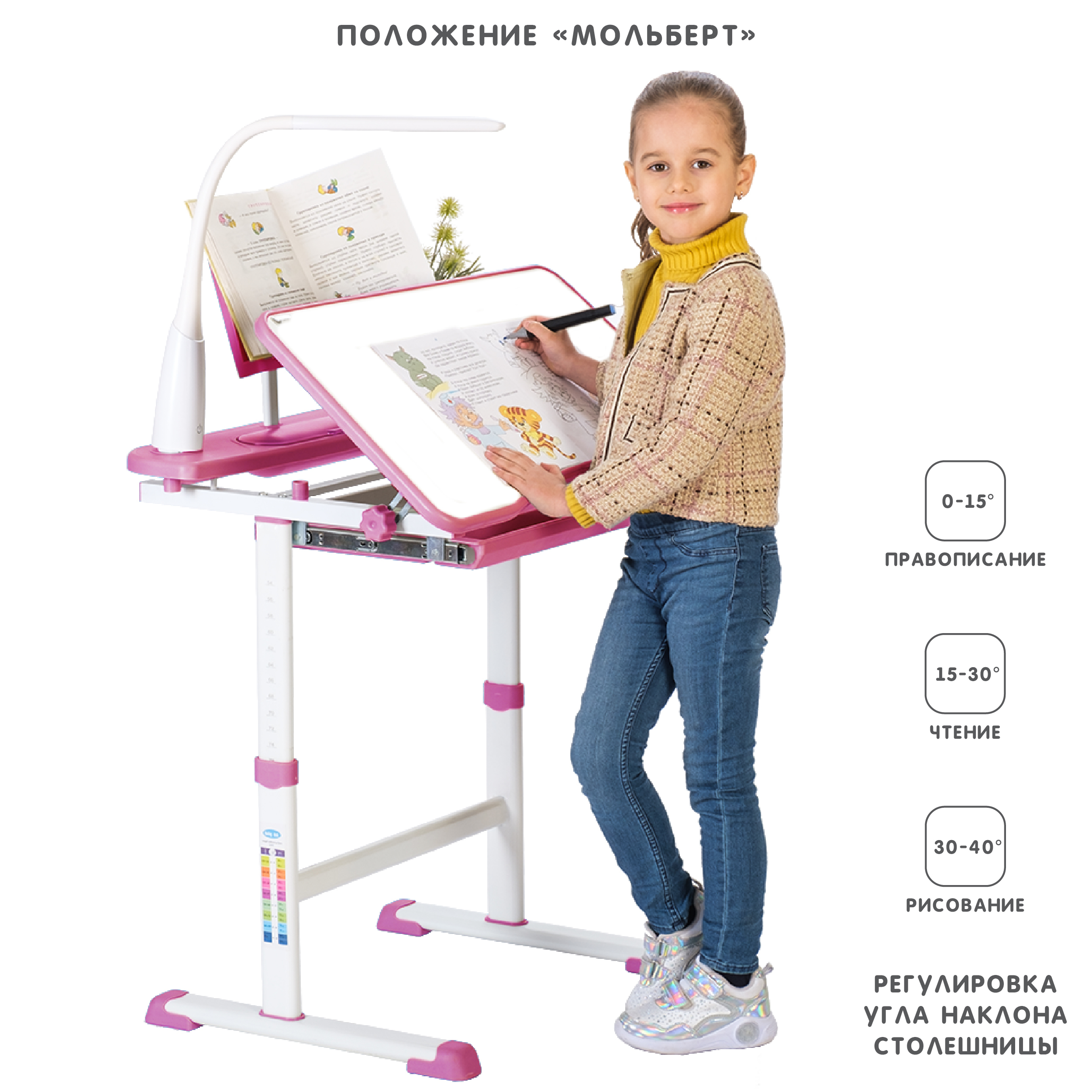 Особенности партыРегулировка угла наклона столешницы, Безопасные углы, Регулировка по высоте, Ростовая шкала, Антибликовая поверхность столешницы, Выдвижной пенал, Подставка для книги, Трансформация в мольберт