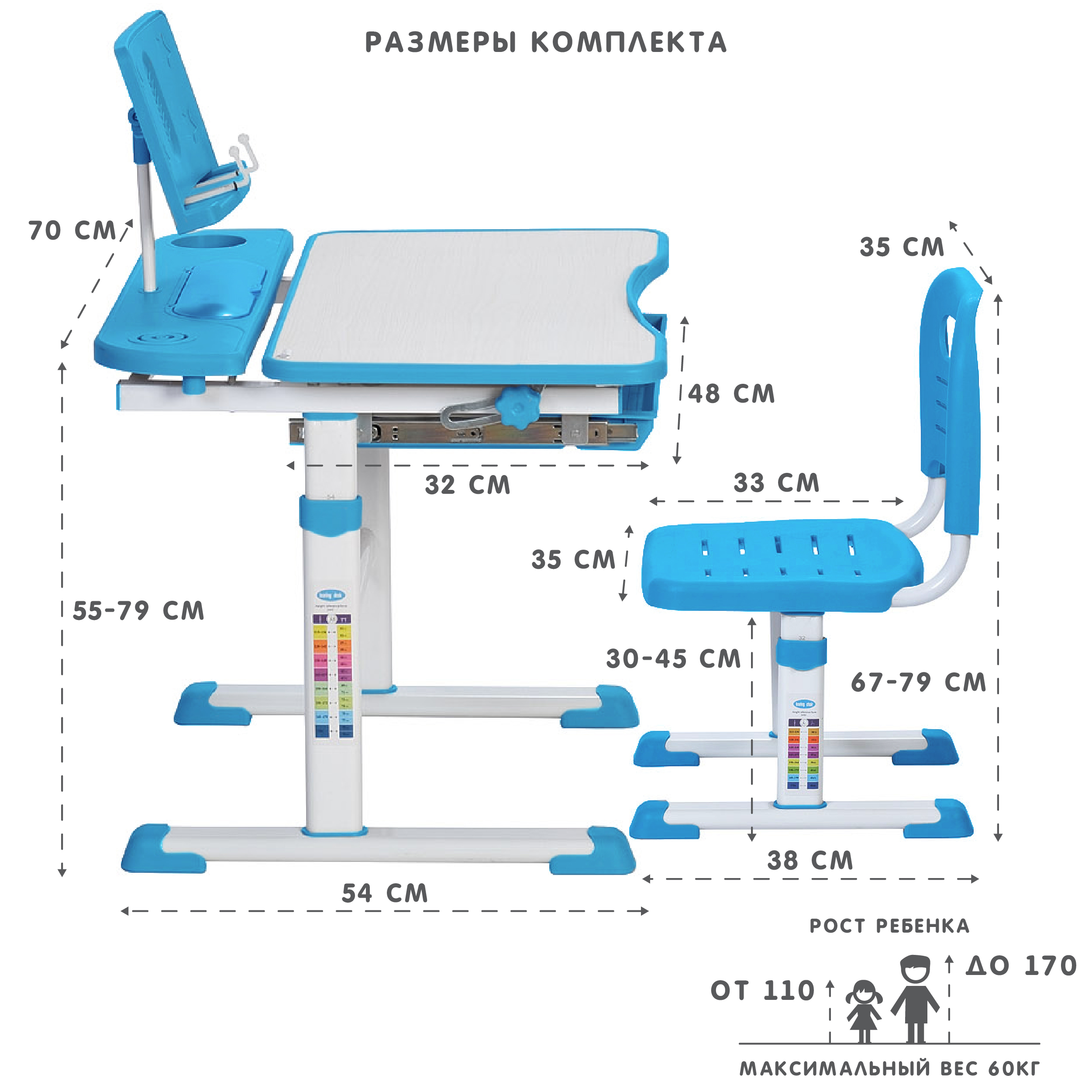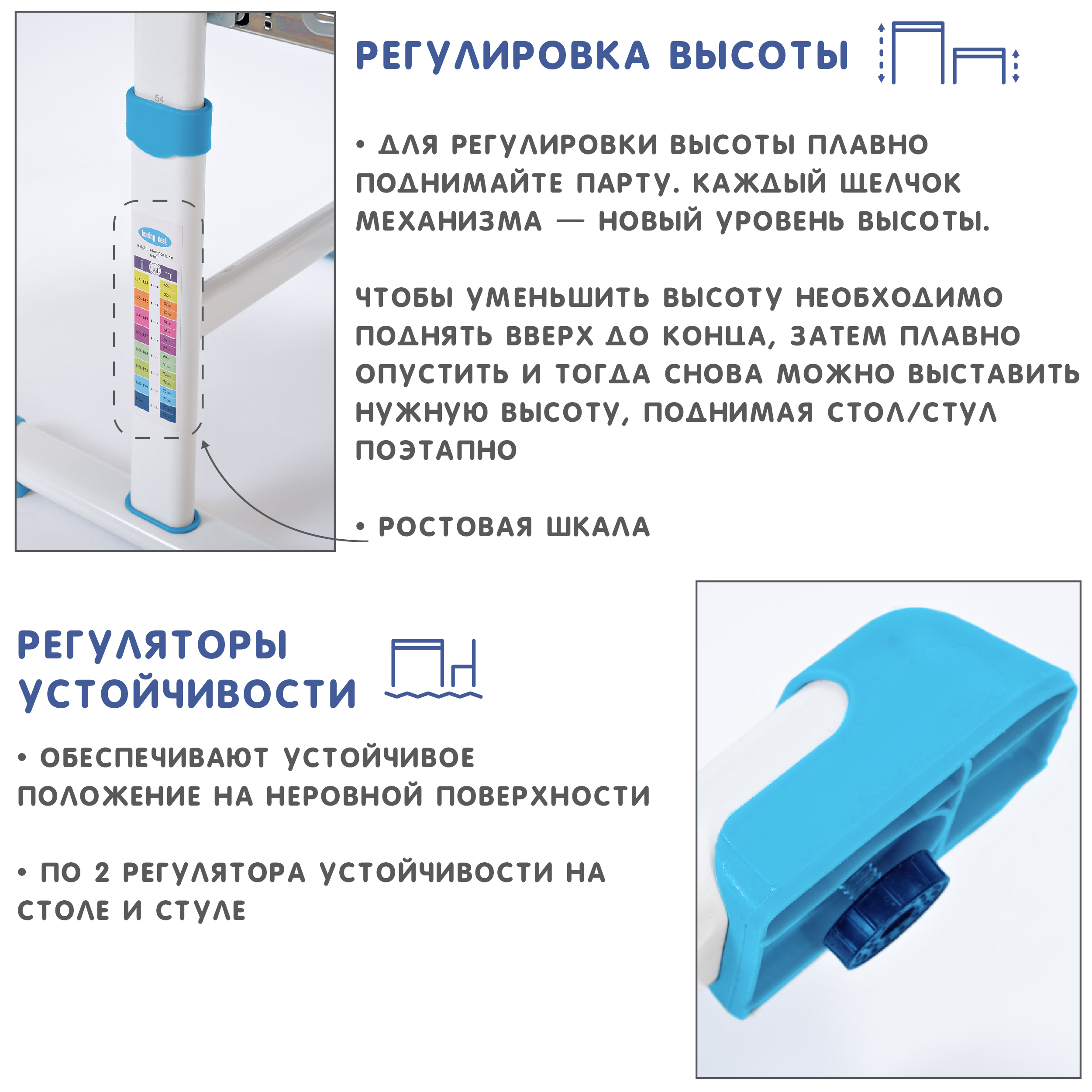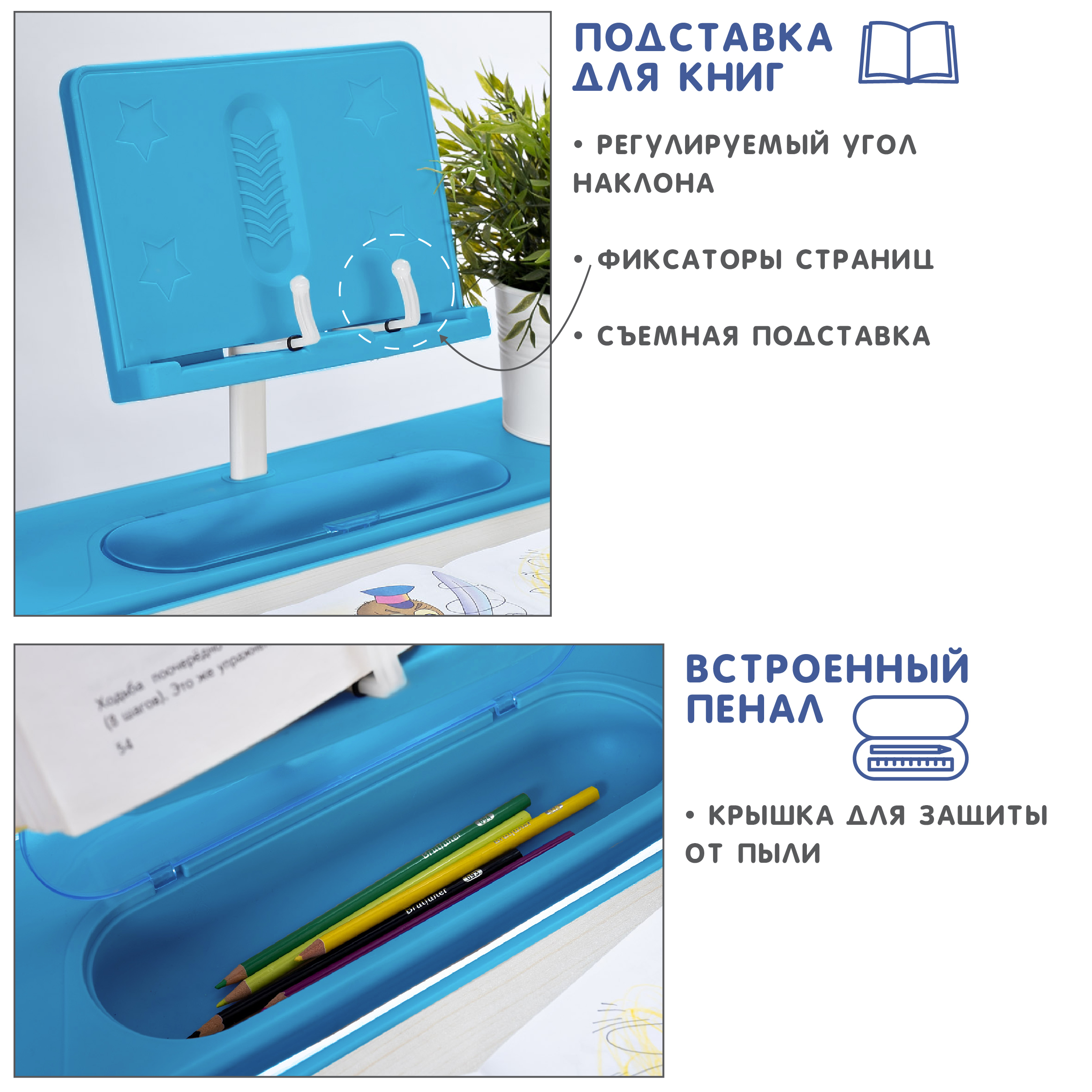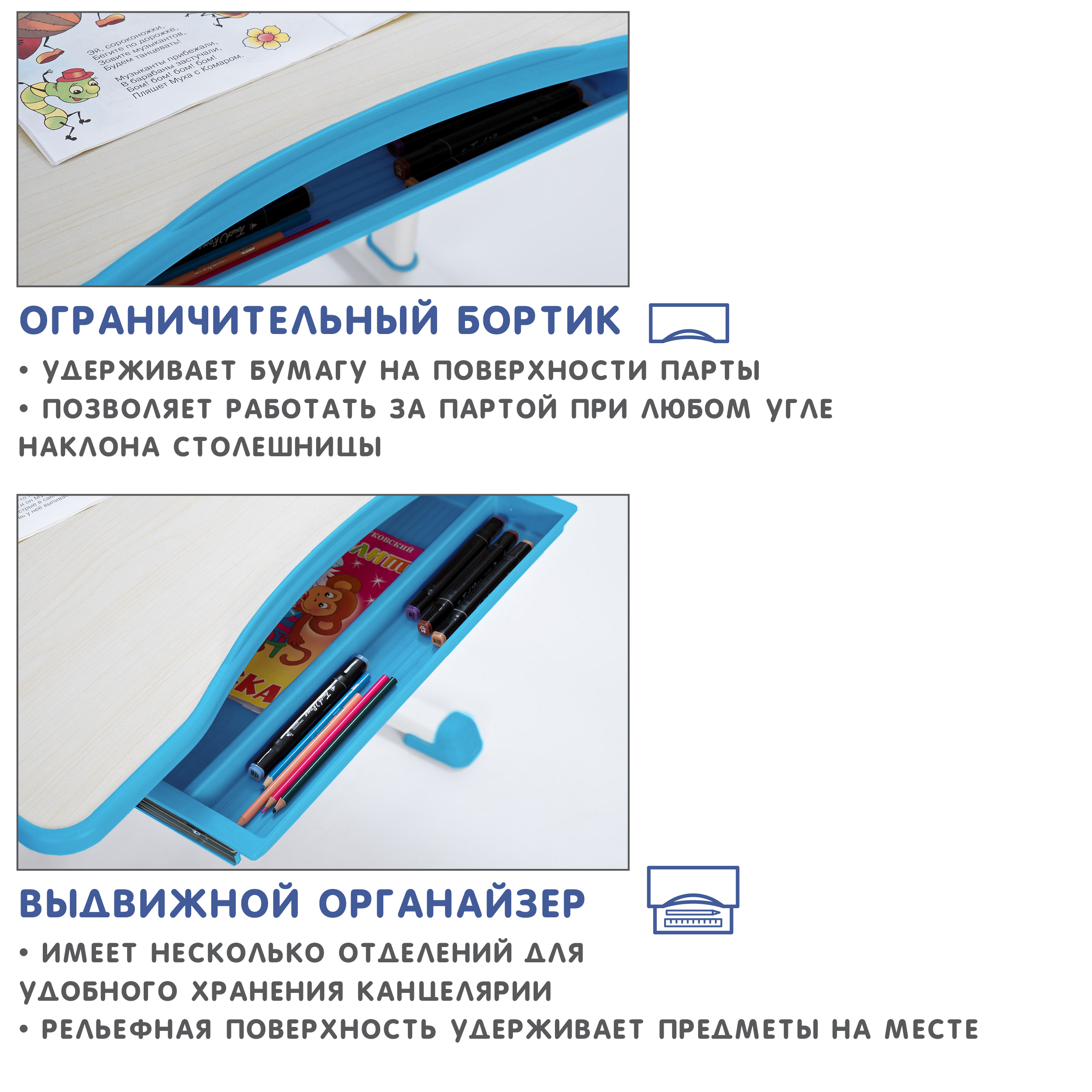 Особенности партыРегулировка угла наклона столешницы, Безопасные углы, Регулировка по высоте, Ростовая шкала, Антибликовая поверхность столешницы, Выдвижной пенал, Подставка для книги, Трансформация в мольберт
