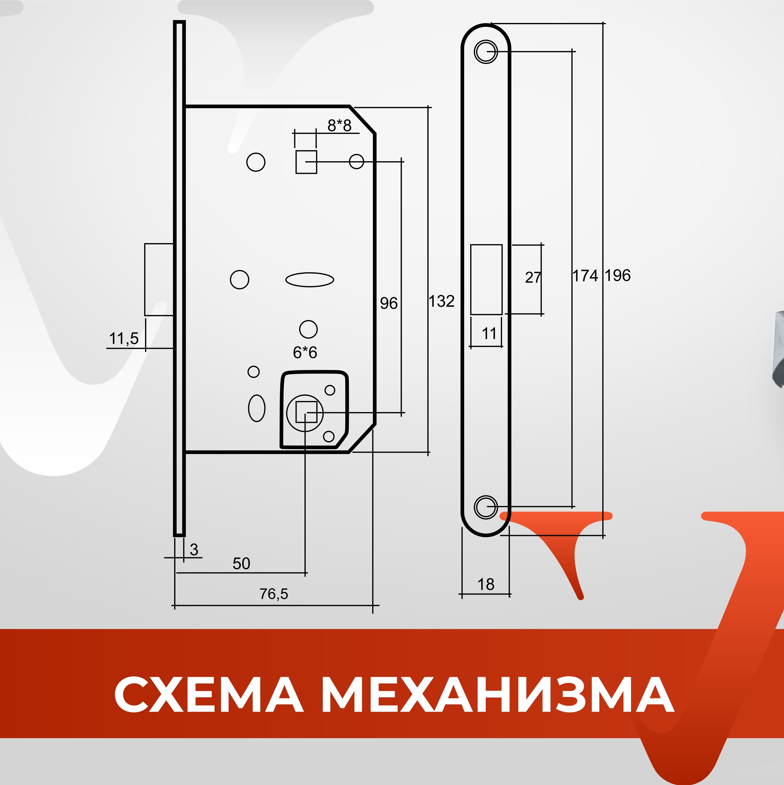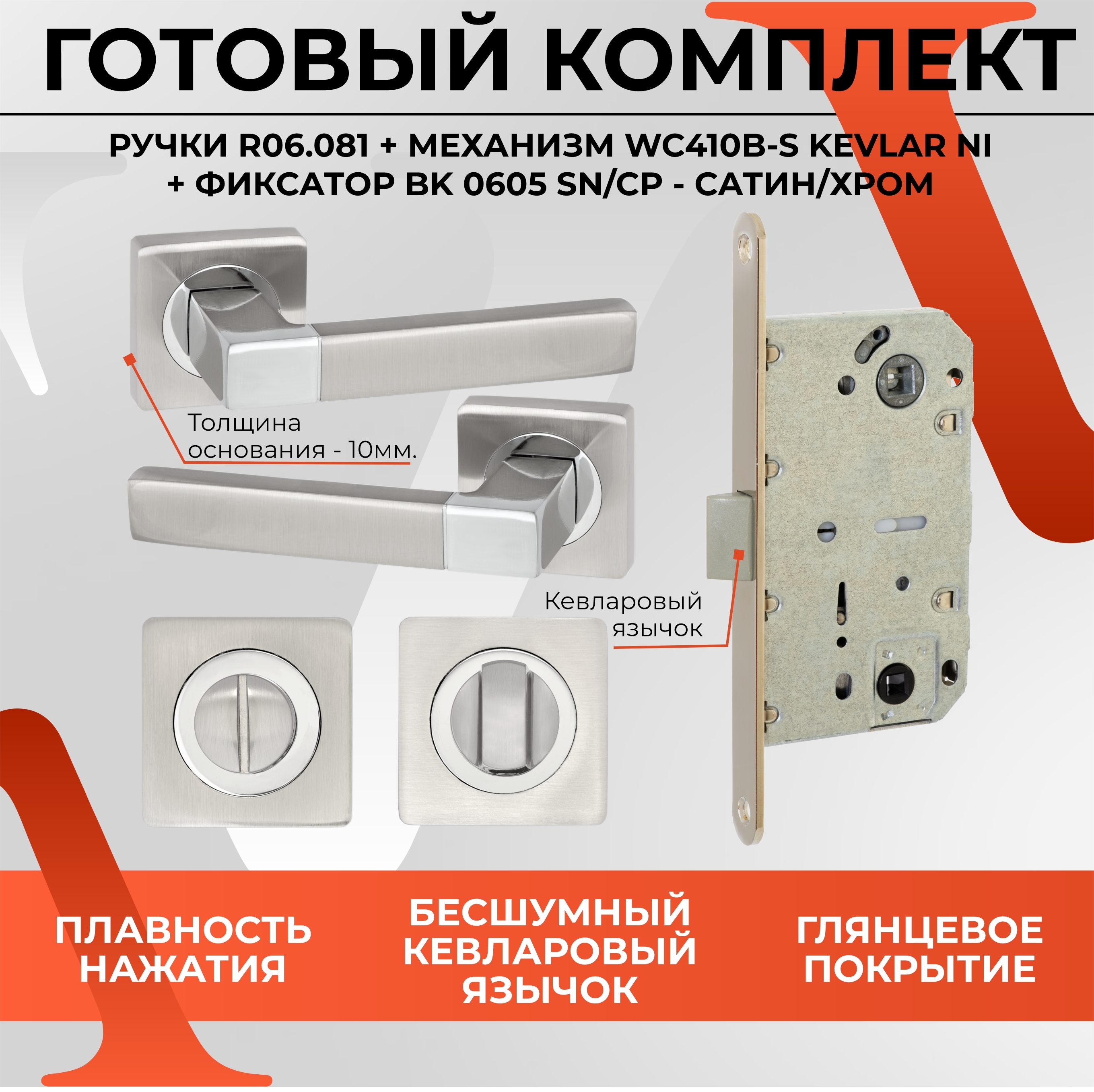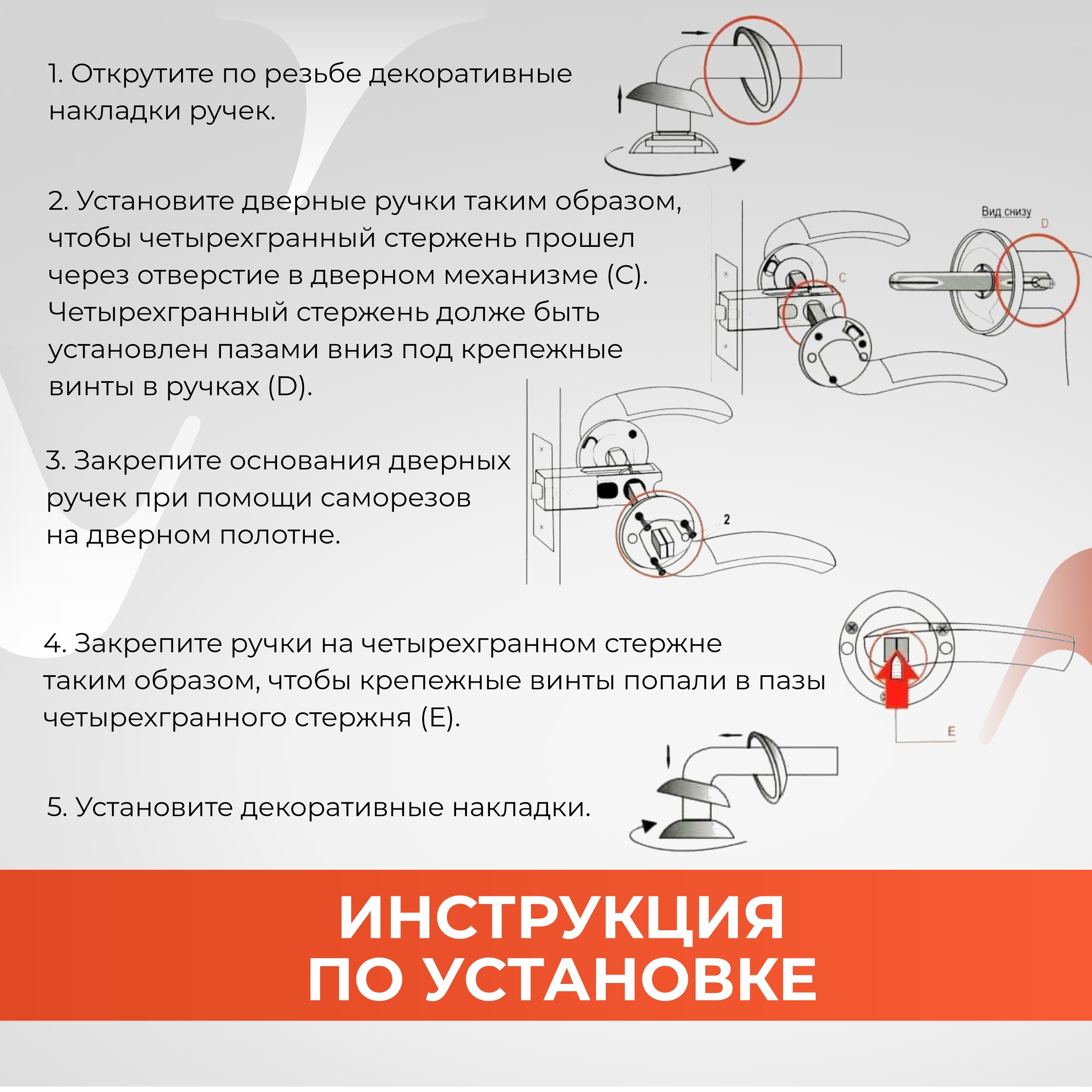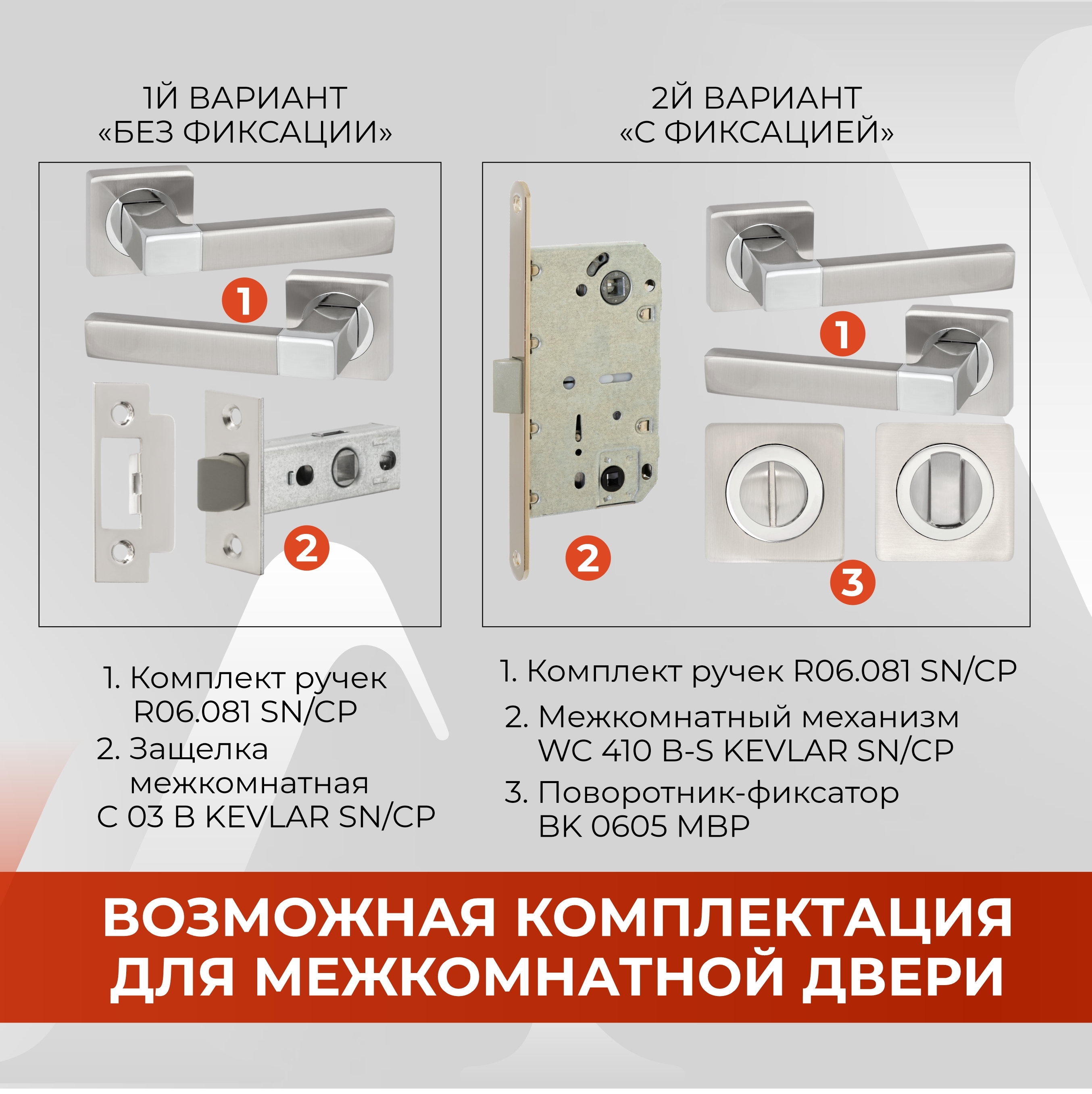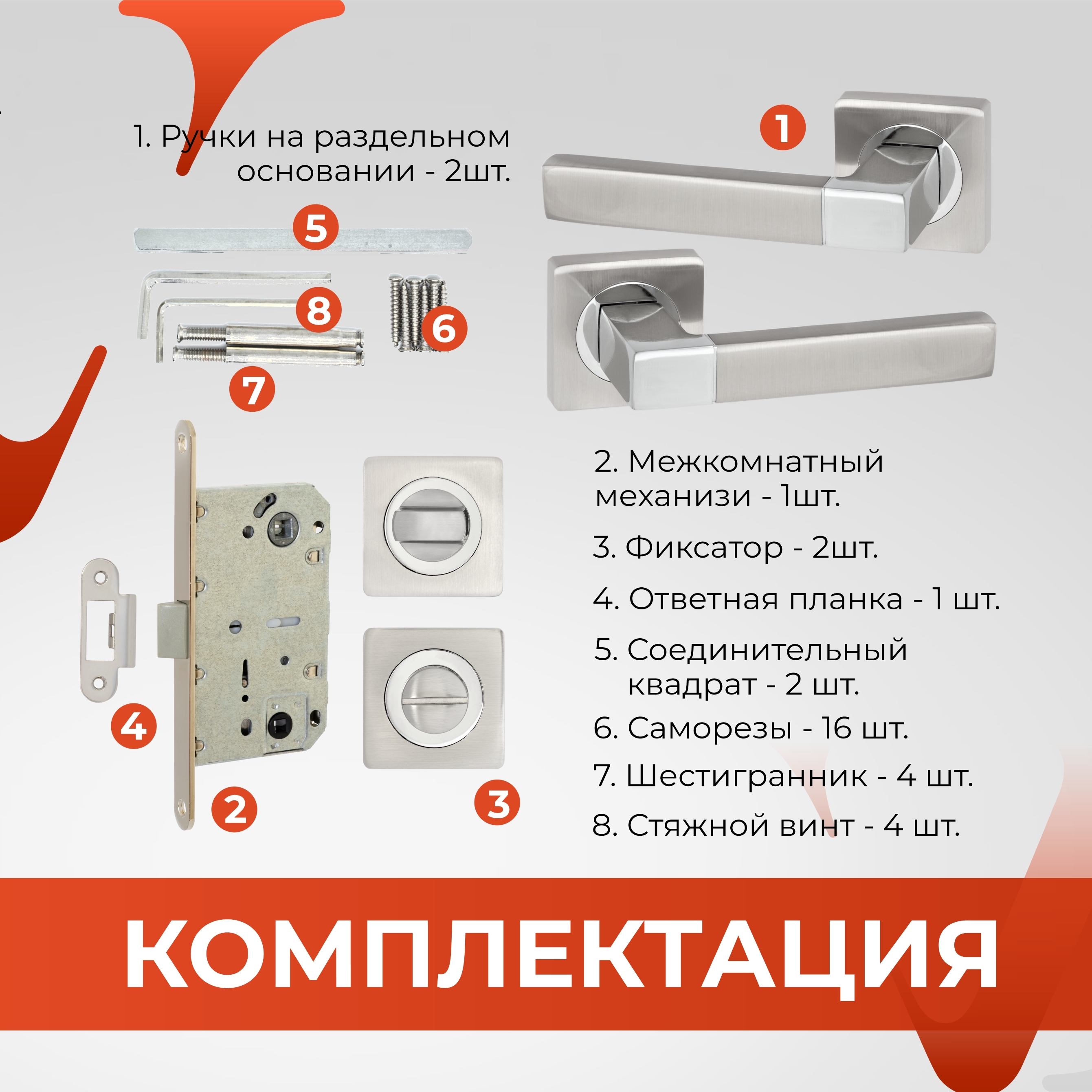 Комплектация:Ручка на одно дверное полотно (соединительный квадрат 8*8*110 мм входит в комплект) - 1 шт; Межкомнатный механизм с ответной планкой и кевларовым язычком - 1 шт; Фиксатор/поворотник в цвет ручки (соединительный квадрат входит в комплект) - 1