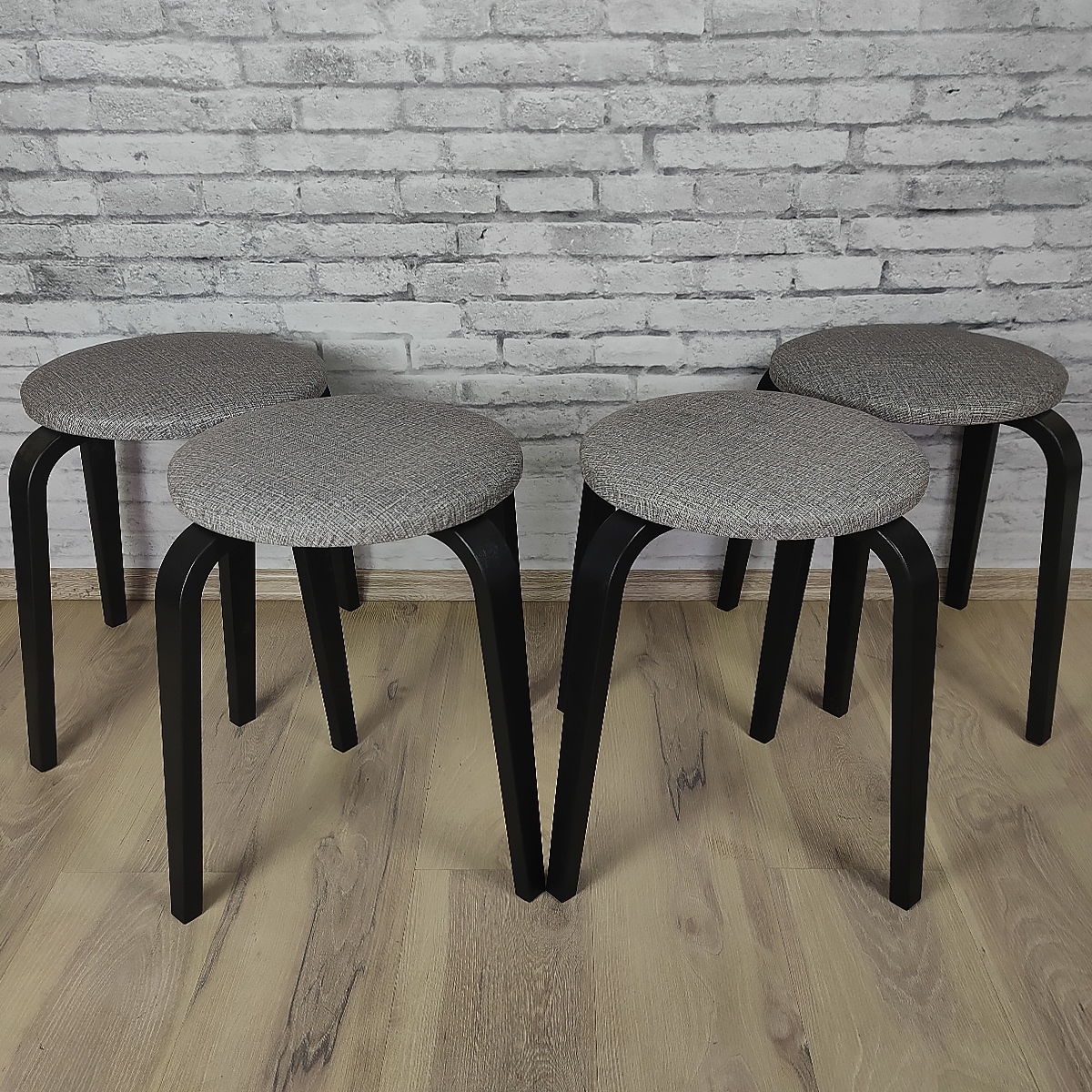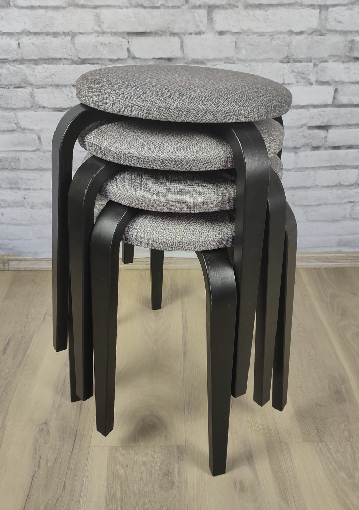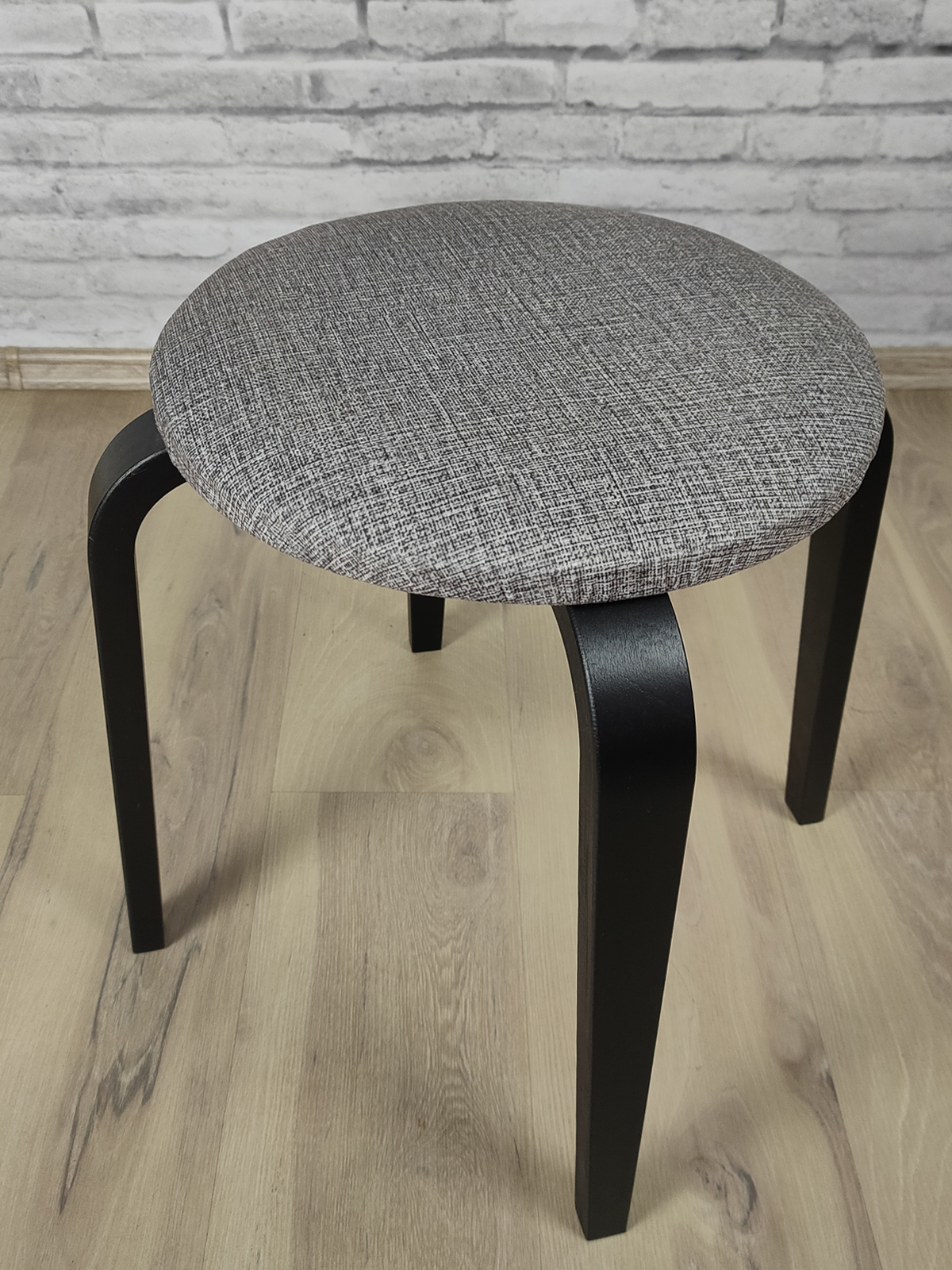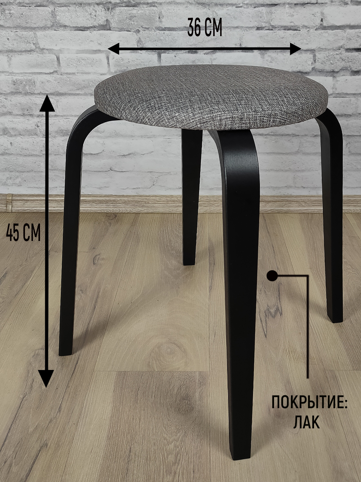 Название моделикухонных Сансет с мягким сиденьем, деревянные табуреты из фанеры с лаковым покрытием и тканевой обивкой, прочные табуретки для кухни, дома и дачи, фурнитура в комплекте, цвет серый с черными ножками