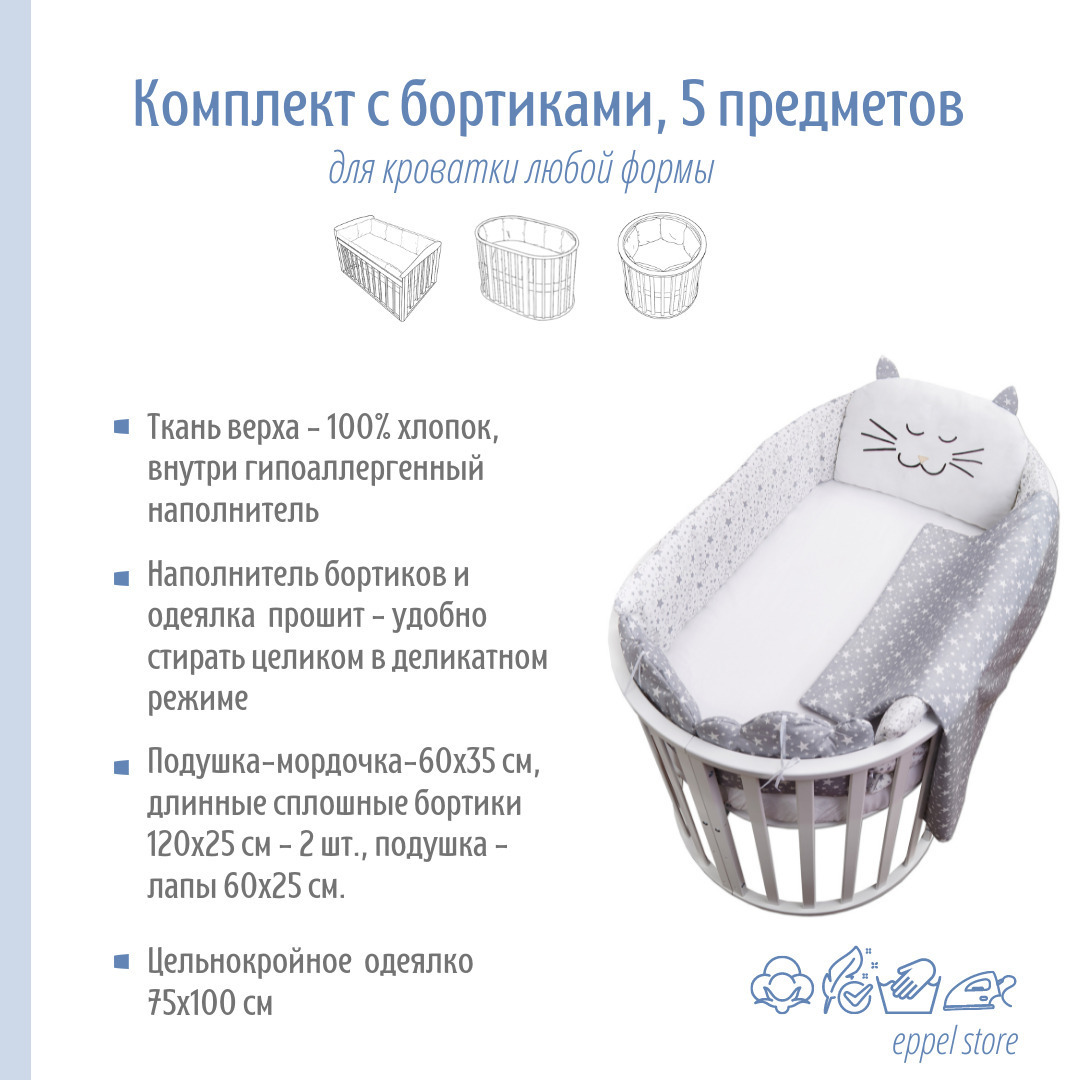 Ваш новорожденный кроха будет спокойно спать в своей кроватке под защитой бортиков - бамперов. Его ручки и ножки избегут случайных ударов о кроватку. Натуральный 100% хлопок, из которого сделаны бортики, хорошо впитывает влагу - младенец не будет потеть и