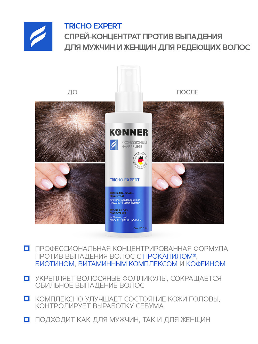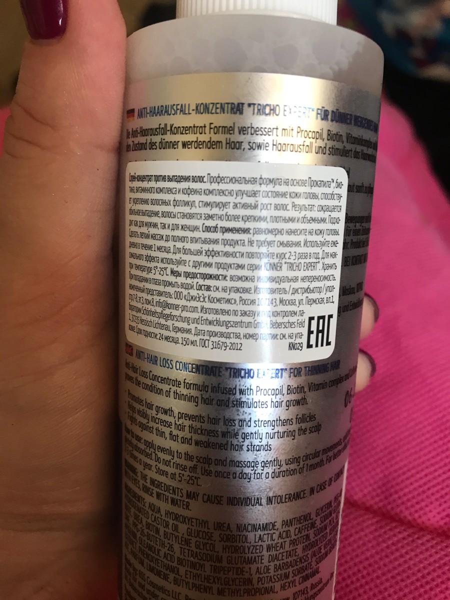 Способ применения:равномерно нанесите на кожу головы. Сделать легкий массаж до полного впитывания продукта. Не требует смывания. Используйте ежедневно в течение 1 месяца. Для большей эффективности повторяйте курс 2-3 раза в год. Хранить при температуре 5°
