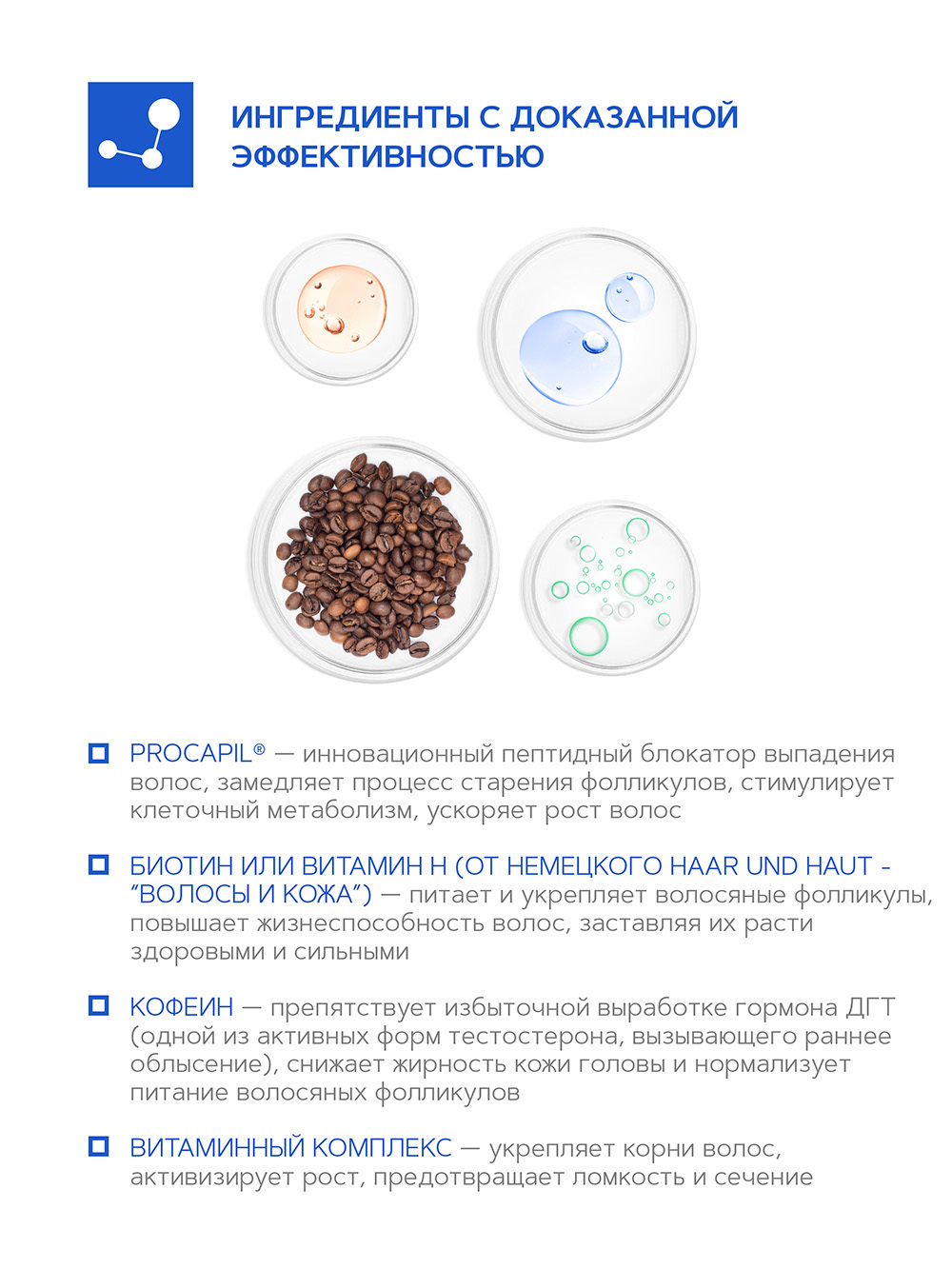 ЭффектВосстановление, Объем, Питание, Уход, Блеск, Мягкость волос, Увлажнение, Укрепление, Против выпадения волос, Лечение кожи головы, Рост, Утолщение, Эластичность