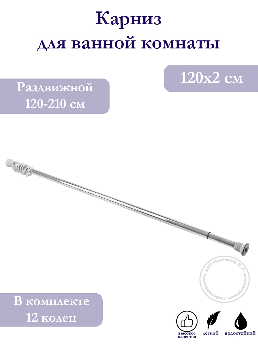 Универсальный карниз для ванны - нужная и необходимая вещь в каждом доме. За счет раздвижного телескопического механизма, подойдёт в ванну с любой длинной. Размер карниза регулируется от 120 см до 210 см. Конструкция представляет собой две трубки, вставле