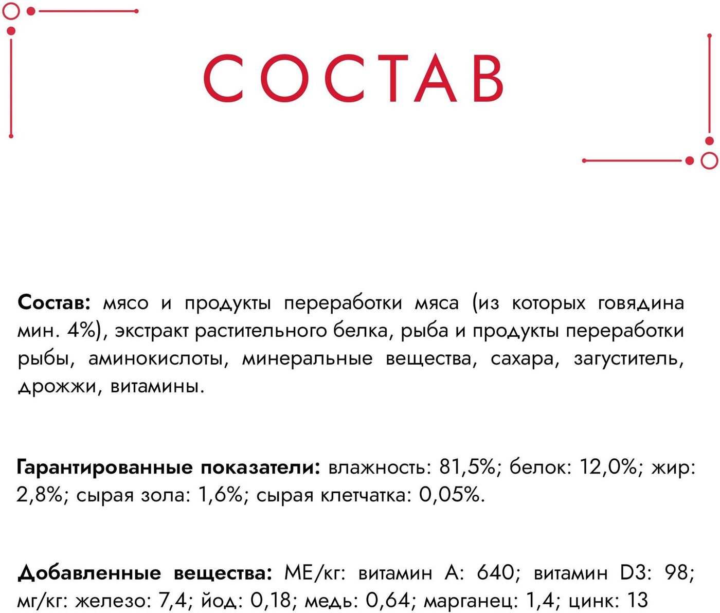 Состав средства:Говядина, Экстракт растительного белка, Рыба, Дрожжи, Витамин А, Витамин D3Комплектация:30 паучейОписание:Настоящие гурманы знают, что ничто не сравнится с восхитительным вкусом только что приготовленного блюда. Именно тогда изысканное с