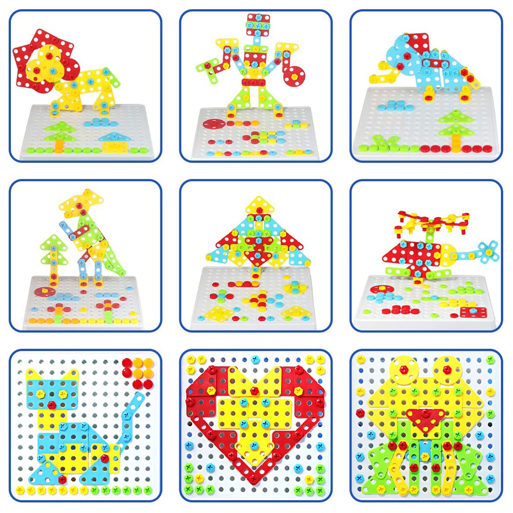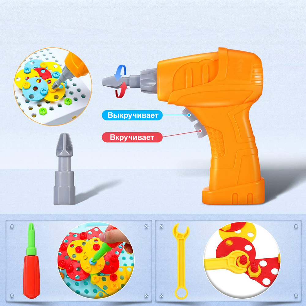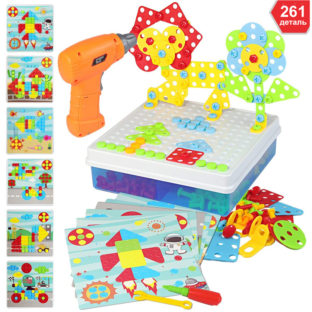 Комплектация:1 бокс со съемным мозаичным полем1 книжка инструкция с примерами6 трафаретов для мозаики1 шуруповерт с 2мя насадками1 отвертка1 гаечный ключ64 геометрические детали80 болтов35 гаек8 креплений60 элементов мозаики (пуговки-грибочки)Описание:Эт