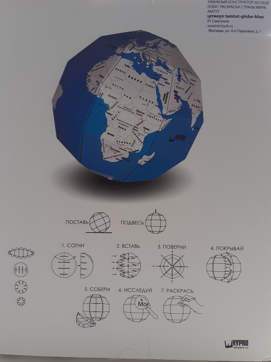 Комплектация:Инструкция, пазлы, карта мира с указанием странОписание:Глобус-раскраска развлекает и обучает одновременно. Подойдет для изучения стран в игровой форме. 3D глобус является трехмерной моделью классической модели планеты Земля, выполненной в ви