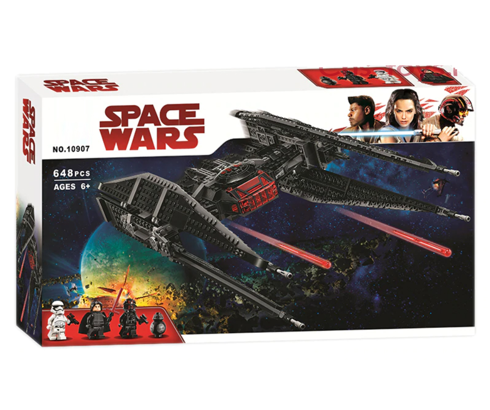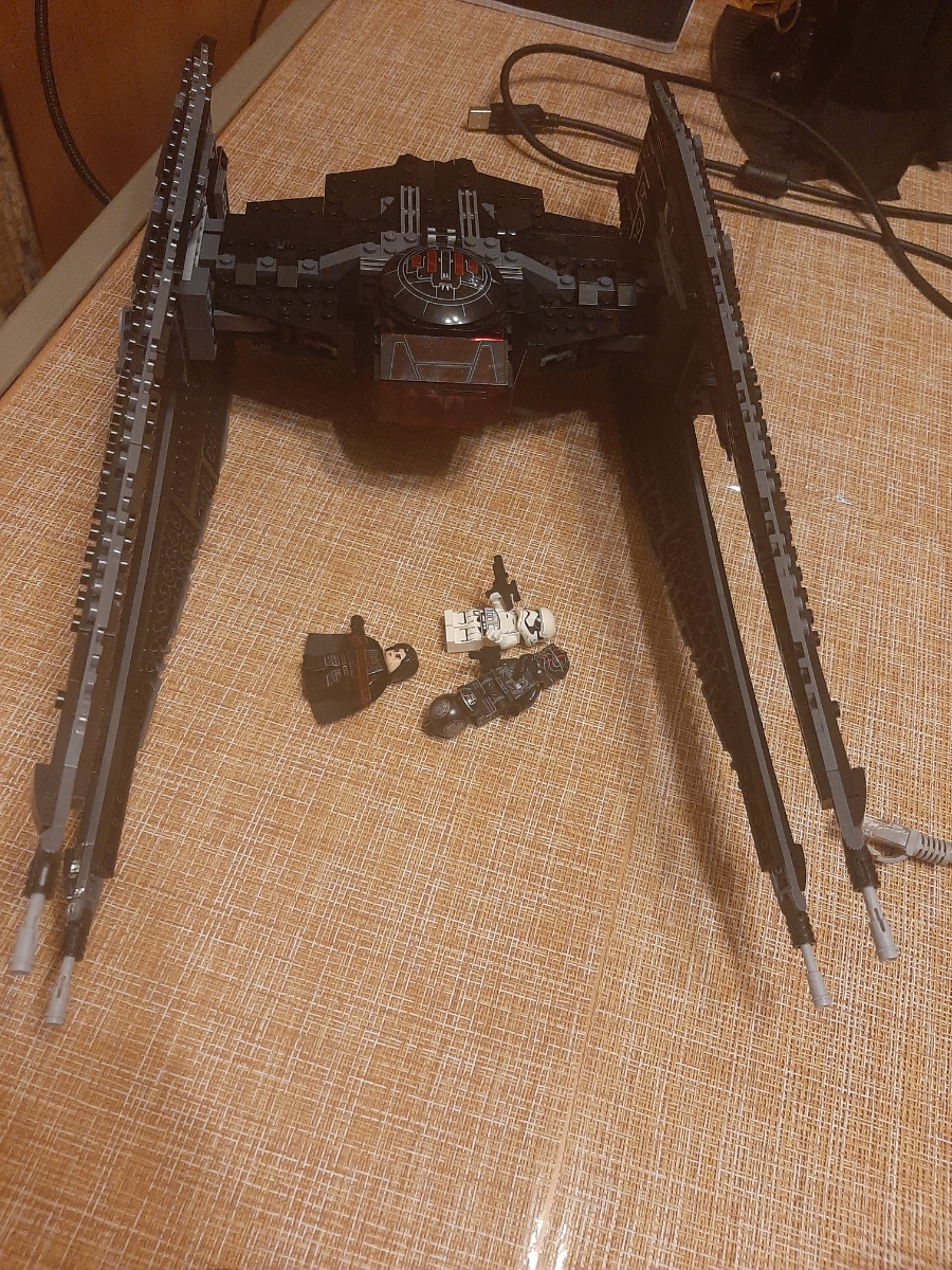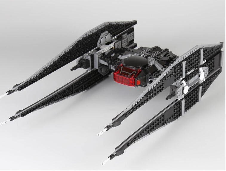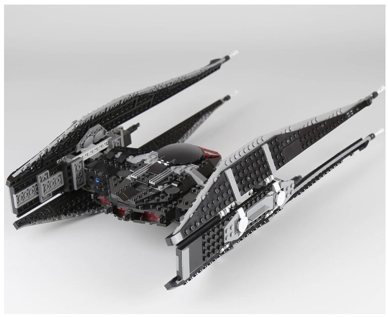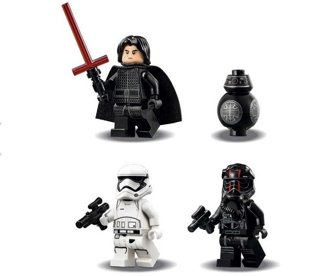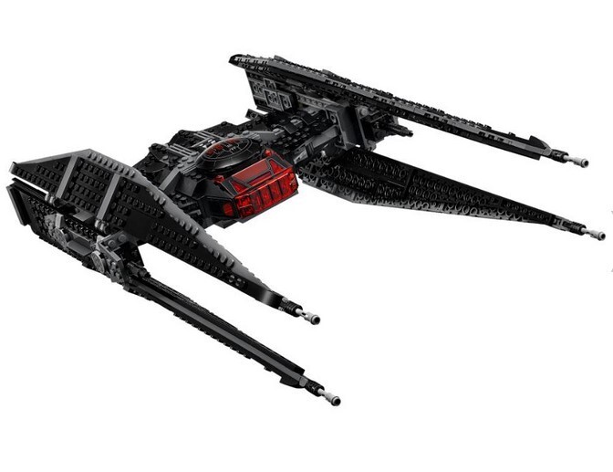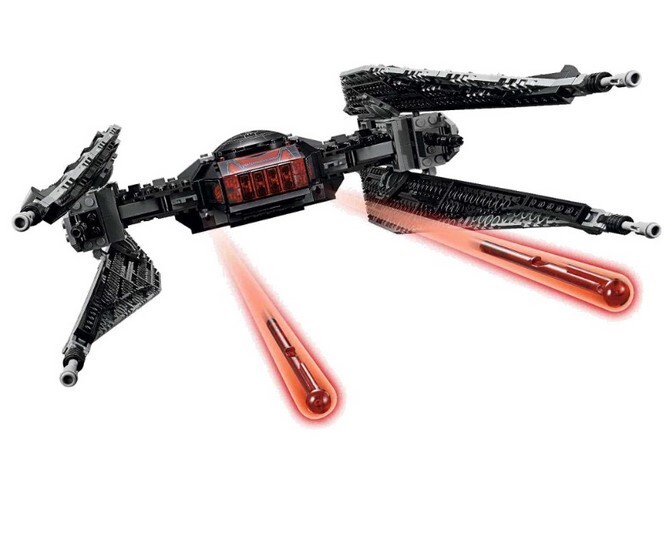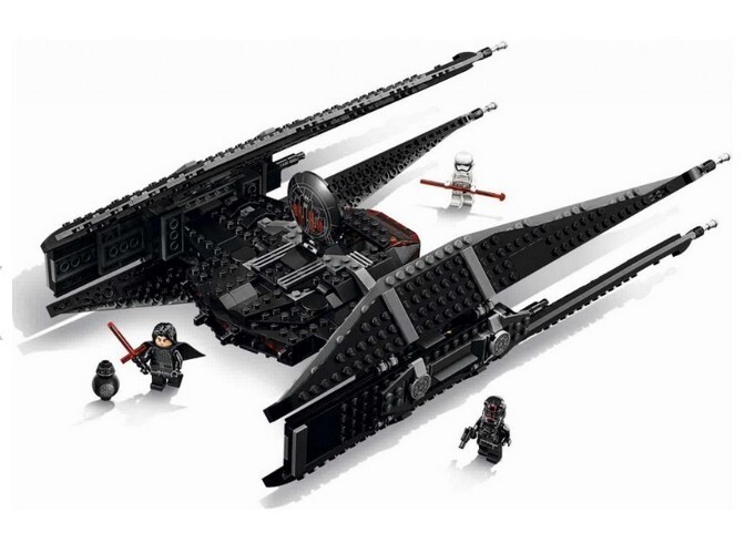 Из деталей набора Вы сможете собрать истребитель TIE Кайло Рена. Его корпус выполнен в классическом чёрном цвете с добавлением серых элементов. Центральное место занимает кабина, прикрытая красным лобовым стеклом. Подняв круглый потолочный люк, можно загл