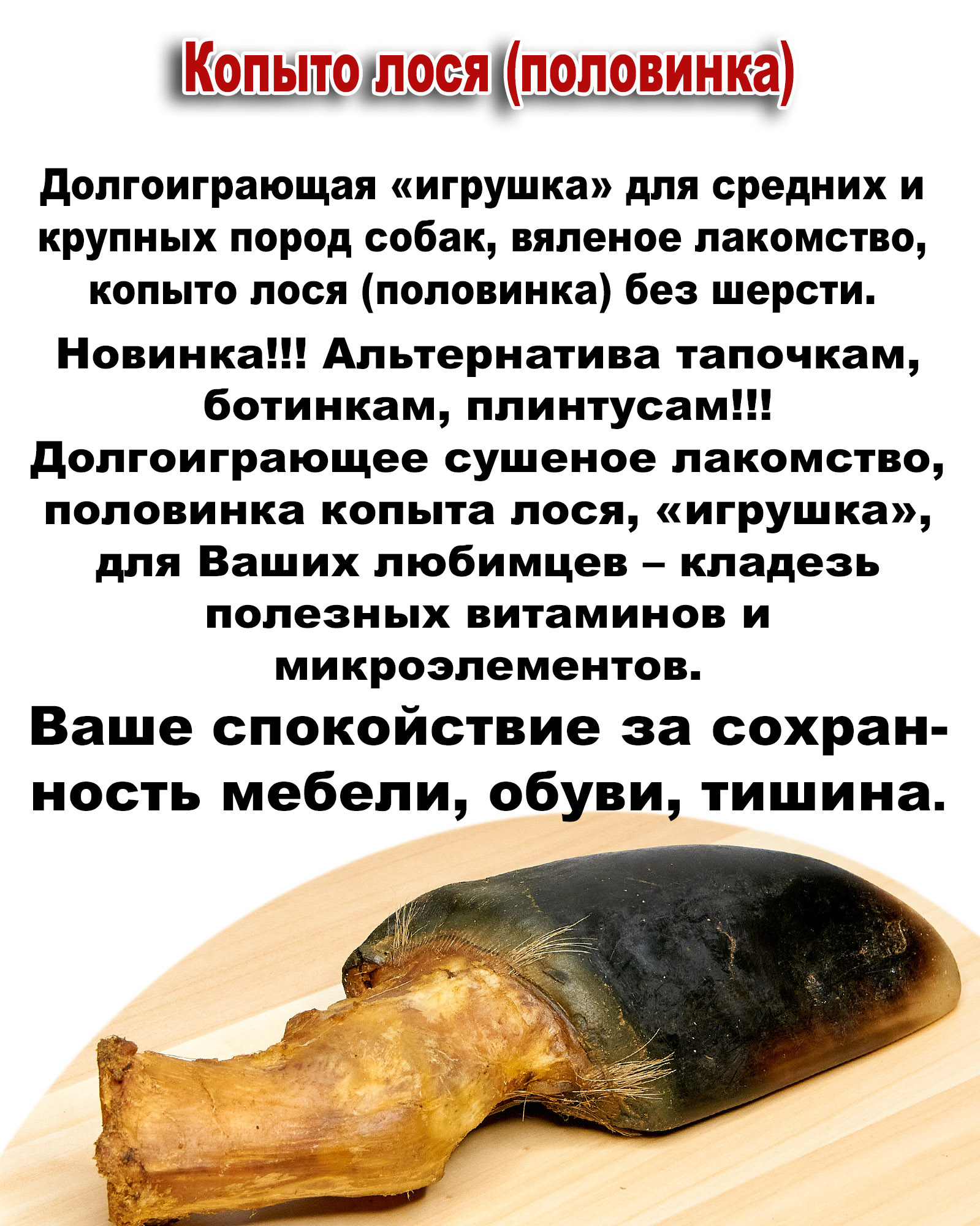 Новинка!!! Альтернатива тапочкам, ботинкам, плинтусам!!! Долгоиграющее сушеное лакомство, половинка копыта лося, «игрушка» для Ваших любимцев – кладезь полезных витаминов и микроэлементов, Ваше спокойствие за сохранность мебели, обуви, тишина. Приобретая