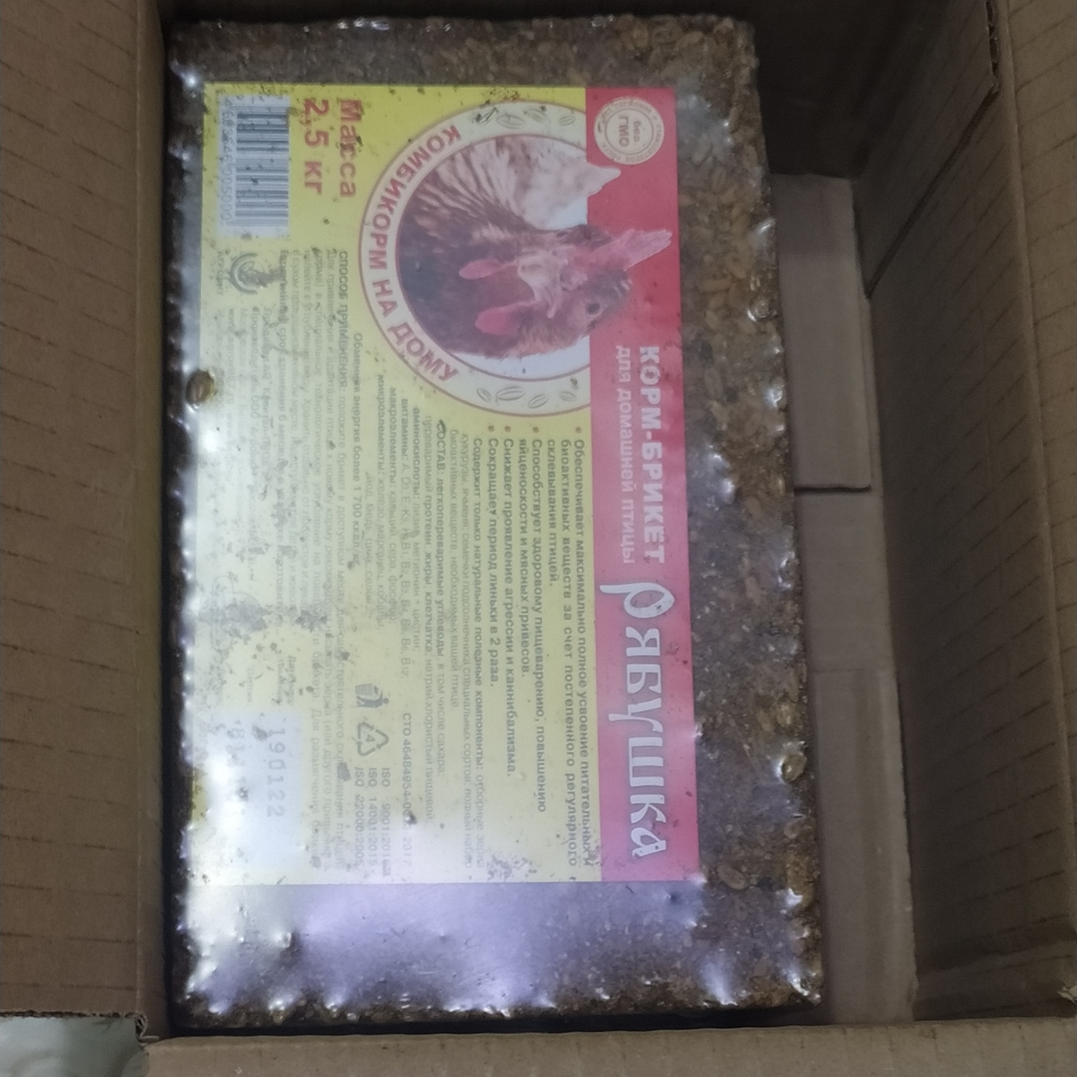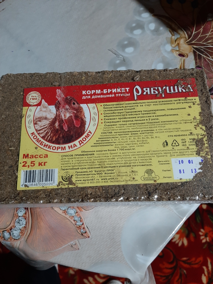 Комплектация:1 брикет 2,5кгОписание:Биоактивная многокомпонентная кормовая добавка Рябушка представляет собой питательный брикет для домашней птицы, который:обеспечивает полноценный кормовой рацион в сочетании с основным кормом для каждой птицы, включая м