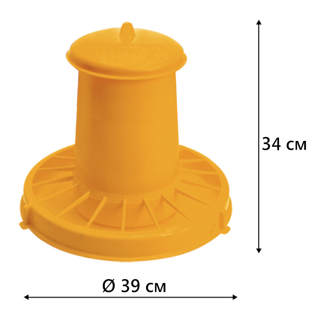 Кормушка бункерная пластиковая, вместимостью 7 кг, для сельскохозяйственной птицы со встроенной разделительной решеткой. Кормушка бункерная состоит из трех частей: большого резервуара с разделительной решеткой, поддона диаметром 39 см и крышки. Использует
