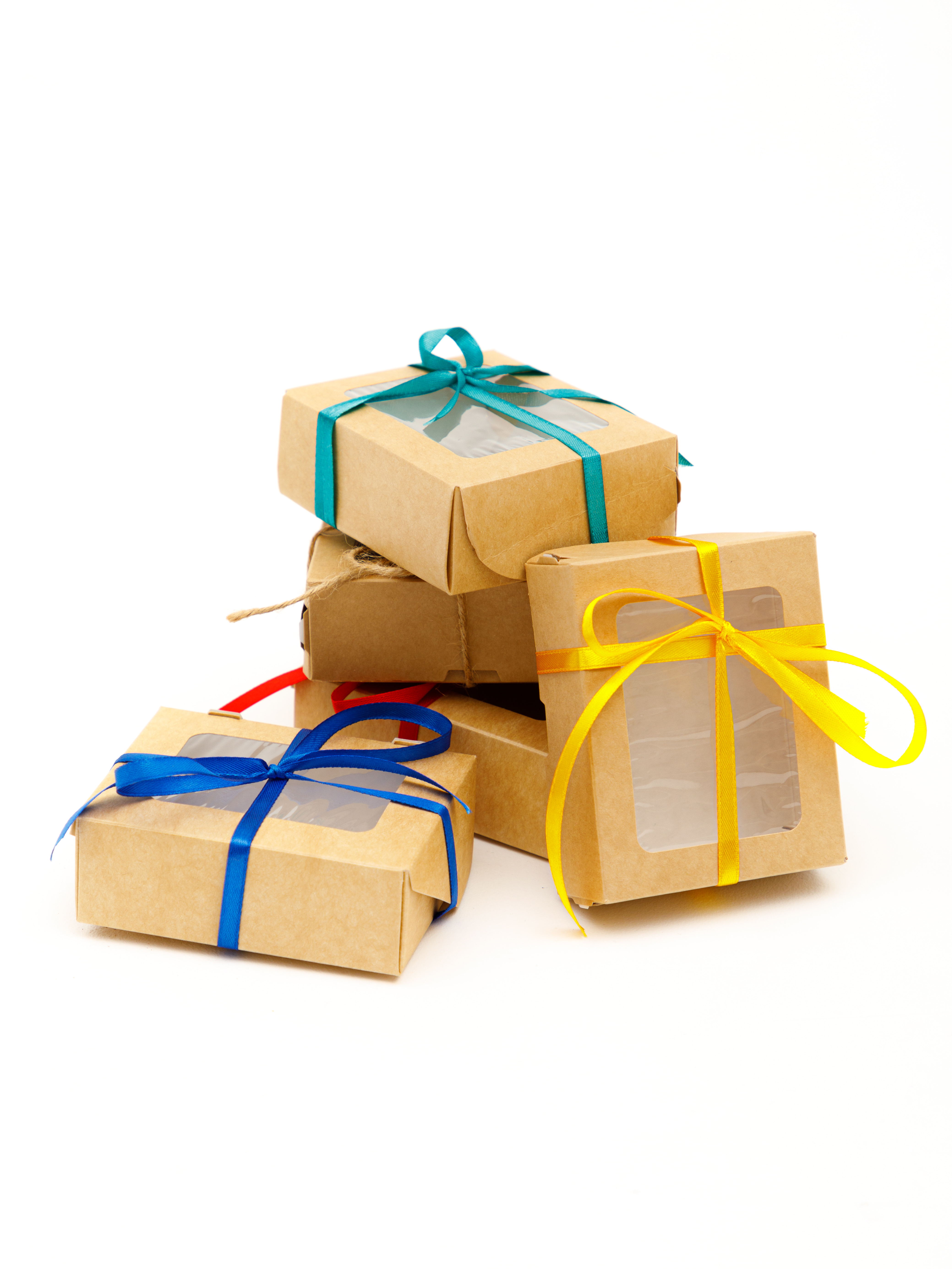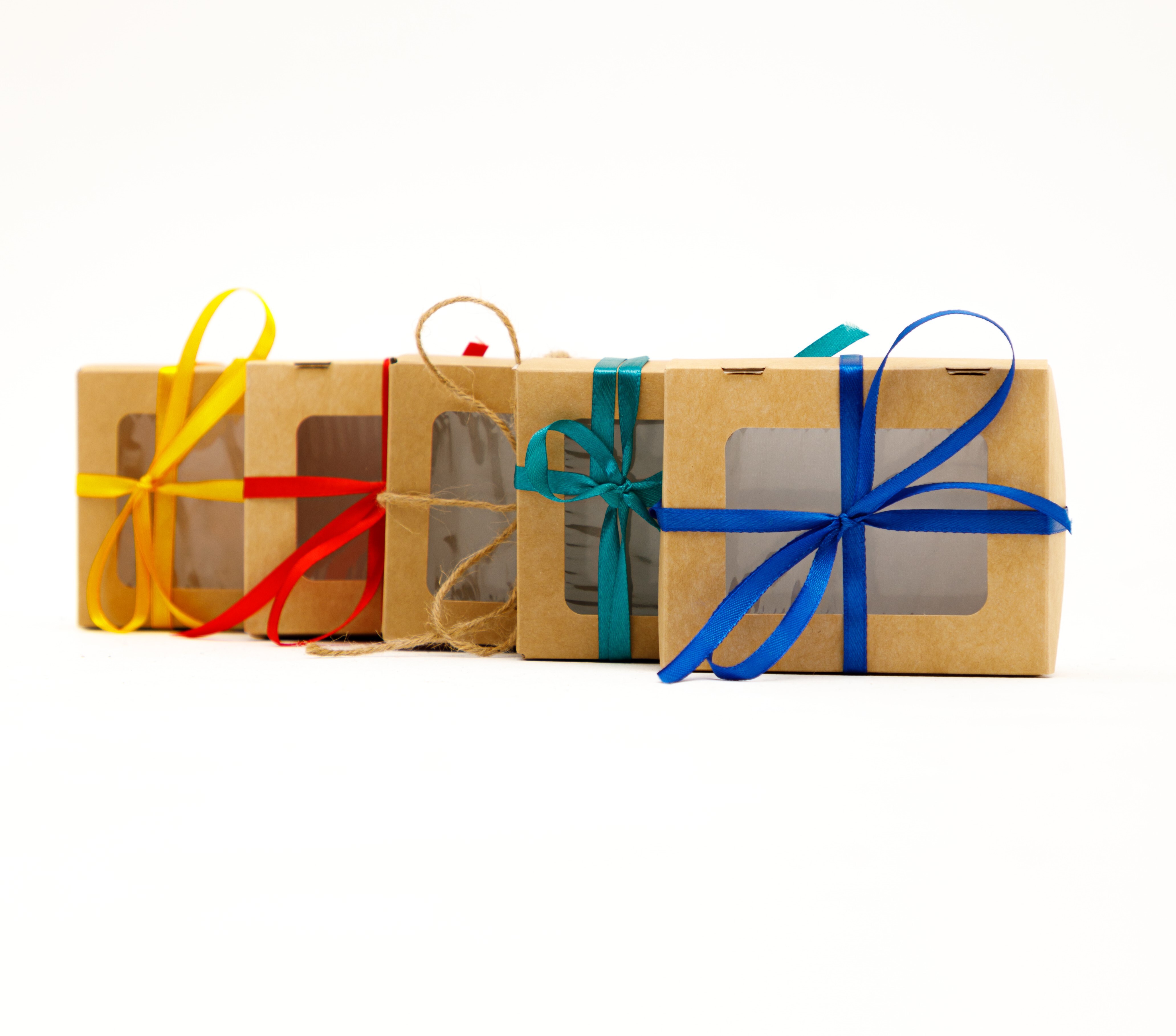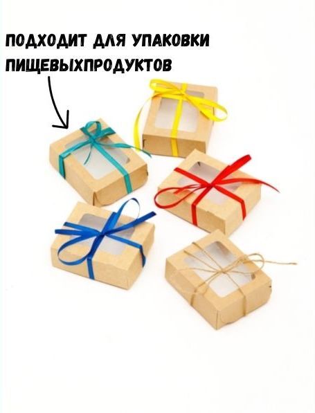 Подарочная крафт коробка маленькая с окном - это шикарный набор из 5 коробок для упаковки подарка, состоящий из 5 картонных крафтовых коробок и подарка - джута и 5ти атласных лент различных цветов длиной до 1 м.Крафтовая подарочная коробка может использов