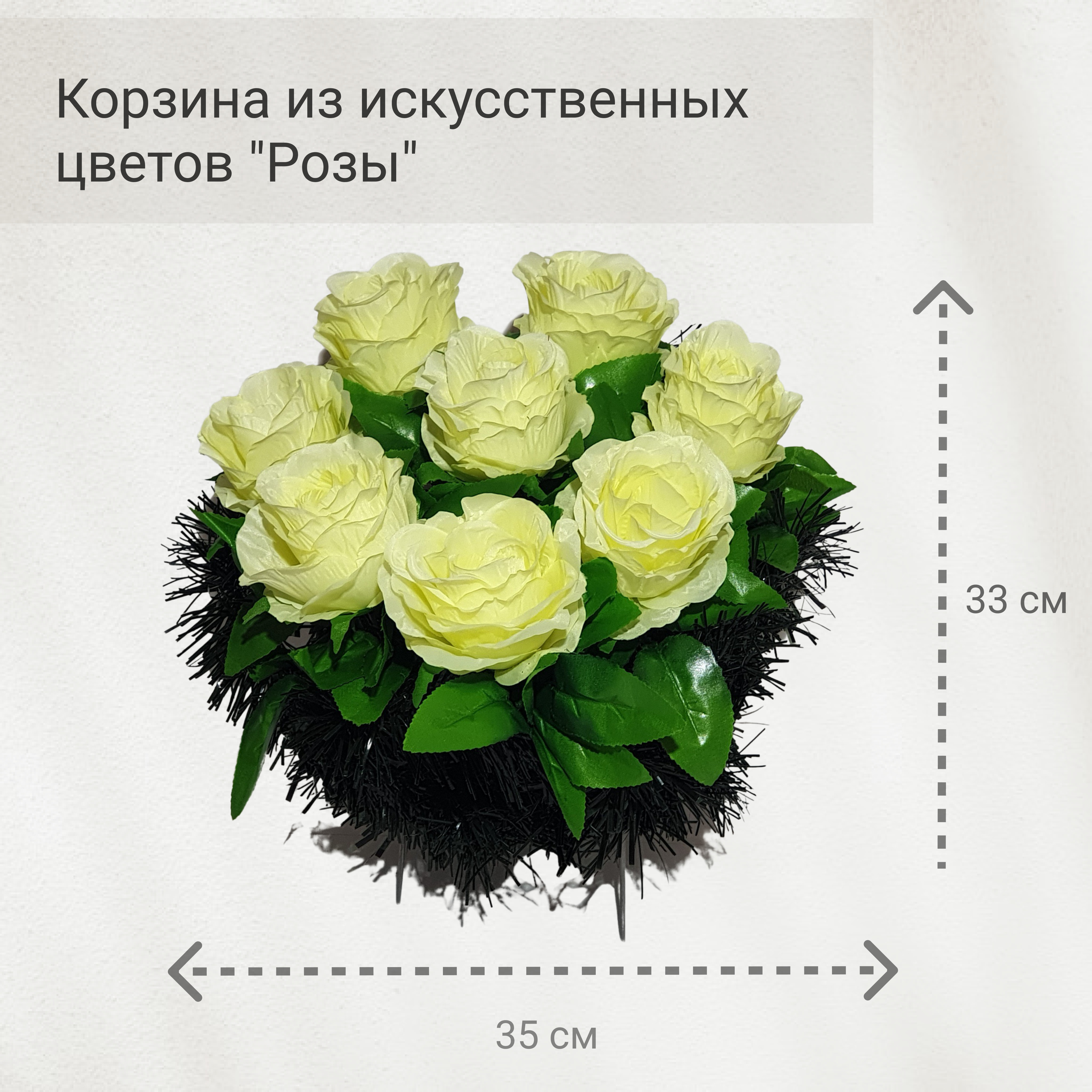 Объемная ритуальная корзина с пышной цветочной композицией выполнена из высококачественных материалов. Композиция состоит из искусственных цветов. Она устойчива к внешним воздействиям, не теряет свой внешний вид при любых погодных условиях, не требует ре