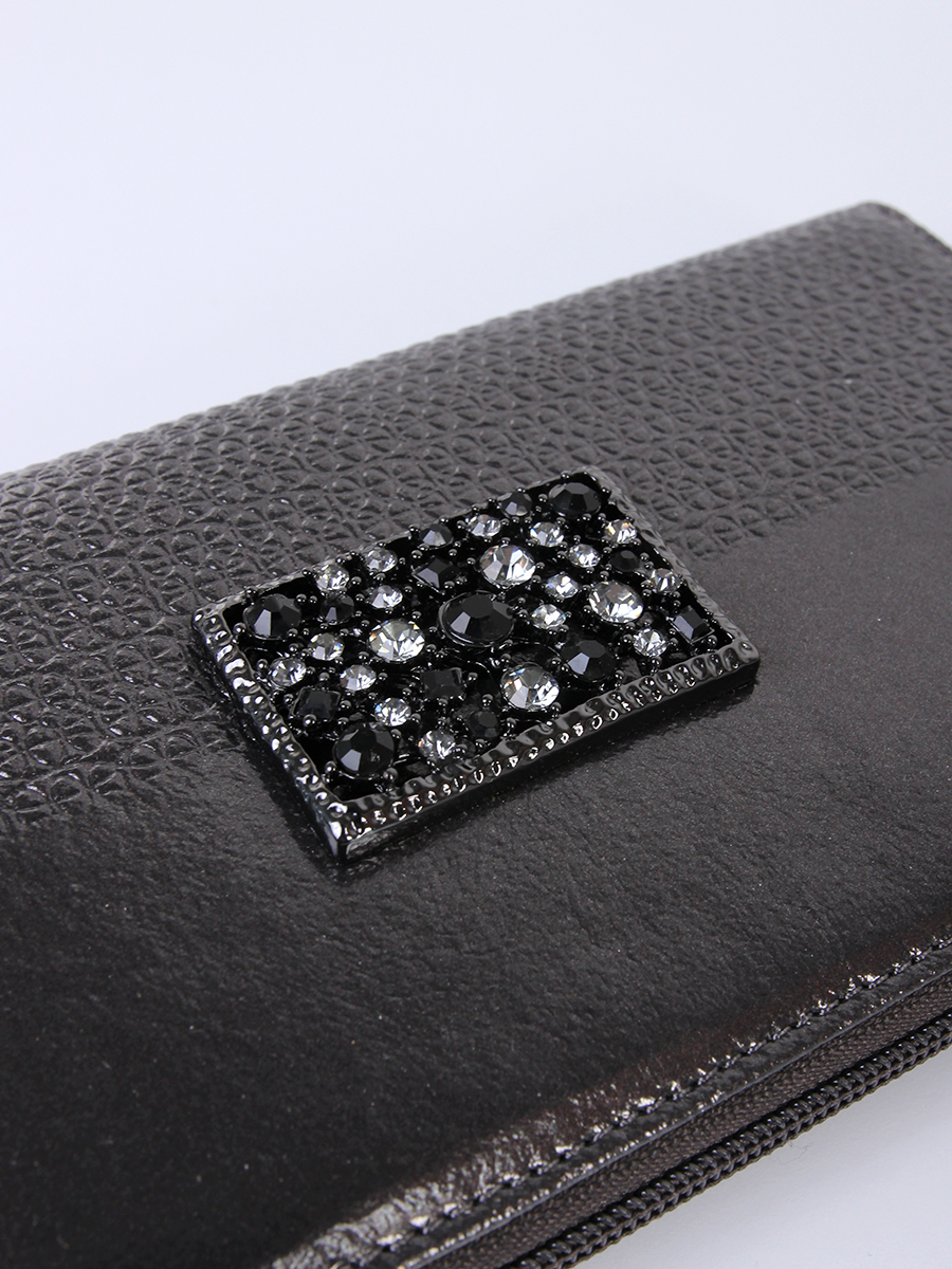 Портмоне большое на молнии "Elisir", коллекция "Mirella" с брошью из кристаллов Swarovski. Портмоне из лаковой черной и темно-серой тисненой кожи. Закрывается на молнию. Внутри 4 отделения для купюр, 2 скрытых кармана, отделение для мелочи на молнии и 12