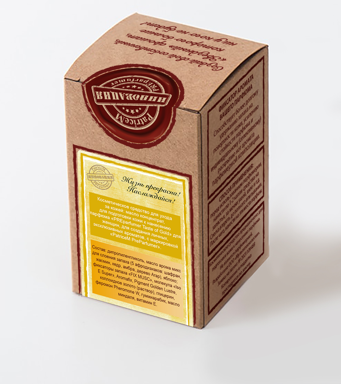 Состав:дипропиленгликоль, масло арома микс для слоения запаха (5 афродизиаков: шафран, жасмин, кедр, амбра, дерево Агар), яблоко; фиксаторы запаха «FIX MUSС», молекула «Iso E Super», Aromafix, Pigment Golden Lustre, коллоидное золото (раствор), глицерин,
