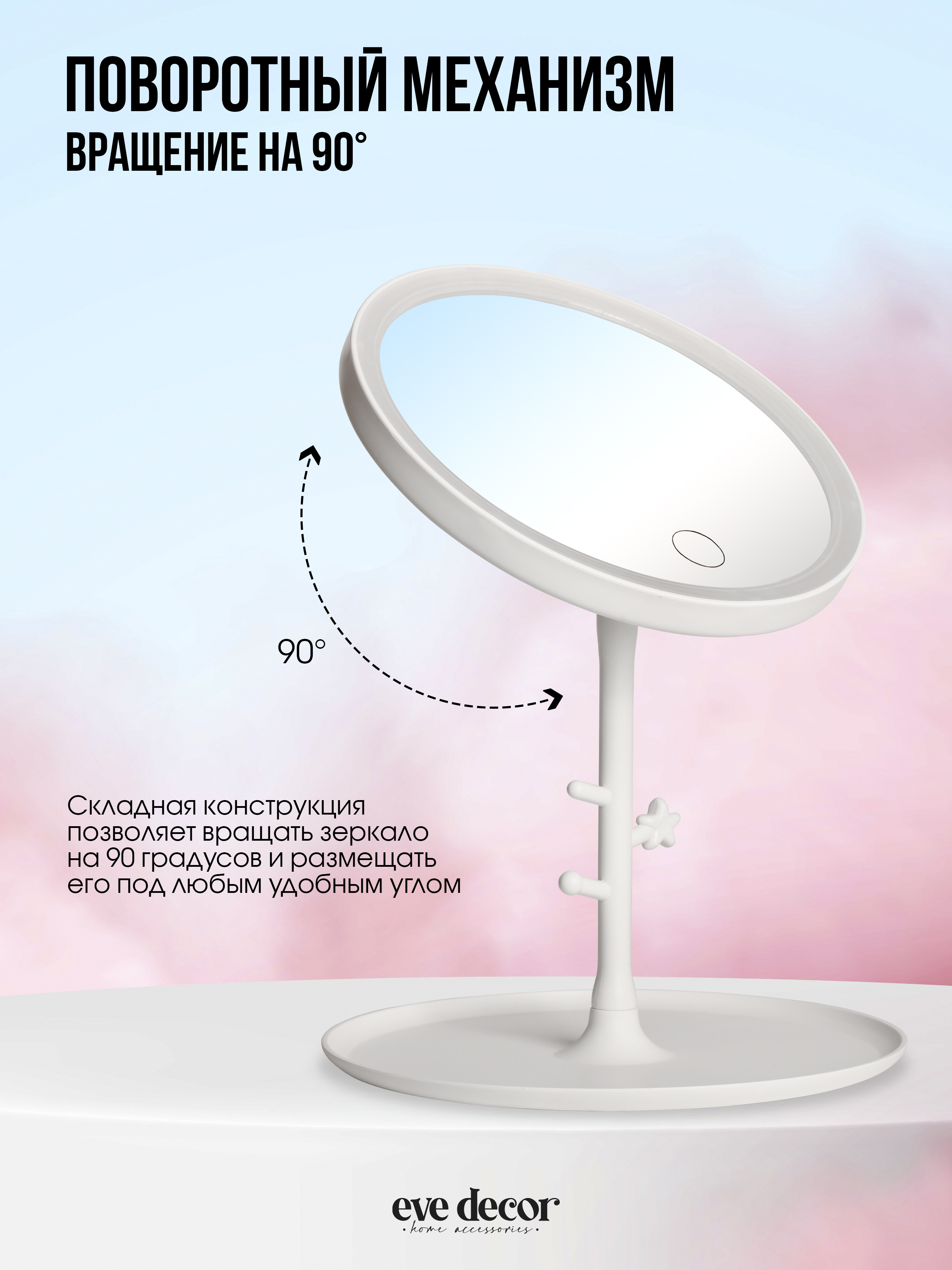 Особенности зеркалаПодсветка, Сенсорный выключатель подсветки, Поворотная конструкция, Ударопрочное