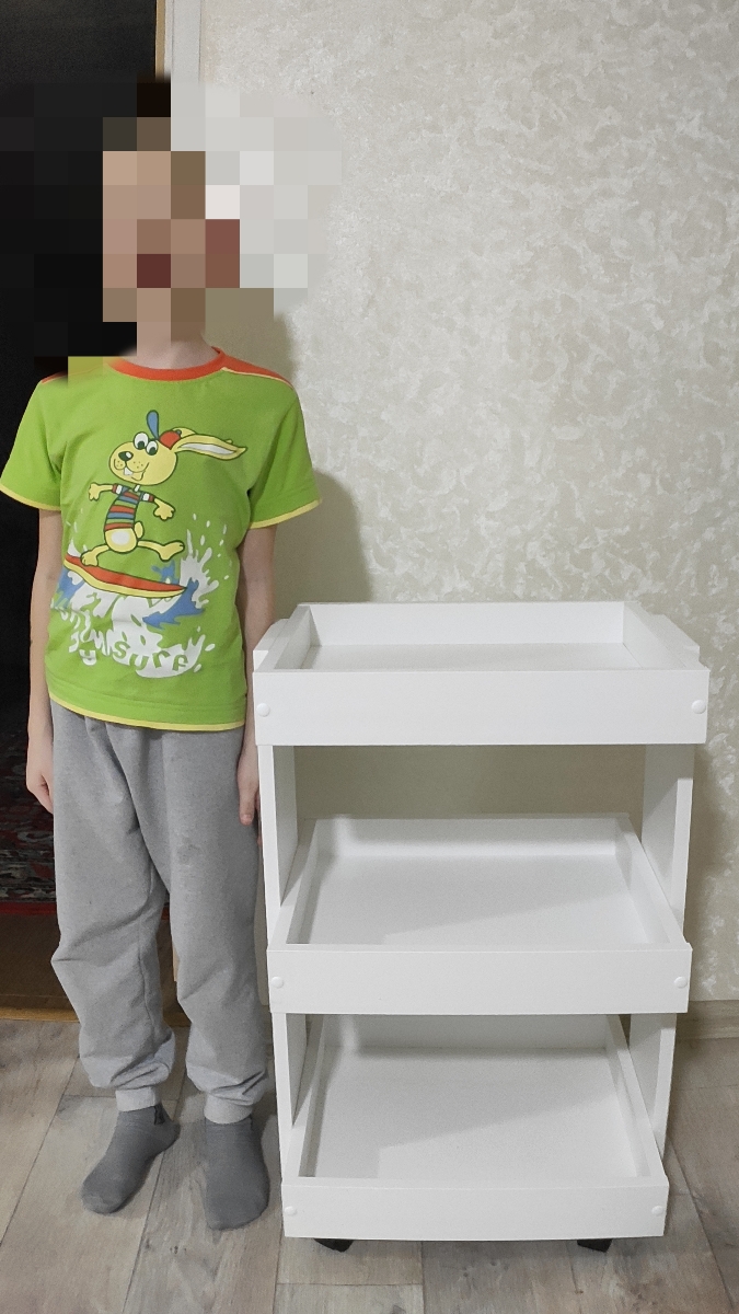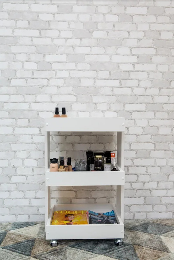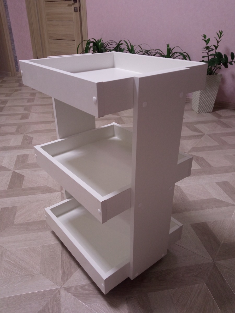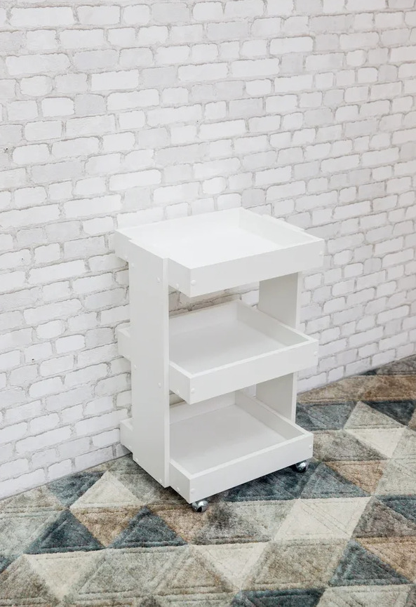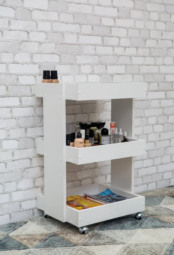 Этажерка для косметолога изготовлена из высококачественного ЛДСП, края обработаны ударозащитной ПВХ кромкой, что обеспечивает долгий срок службы тележки, а качественная фурнитура выгодно подчеркнет изделие в любом интерьере.Стеллаж имеет три полки с небол