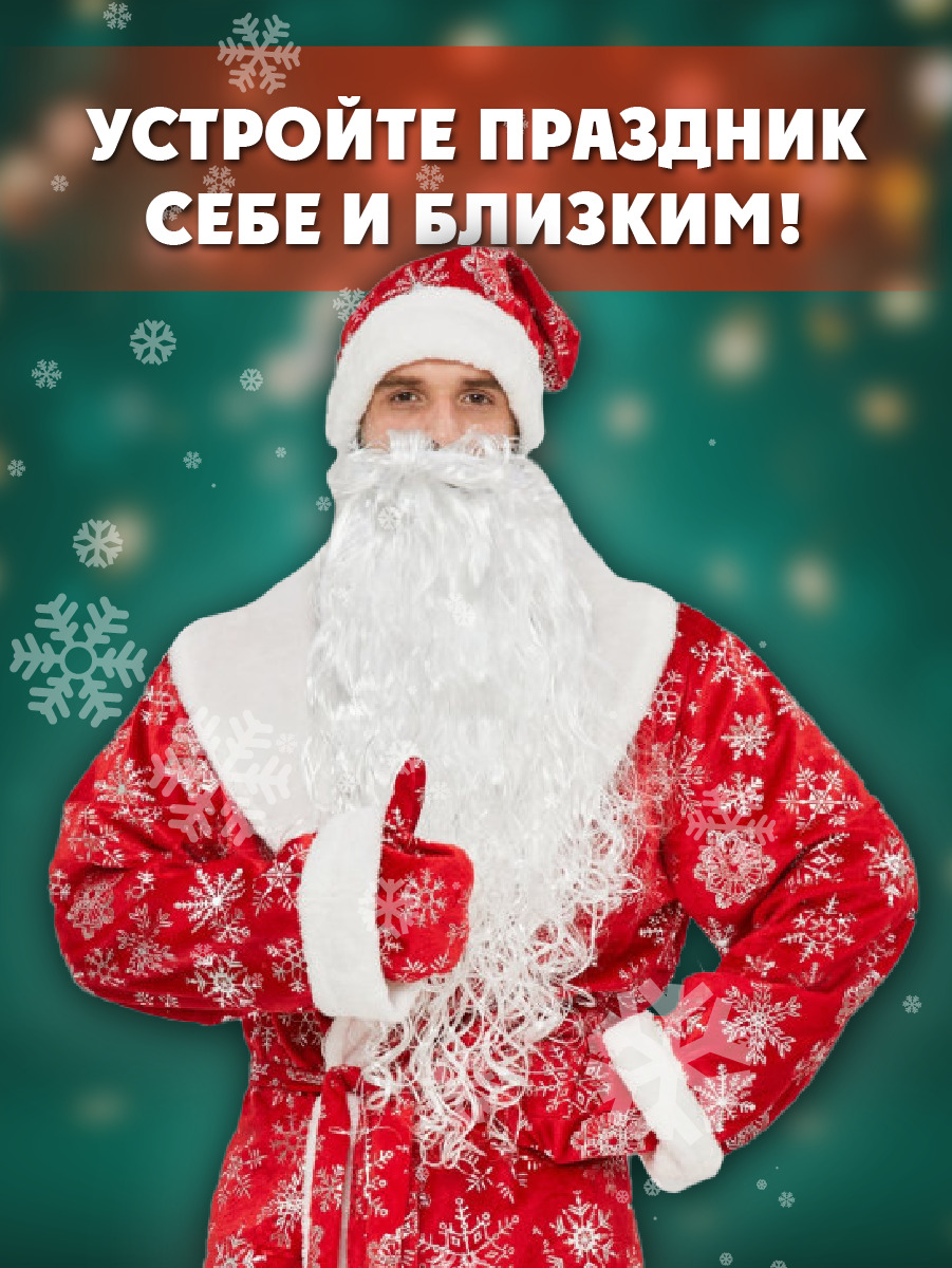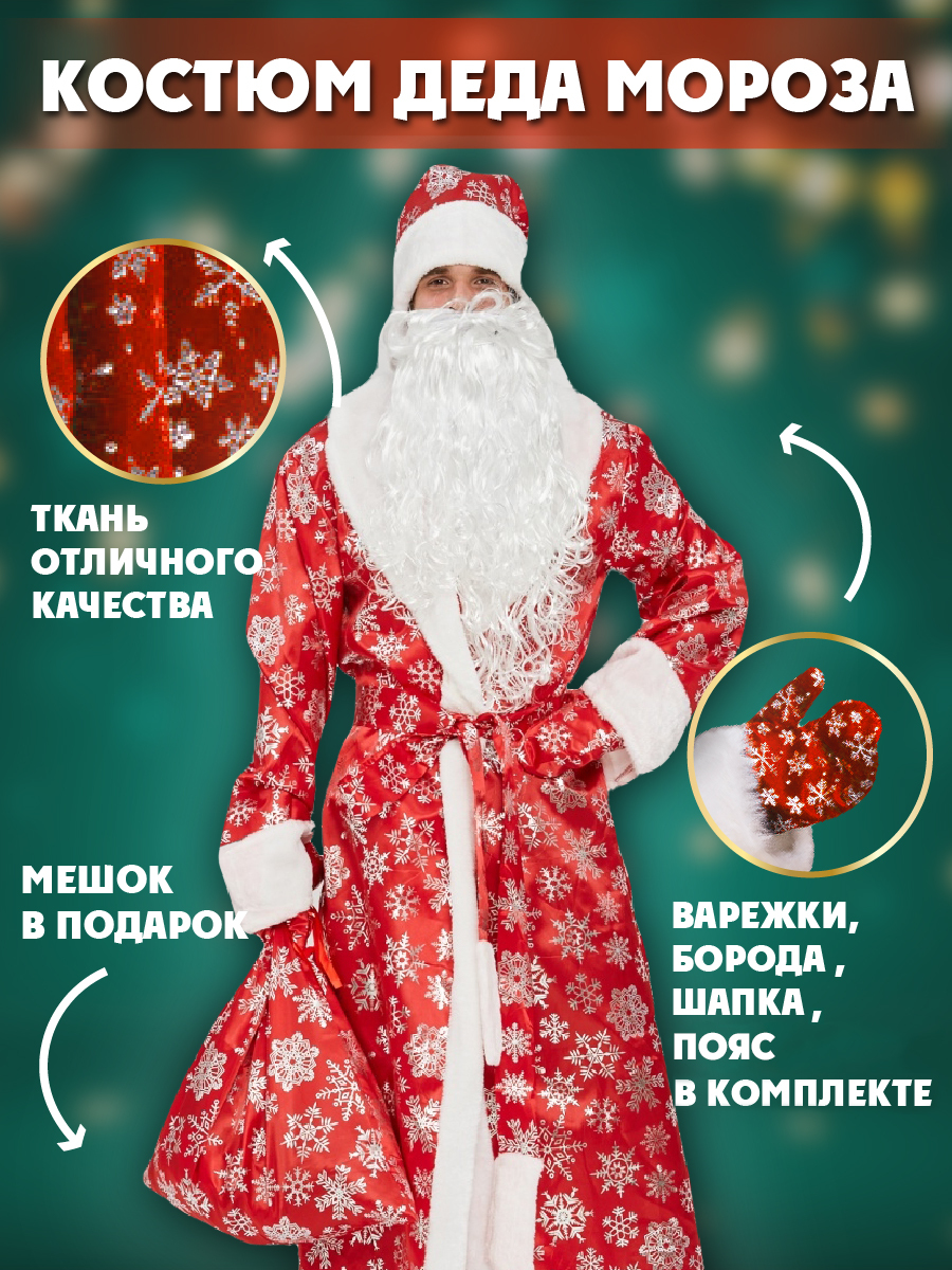 Атласный красный костюм Деда Мороза - это костюм для взрослых, который идеально подойдет для выступления на детских новогодних утренниках и подобных мероприятиях. Костюм состоит из длинной шубы красного цвета с белой отделкой и блестящими узорами, к ней п