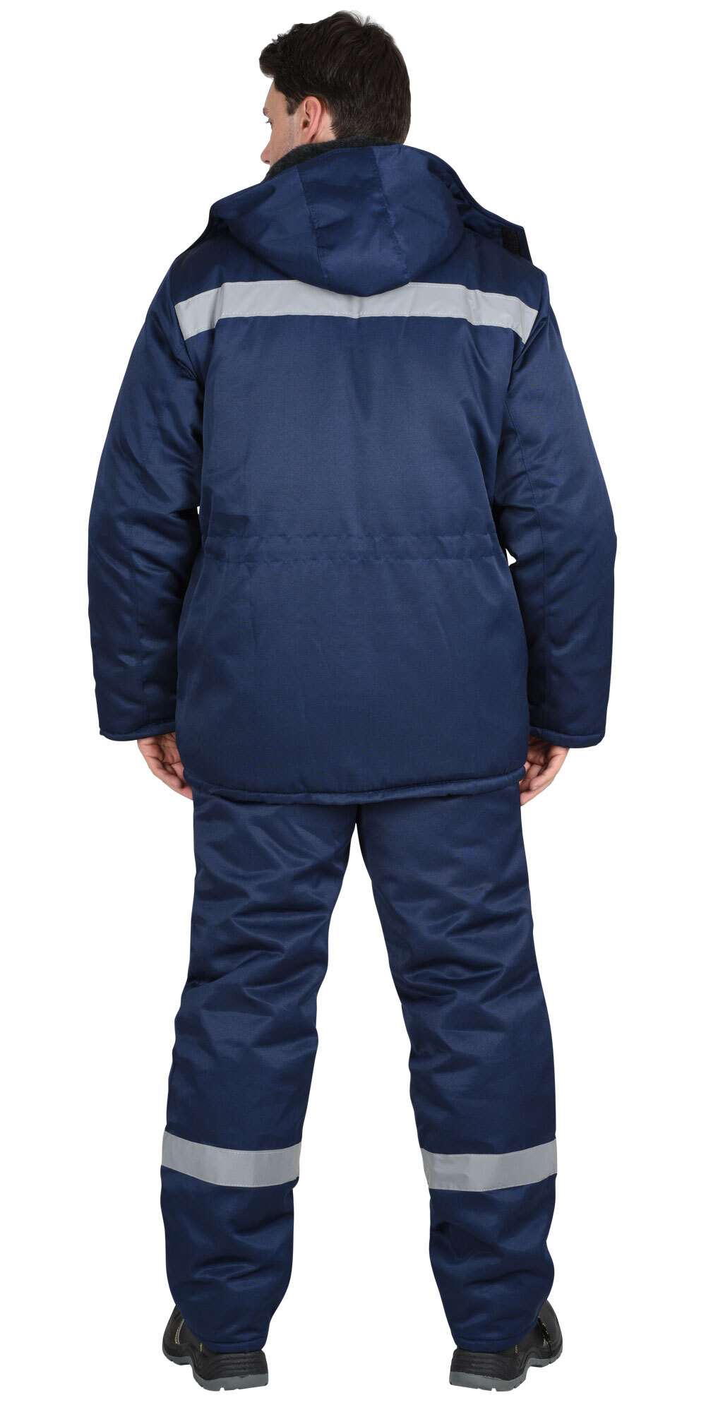 Куртка прямого силуэта, с притачной утеплённой подкладкой, с центральной застежкой на тесьму молния; ветрозащитной планкой застёгивающейся на четыре кнопки; с кулисой по линии талии со шнуром, концы шнура выводятся из обметанных петель на подборте и регул