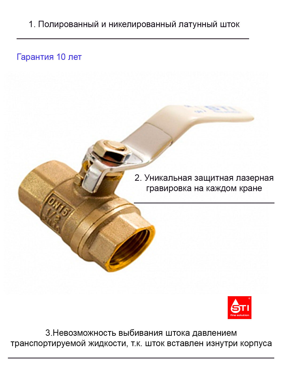 Кран шаровой латунный бренда STI применяется в качестве запорной арматуры на трубопроводах систем питьевого и хозяйственно-питьевого назначения, горячего водоснабжения, отопления, сжатого воздуха, жидких углеводородов, а также на технологических трубопров