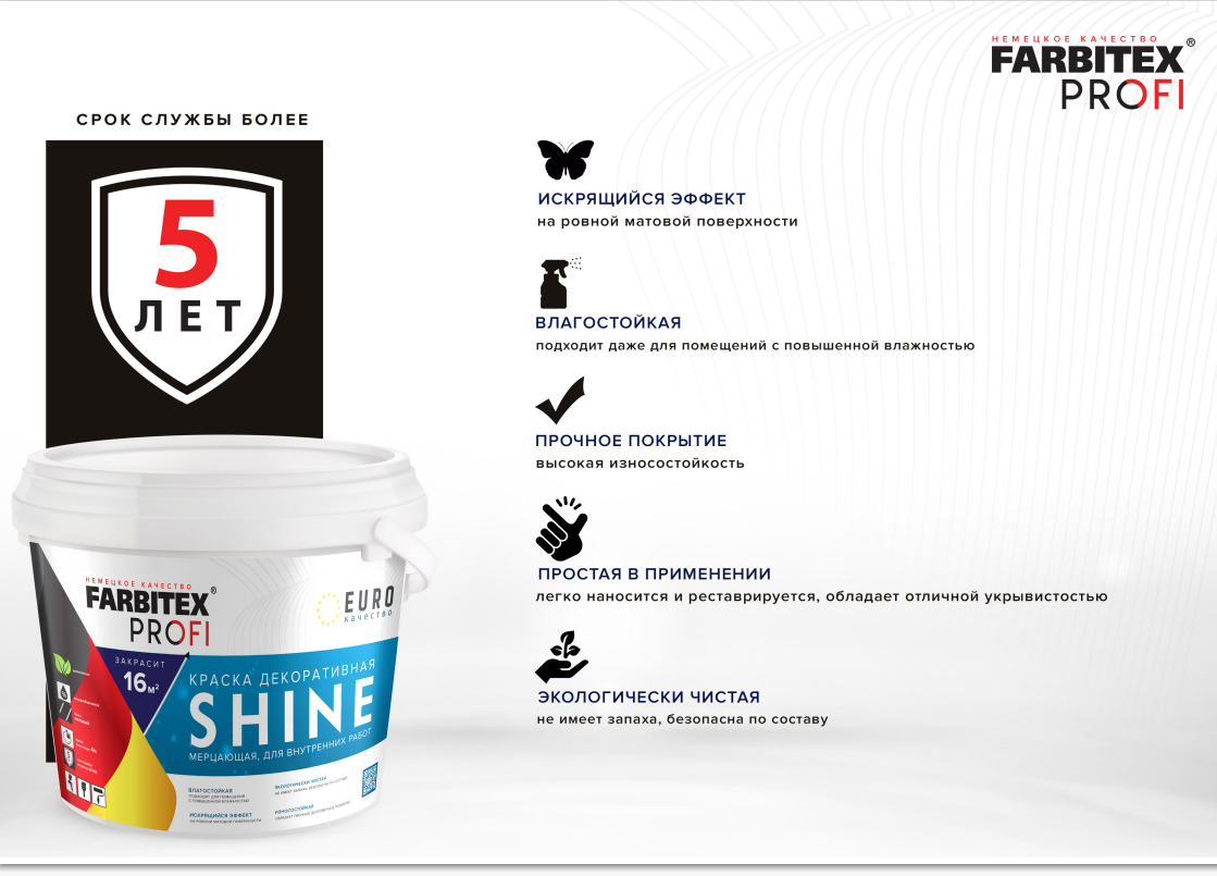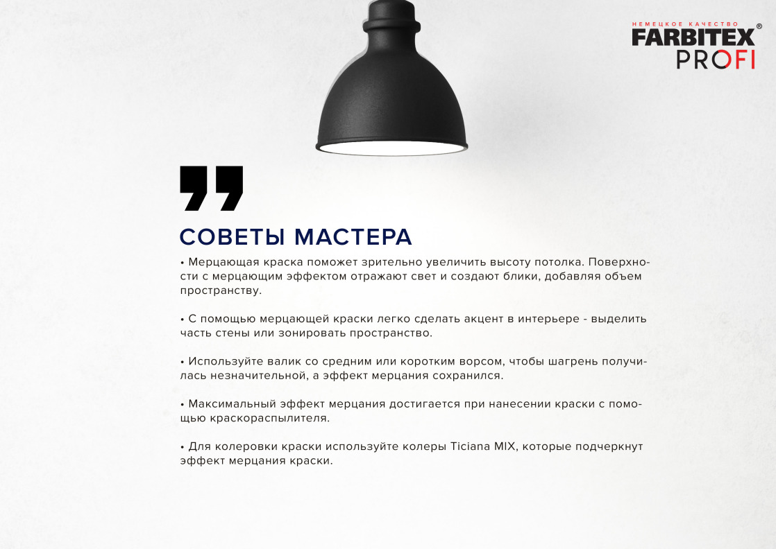 Высококачественная водно-дисперсионная влагостойкая краска с эффектом мерцания произведена по немецким технологиям на оборудовании фирмы NETZSCH. Краска отличается высокими декоративными и защитными свойствами. После нанесения образует ровную матовую плён