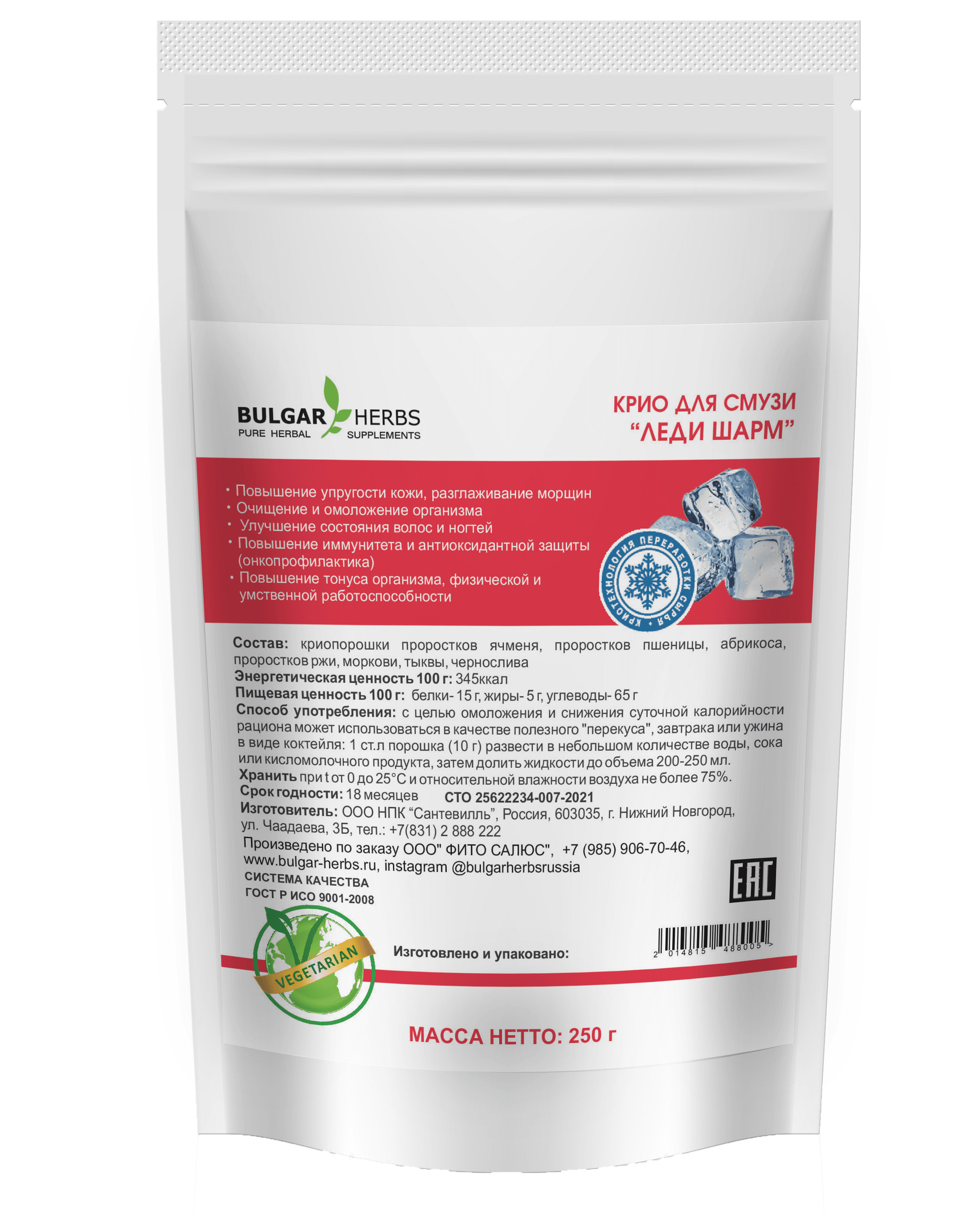 Леди Шарм" это криопорошок из проростков ячменя и проростков пшеницы, абрикоса, проростков ржи, моркови, тыквы, чернослива. Пророщенные зерна в составе "Леди Шарм"являются мощным стимулятором жизнедеятельности организма и полезнейшей едой, так как они:·