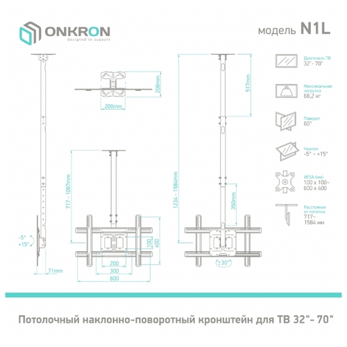 Дополнительная информацияугол наклона: -5° - +15°; угол поворота: 60°; вылет от потолка: 717-1584 мм; кабель-канал внутри кронштейна; материал: холоднокатаная сталь, SPCC class