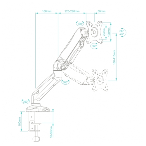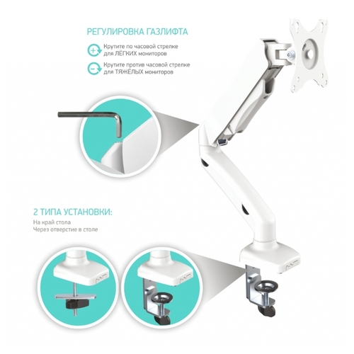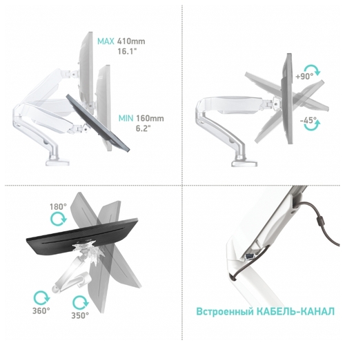 Дополнительная информацияугол поворота : 360°; угол наклона : -50° - +35°; максимальная нагрузка : 2-6;5 кг; вертикальное перемещение : 250 мм; расстояние от основания : 0-525 мм; ориентация экрана : портретная / альбомная; установка : на край стола / через отверстие в столе; каб
