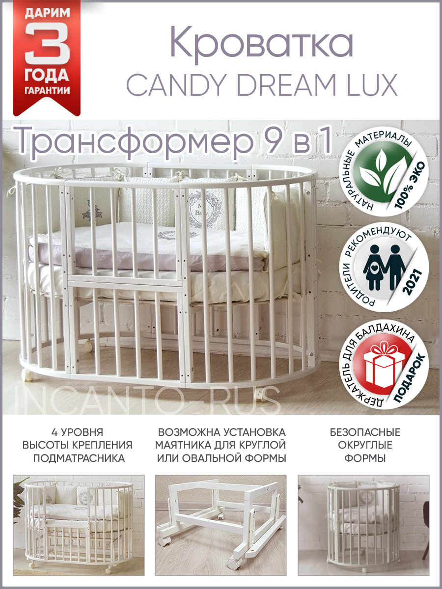 Детская кроватка-трансформер Candy Dream Lux 9в1 - удобная и эргономичная круглая-овальная кровать для детей от 0 до 5 лет.Изготовлена из экологически чистого материала - массива березы. Нет ни одного острого угла, все наружные и внутренние угловые элемен