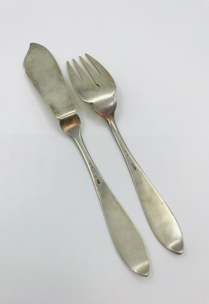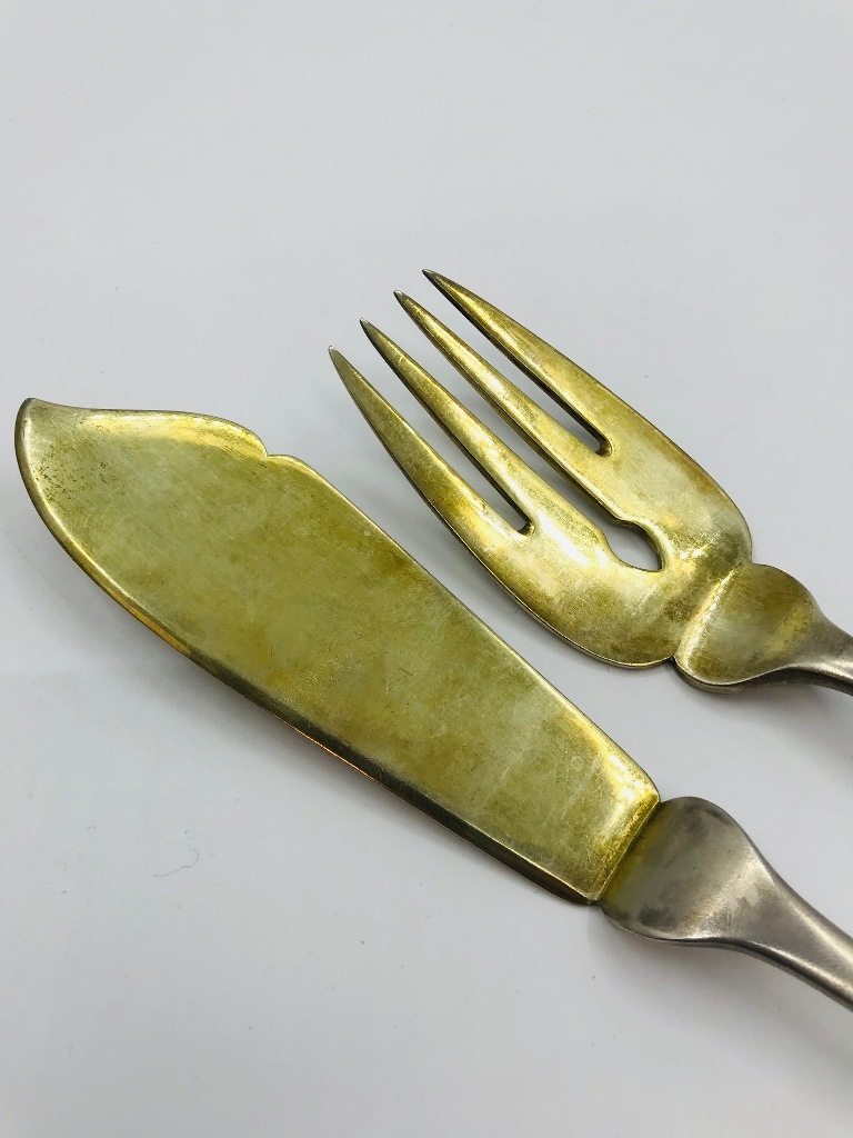 Крупный сервировочный набор: вилка и нож для подачи блюд.СССР, 2 половина 20 века.Серебро 875 пробы, литьё, золочение.Длина вилки - 25 см, длина ножа - 29,5 см.Вес - 275 грамм.