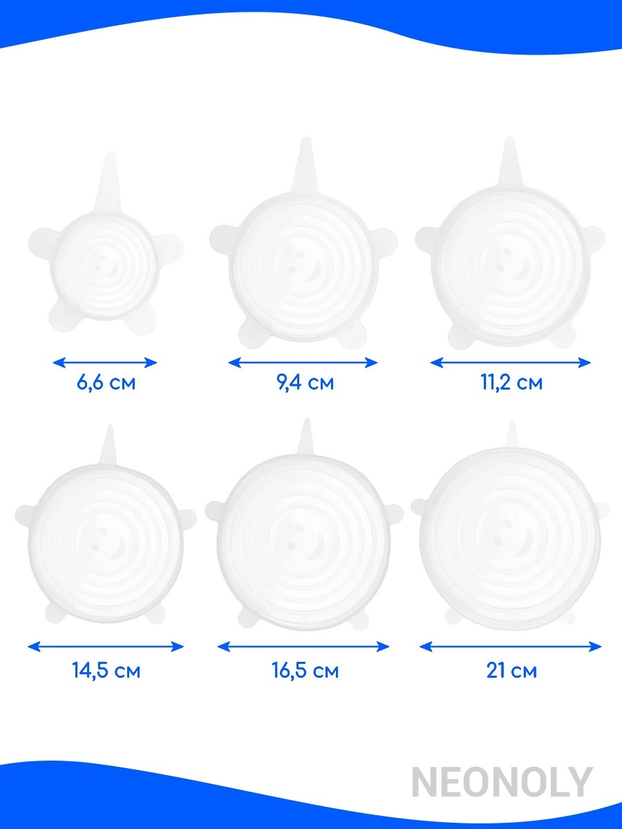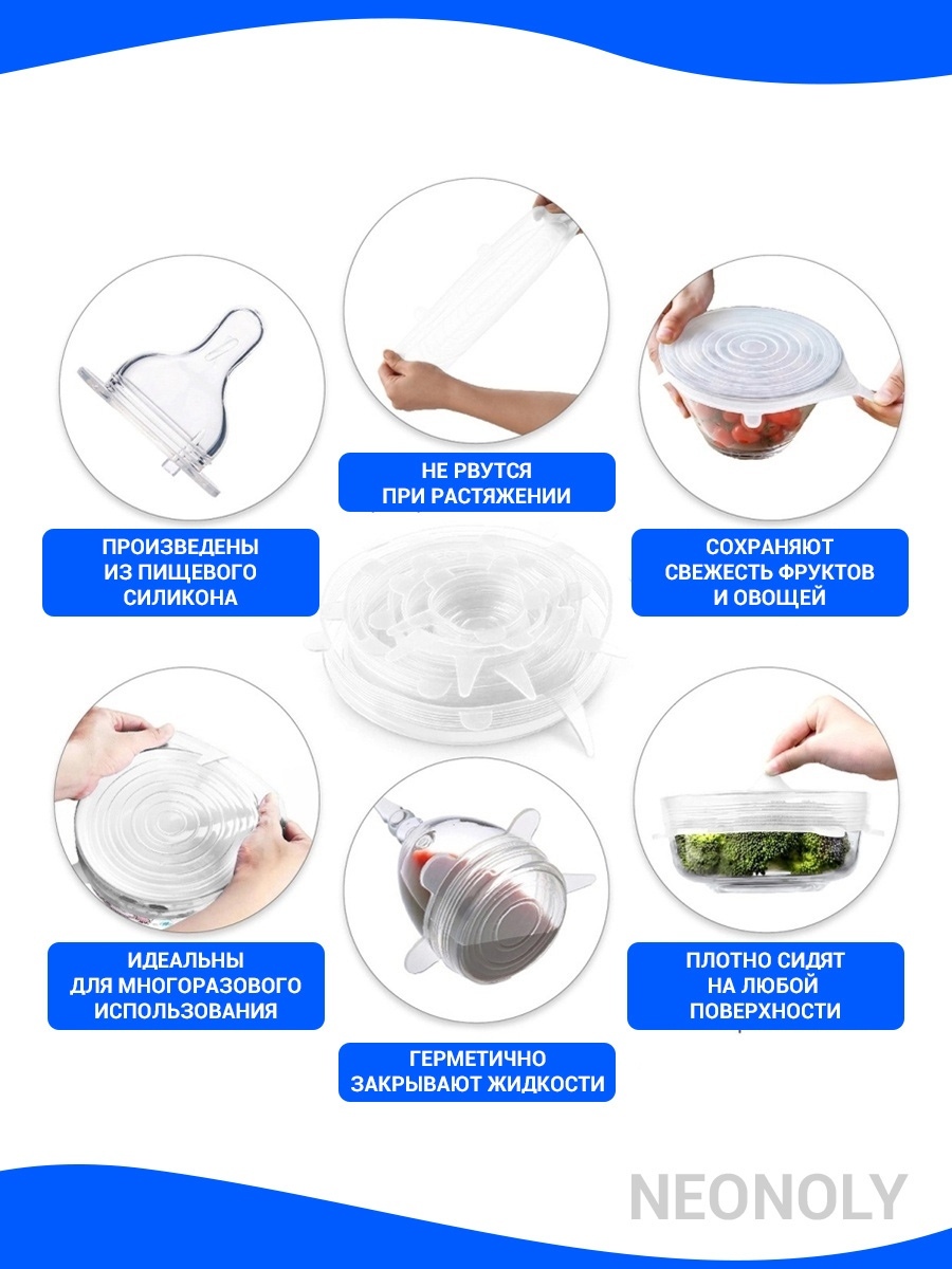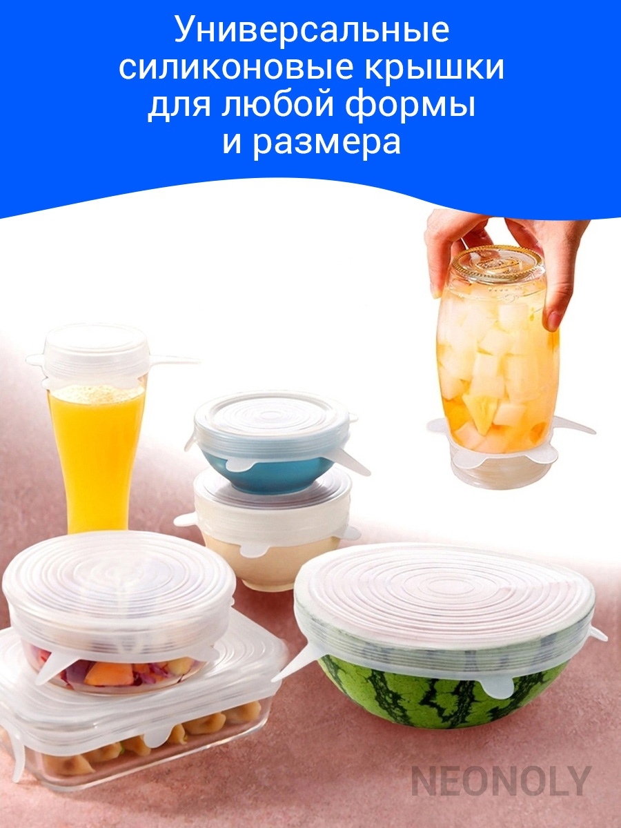 Комплектация:Набор крышек 6 штОписание:Умные силиконовые растягивающиеся крышки NEONOLY для тарелок, кастрюль, банок, контейнеров, а также на сами продукты, например, на половинку арбуза или дыни. Крышки прочные и эластичные, плотно прилегают к посуде или
