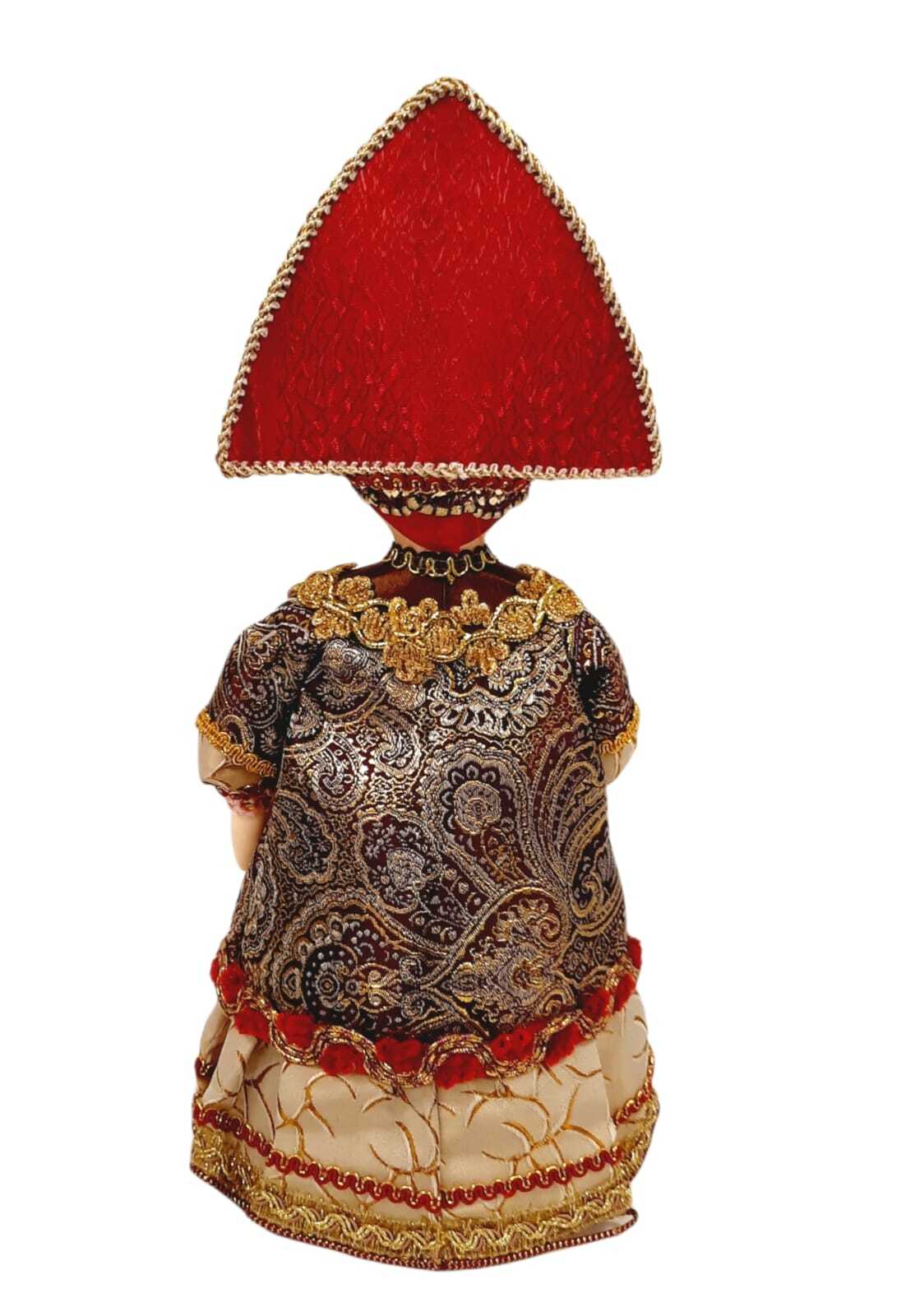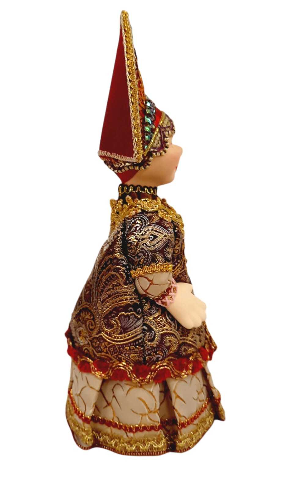 Золотое убранство и красивый кокошник – всё это является свидетельством изящества и неповторимости куклы «Царица». Несмотря на царскую возвышенность, выражение лица императорской особы доброжелательное и открытое. Стоит отметить красивый наряд у куклы. Зо