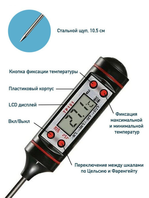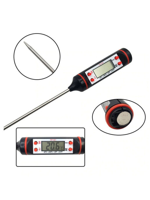Комплектация:Батарейки в комплекте; термощуп - 1штОписание:Это полезное устройство поможет Вам измерить температуру до десятой доли где угодно. Духовка, вода в ванной, холодильник и многие другие места как внутри дома, так и снаружи. Термометр щуп имеет ш