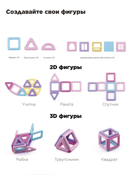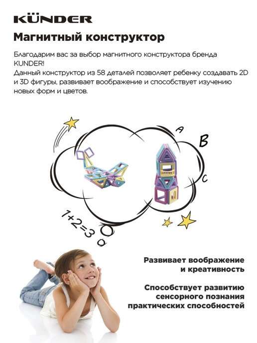 Новинка от бренда Kunder – развивающий магнитный конструктор, позволяющий создавать 2D и 3D фигуры. Набор состоит из 58 фигур: 12 квадратов, 18 треугольников, 14 полукругов и 14 декоративных деталей. Конструктор развивает мышление малыша, фантазию и знако