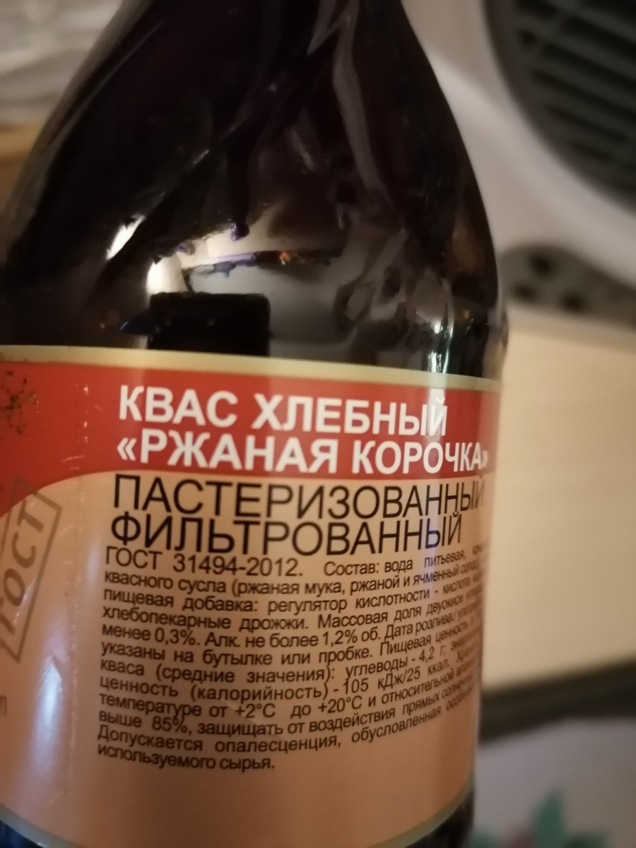 Условия хранения:Хранить при температуре от +2°С до +20°С и относительной влажности не выше 85%, защищать от воздействия прямых солнечных лучей.Состав:Вода питьевая, концентрат квасного сусла (ржаная мука, ржаной и ячменный солод), сахар, пищевая добав