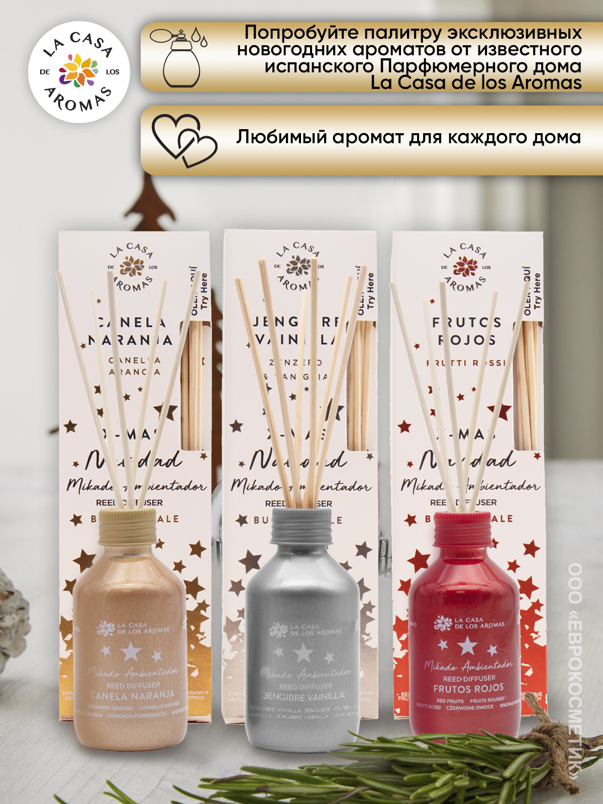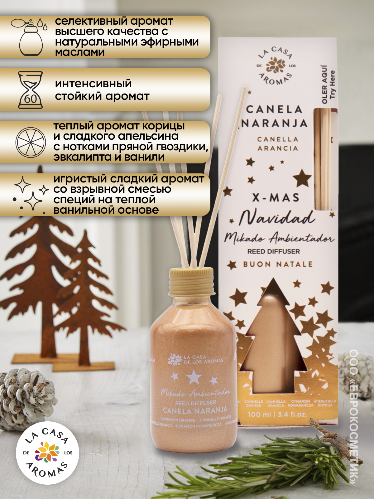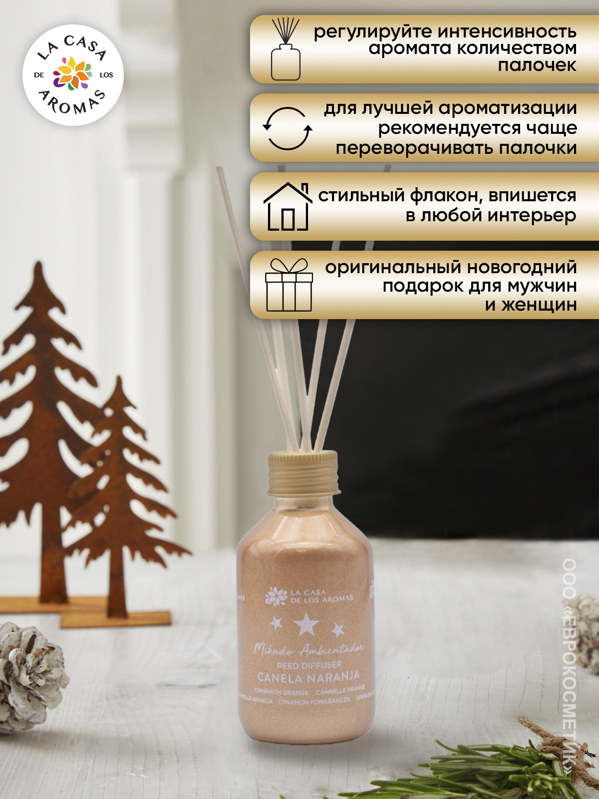 Ароматический диффузор из Новогодней коллекции "Апельсин и корица" от известного парфюмерного дома La Casa De Los Aromas, Испания. В комплекте - арома диффузор с парфюмерной композицией 100мл, 5 палочек из ротанга. Просто откройте флакон и опустите арома