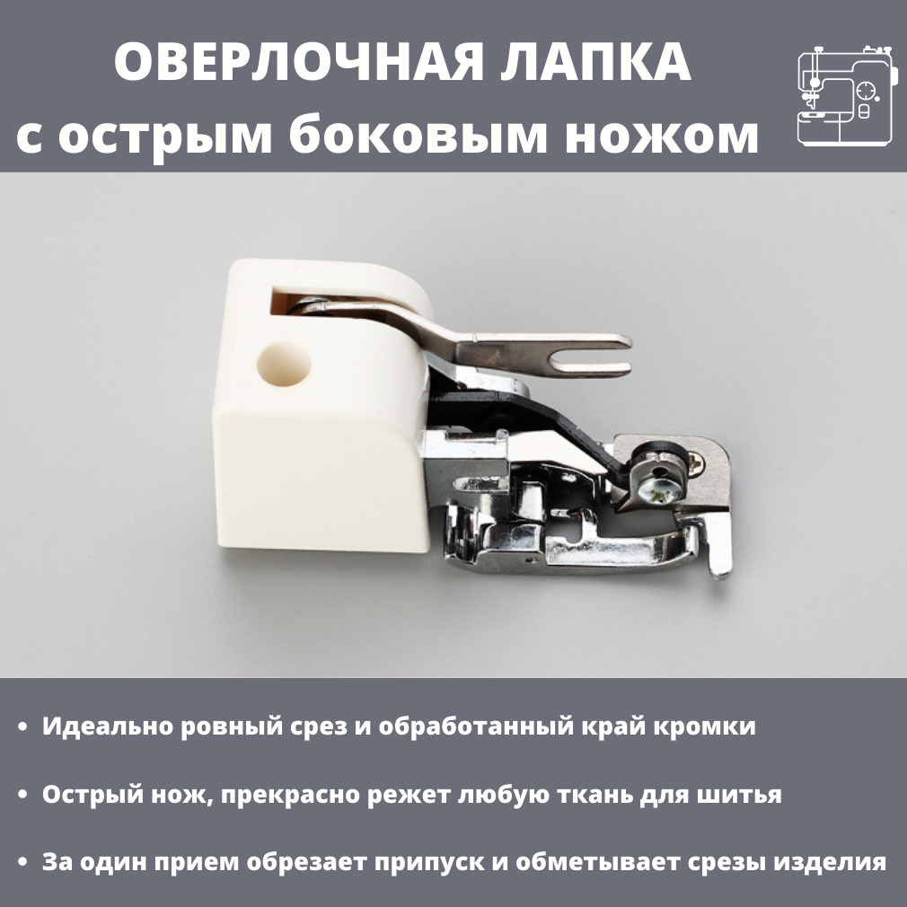 Список совместимых устройств:AstraLux, Minerva, Janome, Singer, Brother, Pfaff Hobby, Chayka New Wave, Bernina Bernette, Leader, JUKI, SEIKO,Aurora, New Home, Babylock, Elna, Comfort, Veritas NecchiКомплектация:Лапка оверлочная с ножом-1 шт.