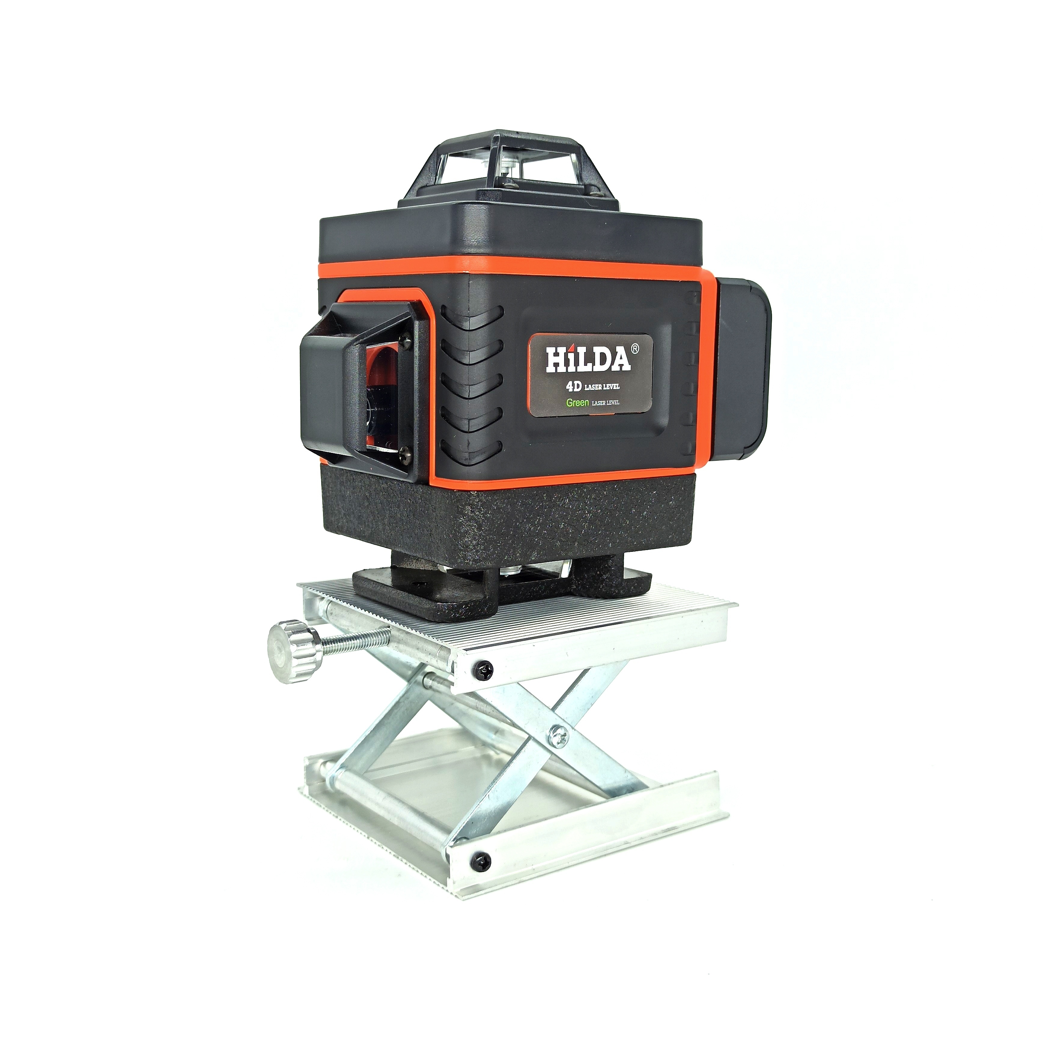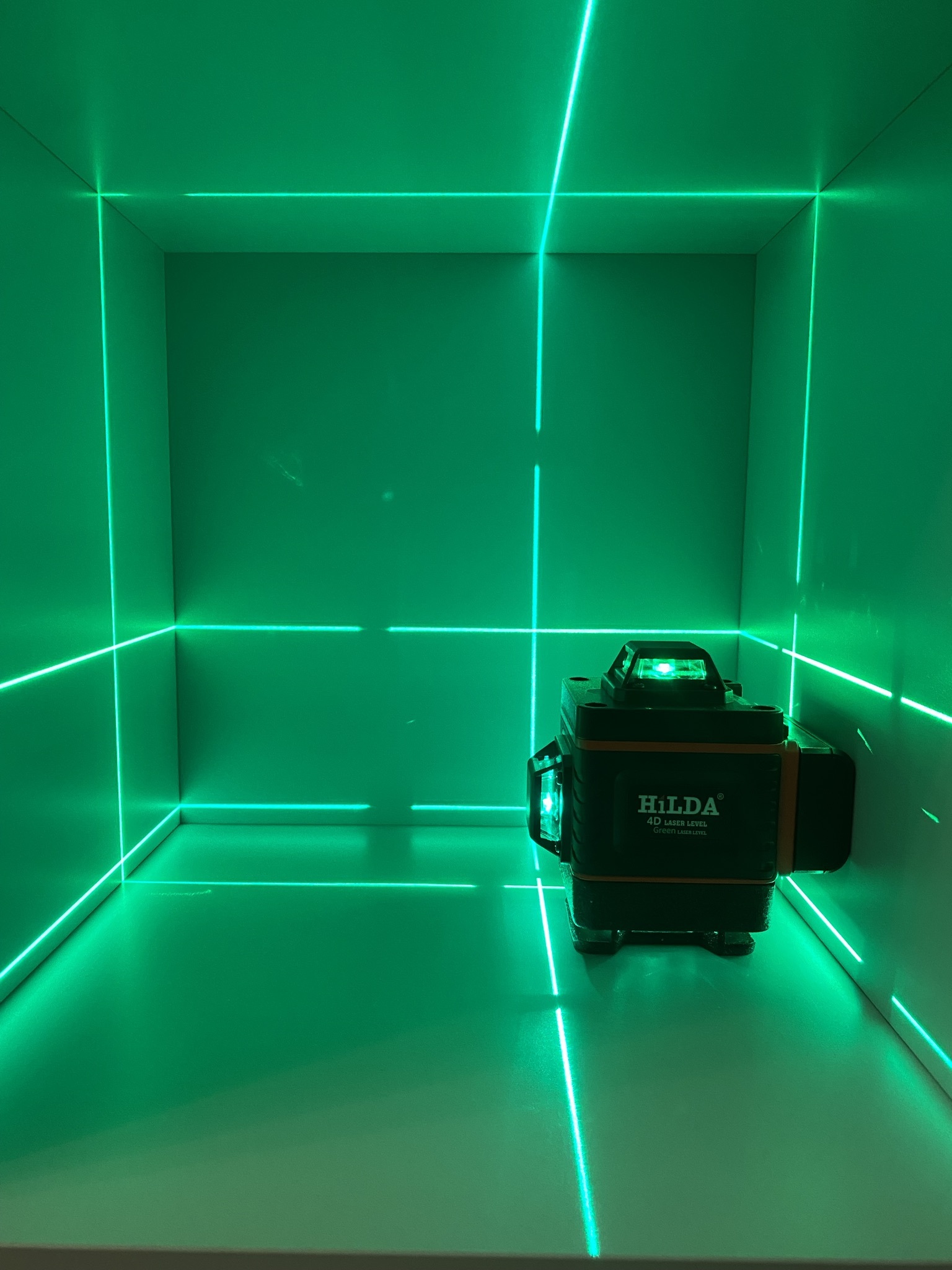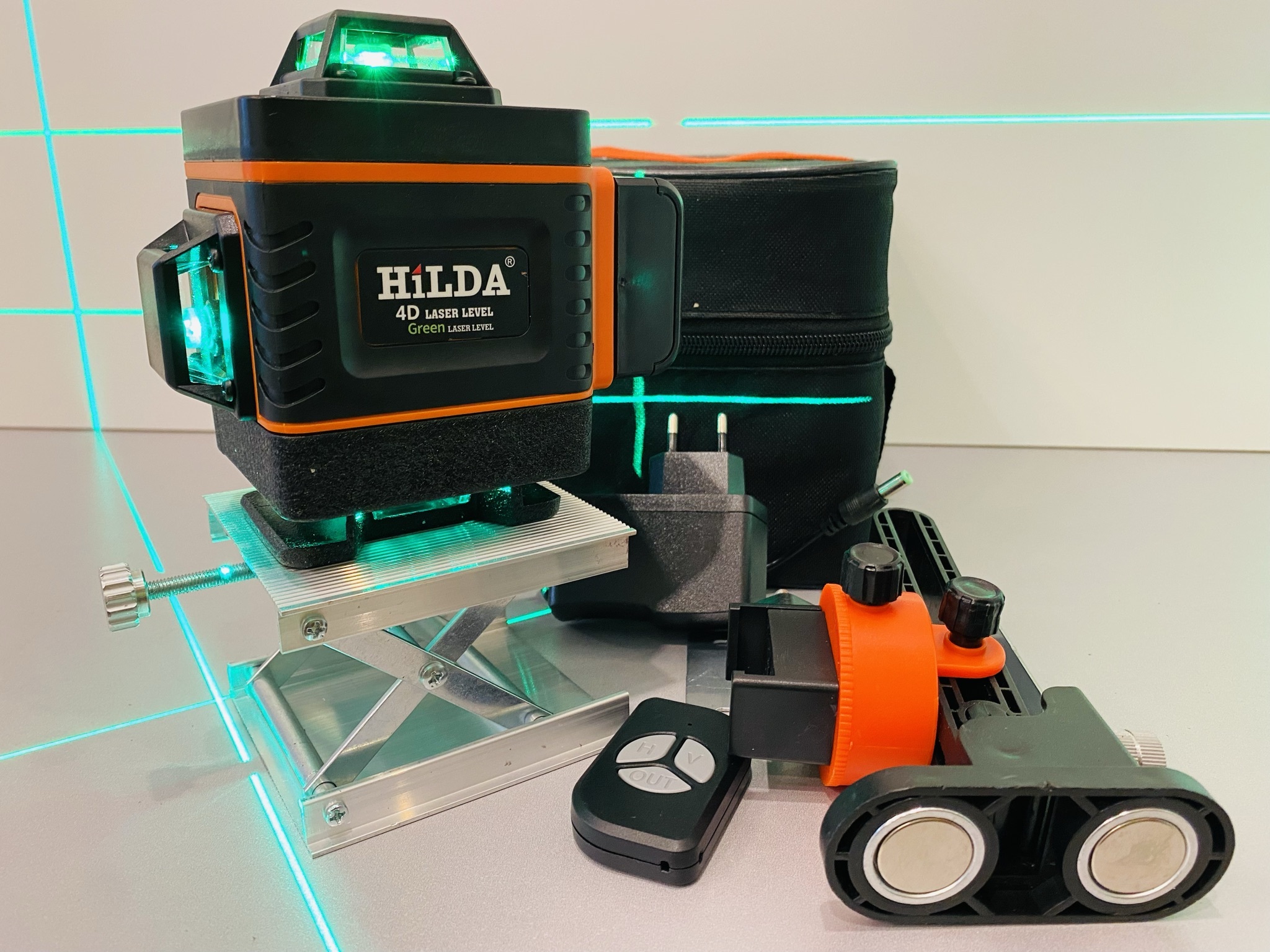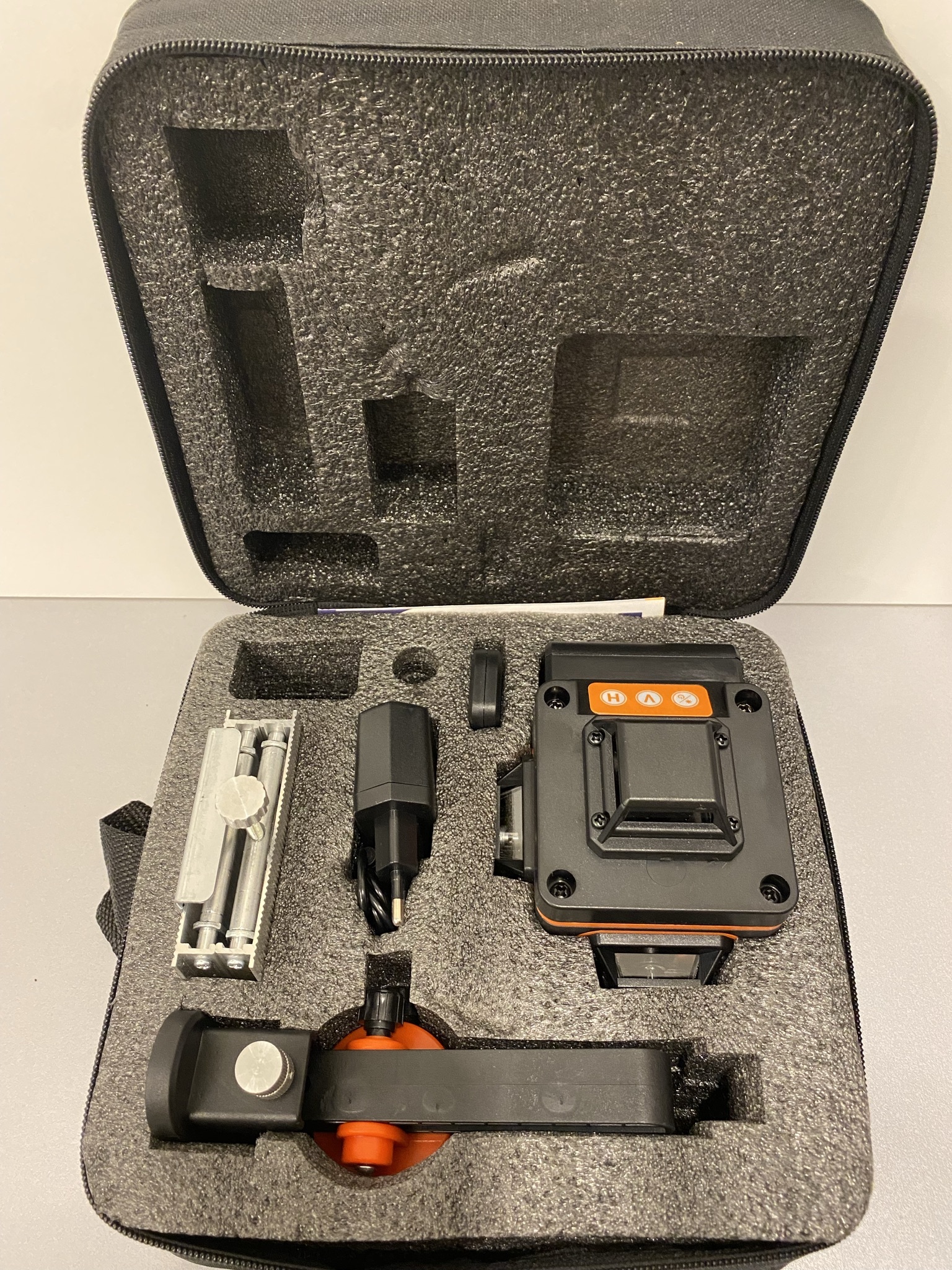 Комплектация:1.лазерный уровень, 2.магнитный кронштейн на стену с металлической пластиной, 3.пульт ДУ, 4.Li-ion съёмный аккумулятор, 5.алюминиевая лифт-платформа, 6.адаптер для настенного крепления, 7.зарядное устройство 220в, 8.прочная защитная кейс-сумк