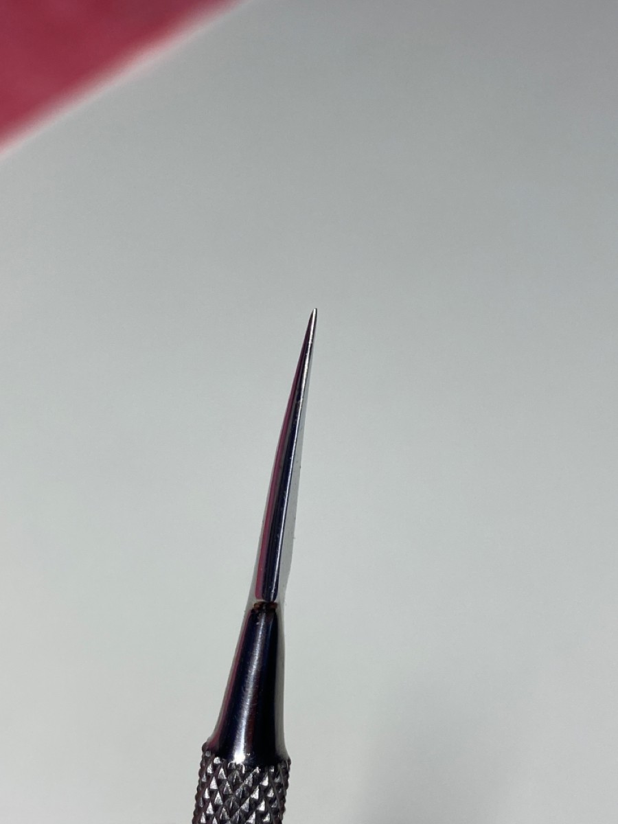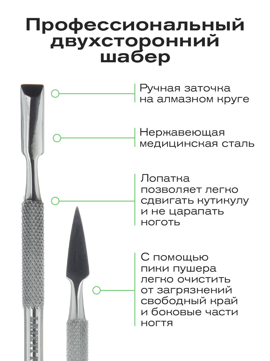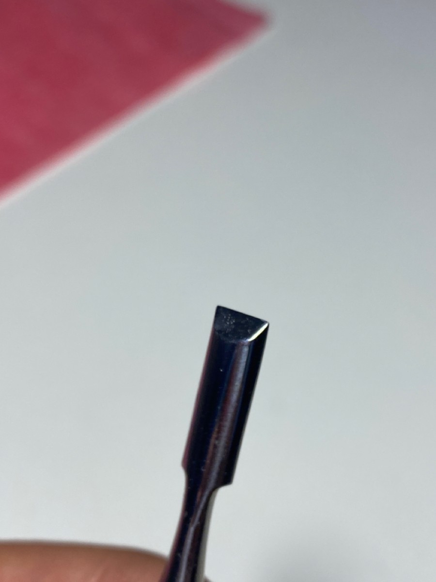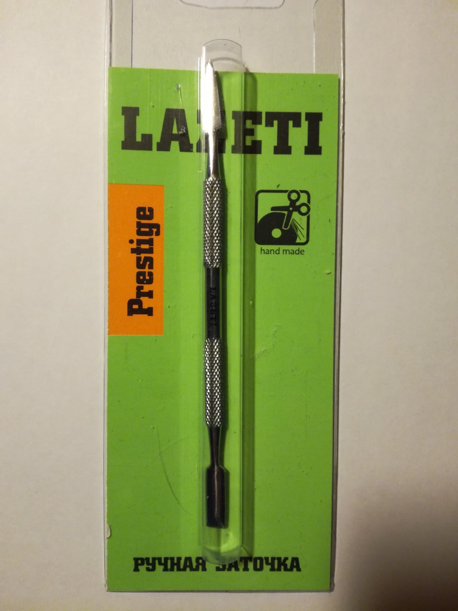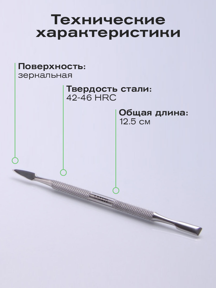 Двухсторонний пушер общей длиной 125 мм с плоской прямой лопаткой и пикой. Все рабочие части обработаны вручную. Лопатка имеет аккуратную симметричную форму, идеально отшлифована с внутренней стороны и истончена сверху, что позволяет легко сдвигать кутику