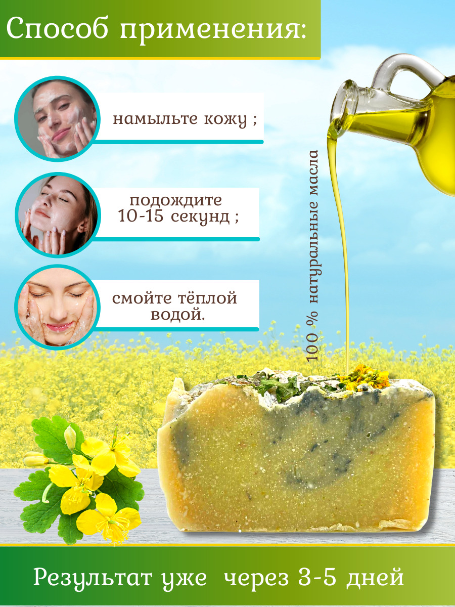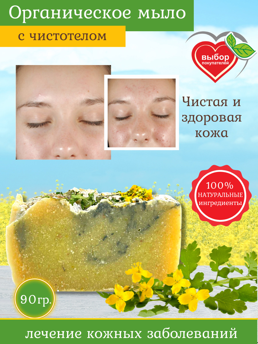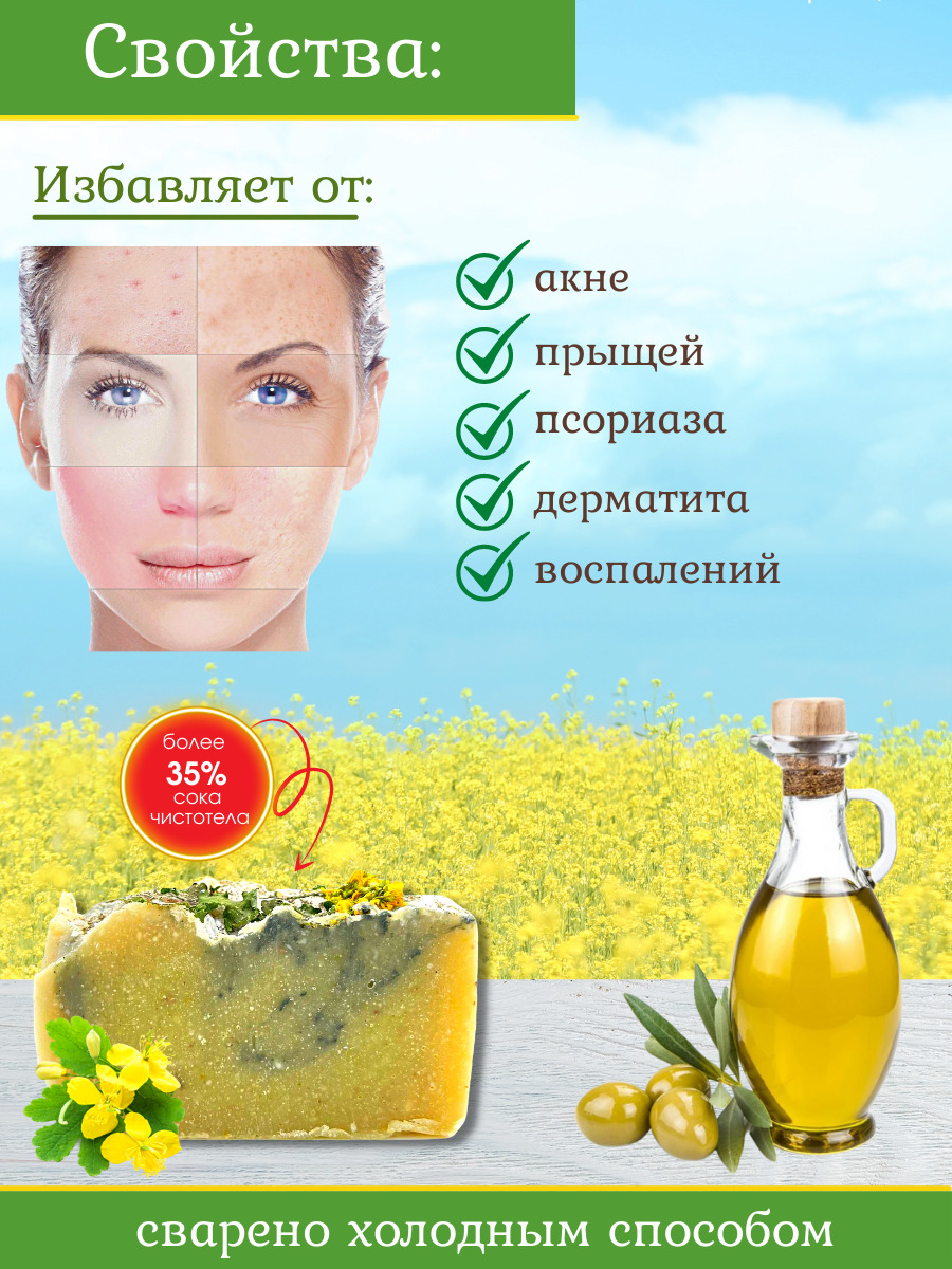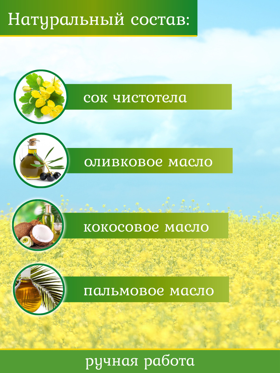 Состав:Сухоцветы чистотела, синяя глина, оливковое масло, пальмовое масло, кокосовое масло.Описание:Натуральное мыло с чистотелом - настоящее спасение при лечении мозолей, дерматита, псориаза, грибковых инфекций, гнойников, герпеса и других кожных заболев