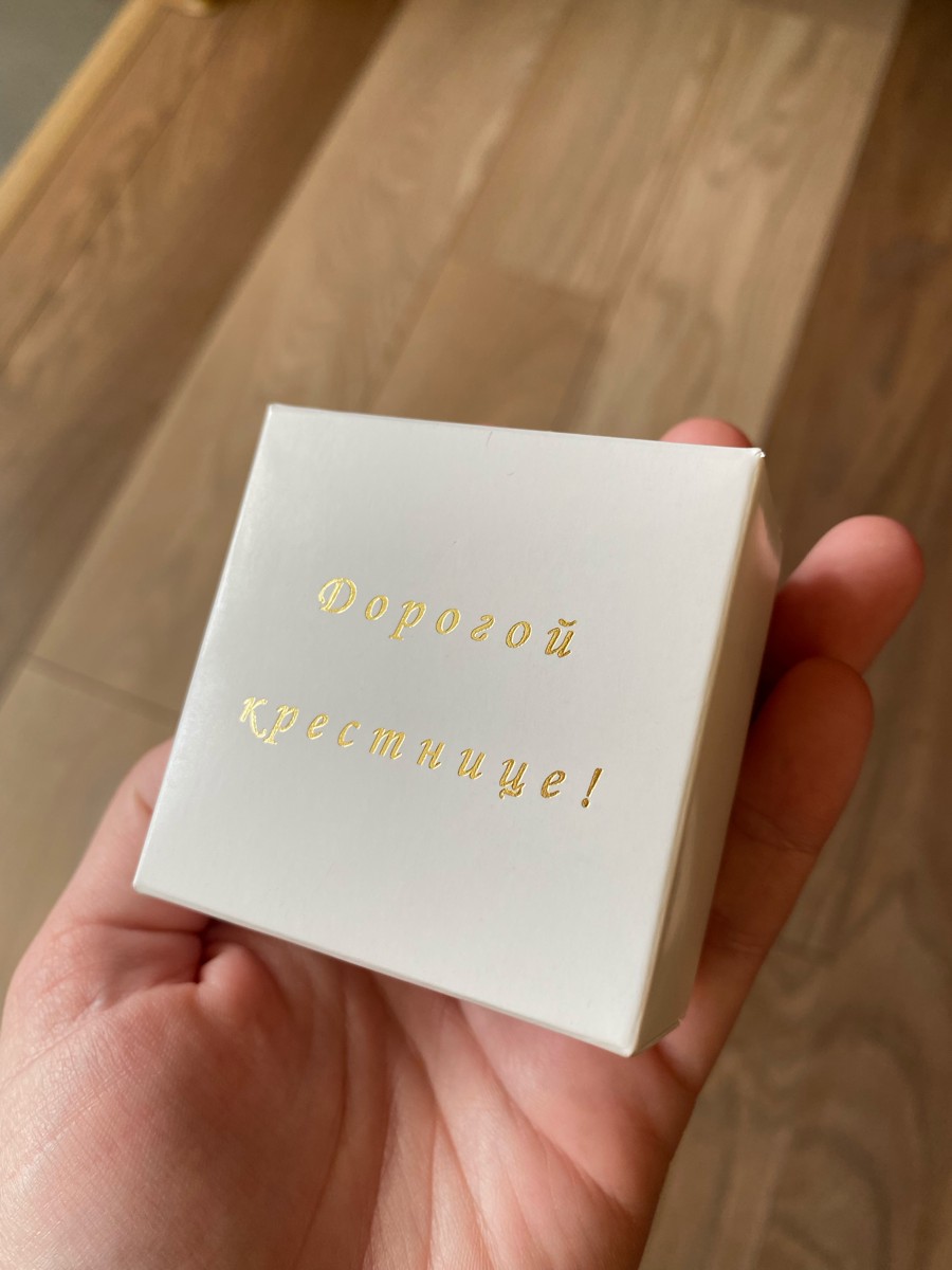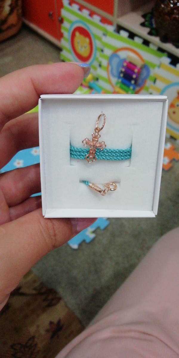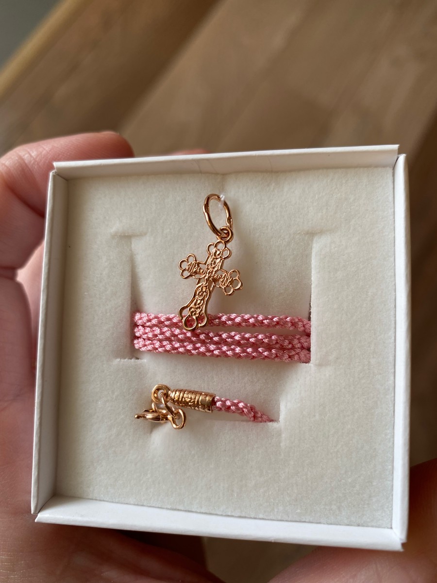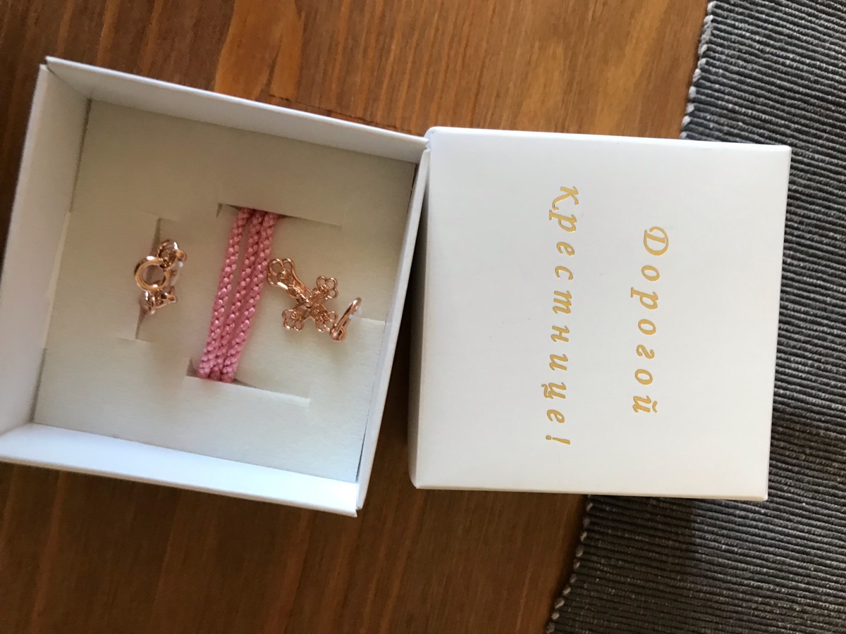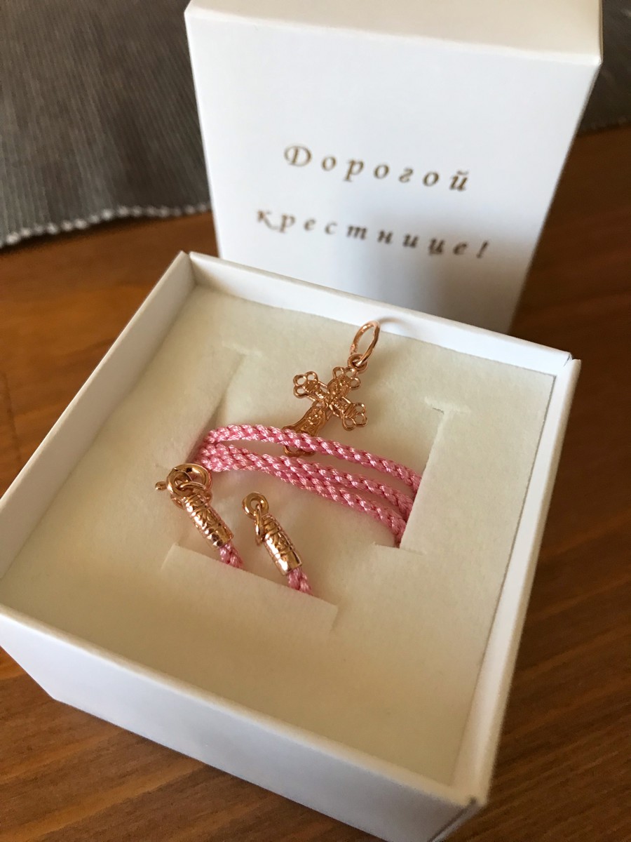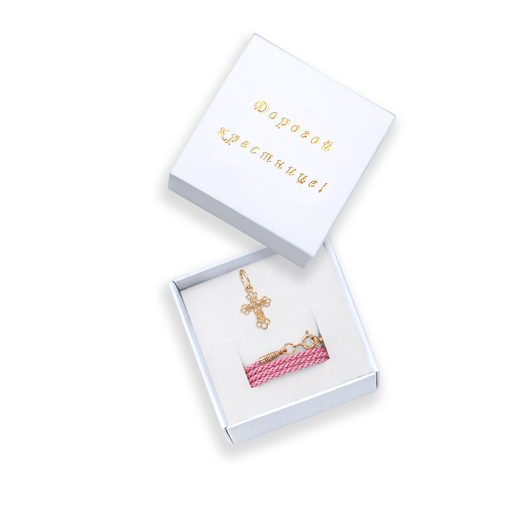 Набор для Крещения для девочки: золоченый крест (высота без колечка 1,8 см), гайтан с застежкой из серебра с золочением(длина 45 см), подарочная коробка с надписью золотым тиснением.Крестик выполнен в соответствии с канонами Русской Православной Церкви, О