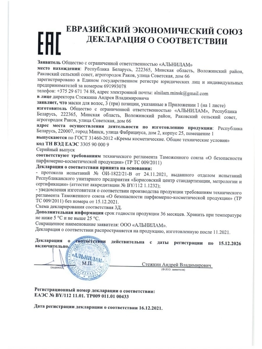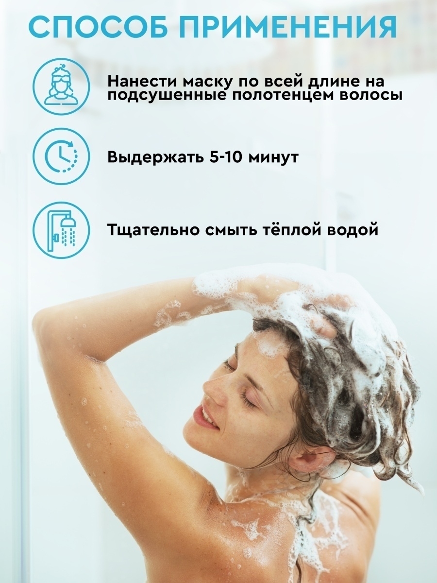 Способ применения:1) Нанесите маску на подсушенные волосы полотенцем волосы (Рекомендуется наносить маску в вертикальном положении головы протягивающими движениями по всей длине).2) Оставьте на 5-10 минут.3) Смойте теплой водой.Состав:Aqua, Сetearyl Alcoh