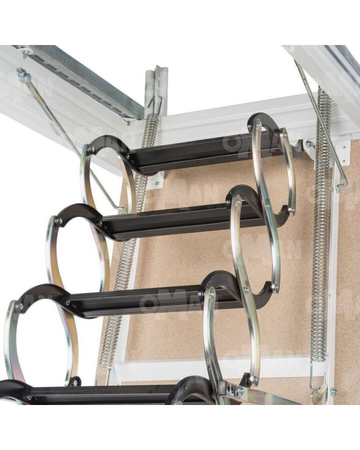 Раздвижная ножничная чердачная лестница. Крышка лестницы выполнена из ДСП древесного цвета. Короб металлический белого цвета. Все металлические элементы лестницы покрыты порошковой краской, ступени лестницы имеют антискользящие насечки. Деревянный стержен