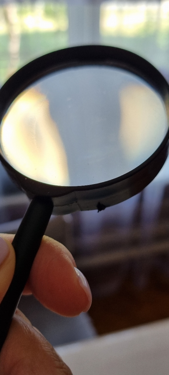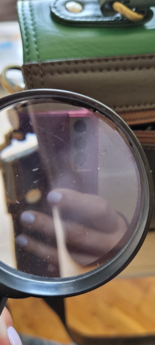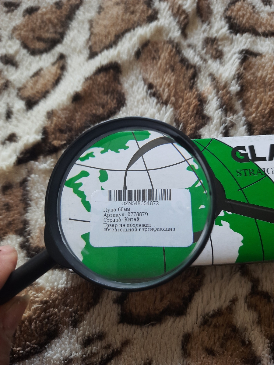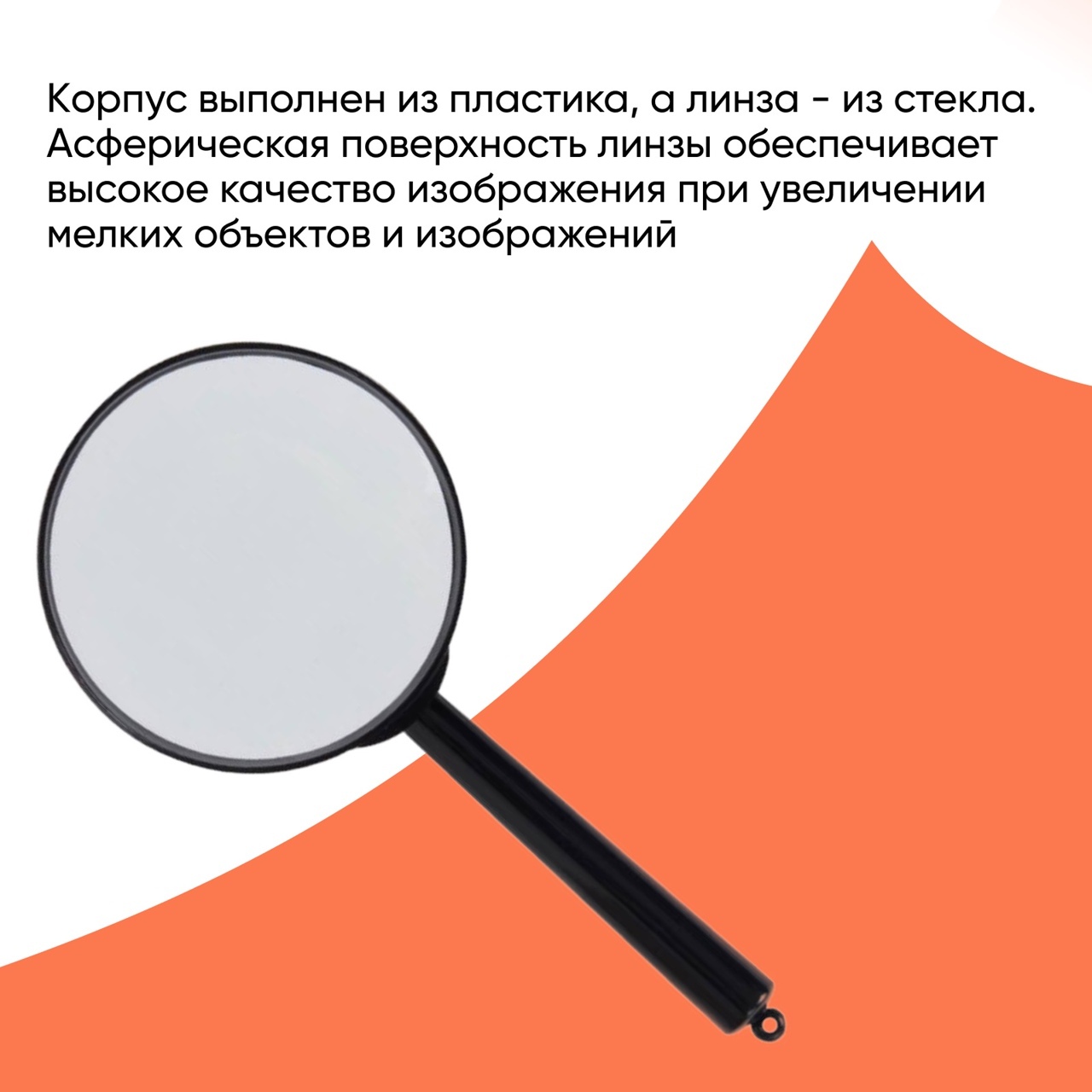 Корпус выполнен из пластика, а линза - из стекла. Асферическая поверхность линзы обеспечивает высокое качество изображения при увеличении мелких объектов и изображений. Диаметр линзы - 60 мм, производит шестикратное увеличение. Оправа лупы выступает за кр