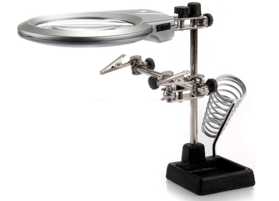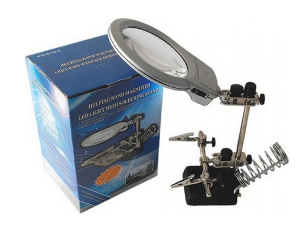 Держатель "третья рука" MG16129-A с подставкой под паяльник и лупой х2.5 с LED подсветкой MG16129-A служит главным образом при проведении паяльно-сборочных работ в электронике, ювелирном деле, сборке и ремонте для зажима мелких деталей в любом нужном поло