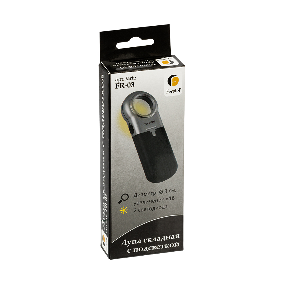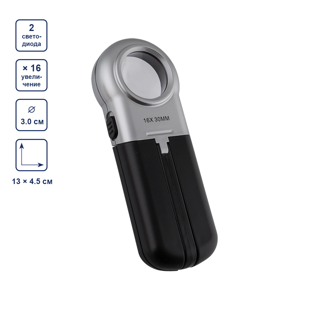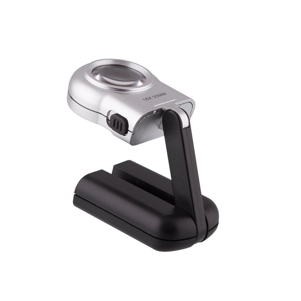 Складная лупа имеет высокую кратность - Х16, диаметр линзы - 3 см. Она удобна в работе с предметами маленьких размеров: для изучения страз, огранки камней, банкнот и марок. Корпус лупы, трансформируясь, может принимать форму ручки и подставки, которую мож